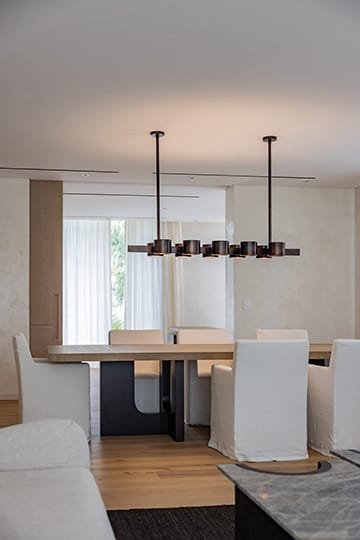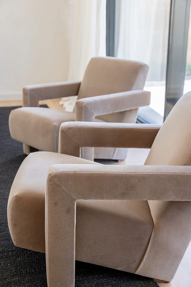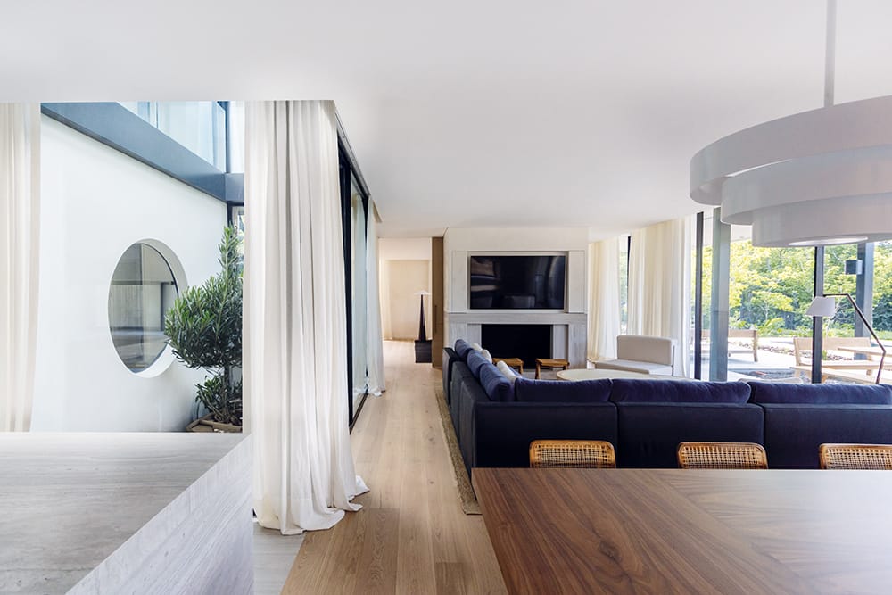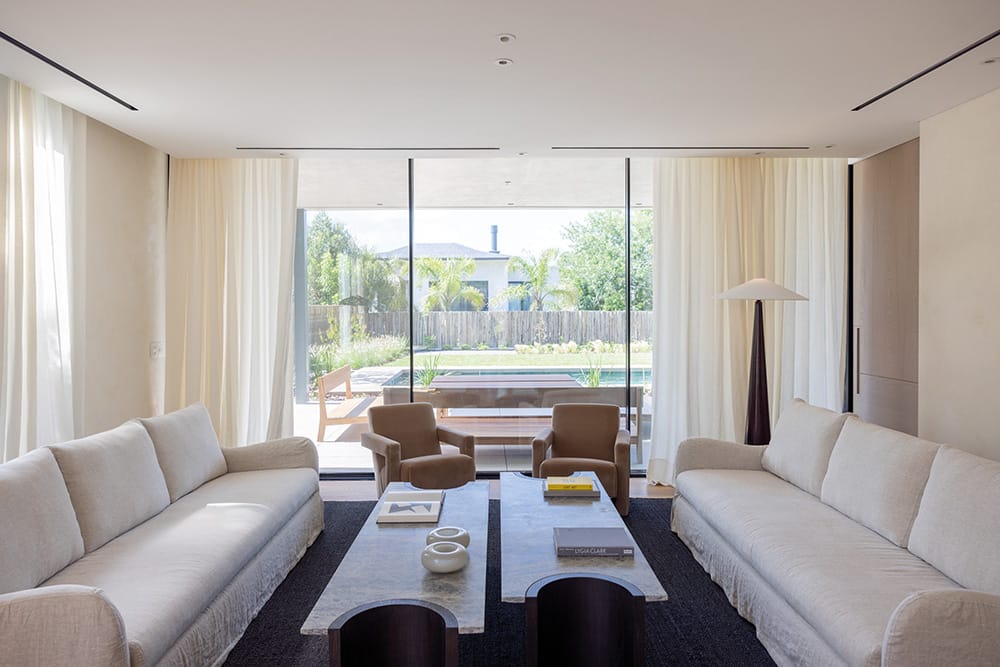 La sencillez del diseño no sacrifica la funcionalidad, permitiendo que el espacio se perciba siempre abierto y fluido. Un segundo estar, pensado para momentos de mayor intimidad o relax, sigue el mismo lenguaje de diseño. Dos sofás en tonos Pantone claros, enfrentados entre sí, establecen una disposición equilibrada, mientras que dos piezas de mármol verticales sobre una estructura de madera añaden una sensación de verticalidad que eleva la percepción del espacio. Estos elementos se integran a la perfección con el gran ventanal que abre el espacio hacia el jardín, reforzando el vínculo entre el interior y el exterior. Una lámpara de pie cónica en tono pecan aporta una nota de calidez y rompe con la linealidad del esquema vertical, aportando profundidad y dinamismo al ambiente.