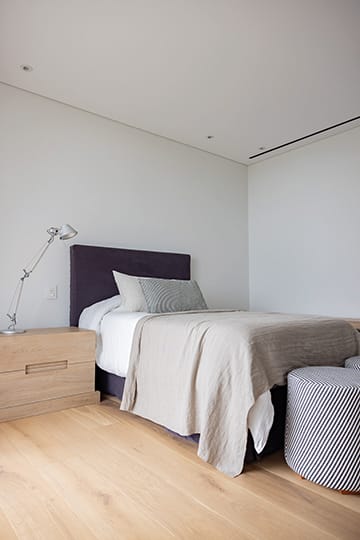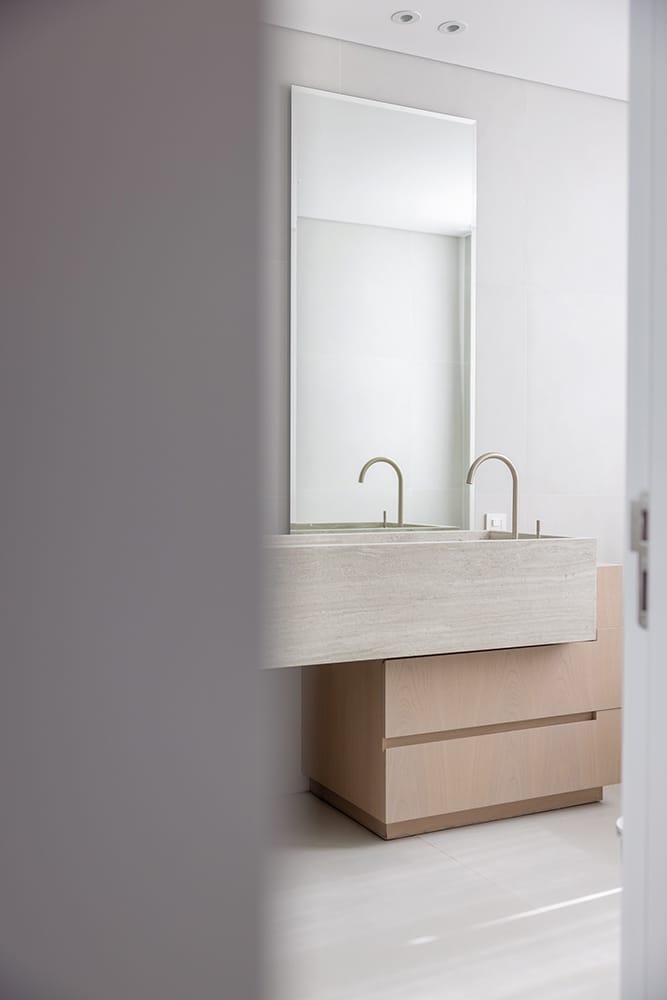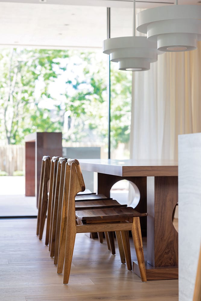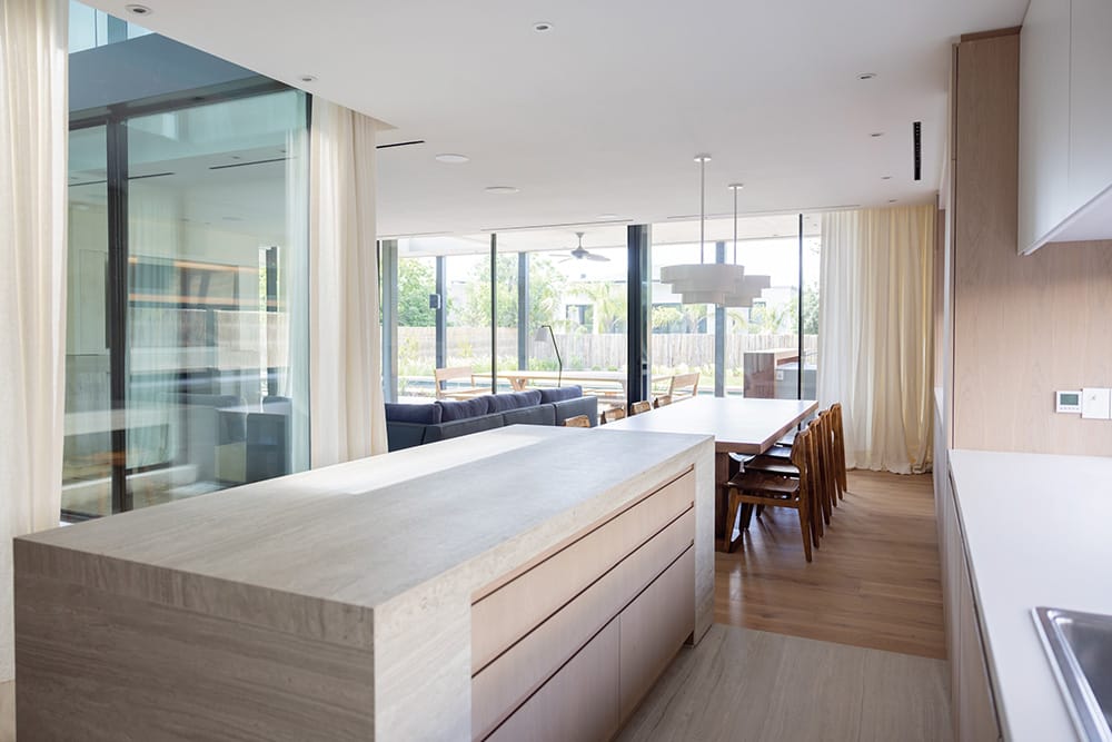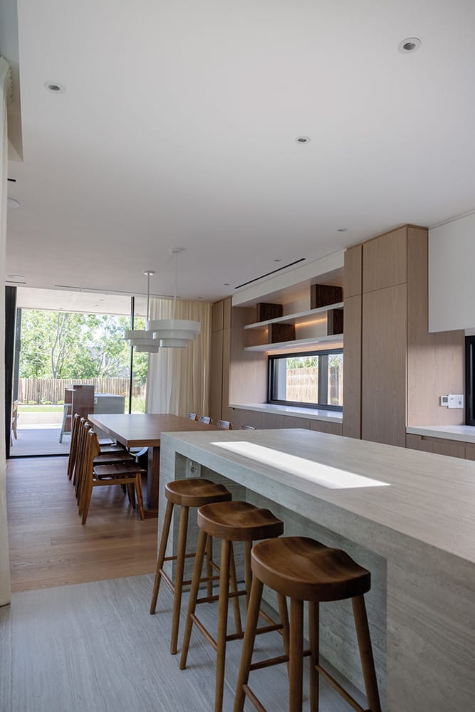 La cocina, por su parte, fue diseñada con una mirada tanto práctica como estética. Una gran isla revestida en cuarzo gris suave domina el centro, acompañada de bancos de madera que se alinean con el estilo vanguardista de la casa. Este espacio, concebido como el corazón funcional del hogar, no solo es un lugar para cocinar, sino también un punto de encuentro familiar, con un comedor diario integrado que, a través de una amplia abertura, conecta de forma natural con el jardín exterior. Este diseño permite una interacción fluida entre interior y exterior, fortaleciendo la idea de una casa abierta y conectada con su entorno. Los dormitorios mantienen la coherencia estilística de toda la casa.