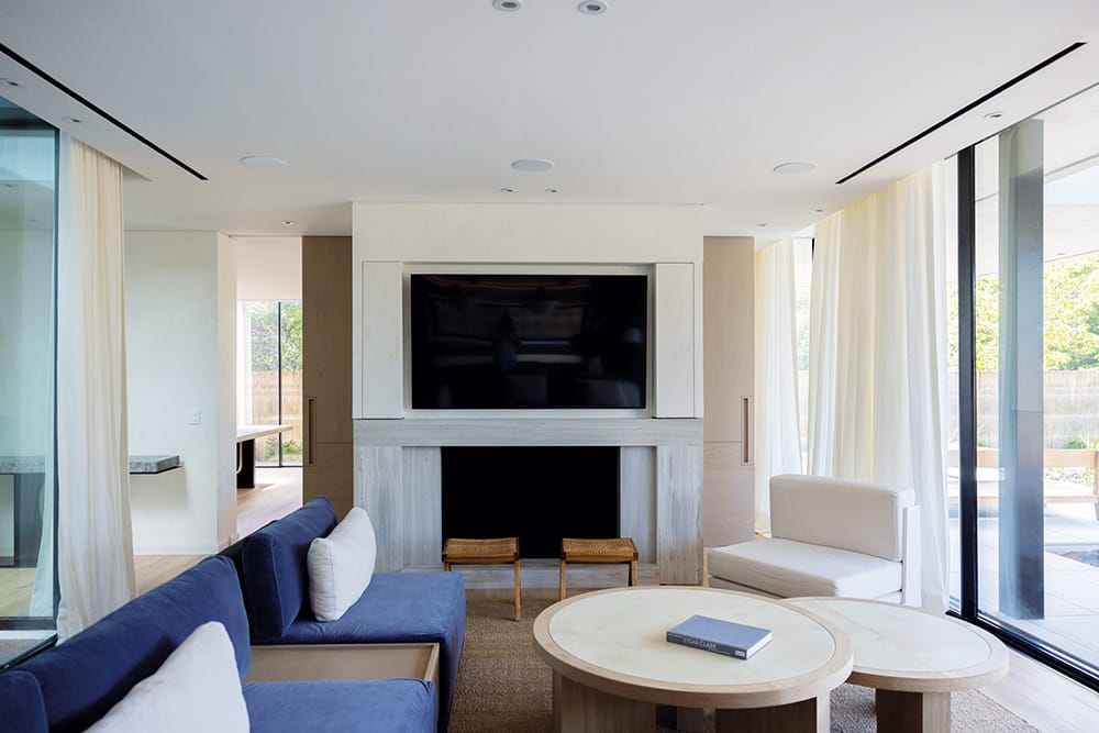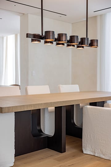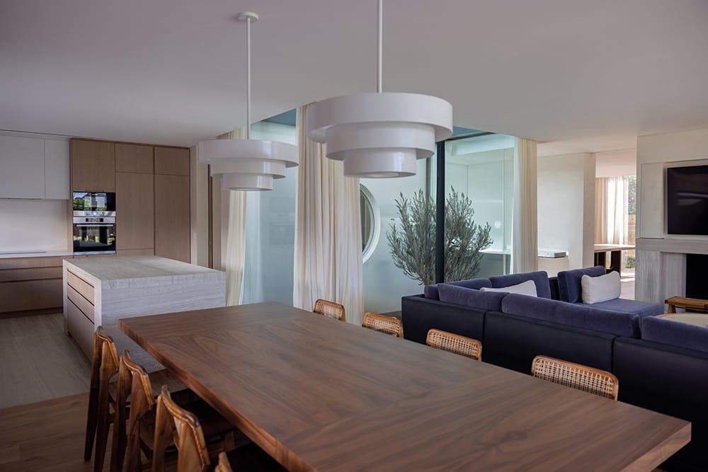 El diseño del living comedor destaca por su espacialidad fluida, donde las texturas naturales toman protagonismo. La madera, presente tanto en el suelo como en los muebles, aporta una calidez envolvente, mientras que un hogar revestido en piedra gris suave se ofrece como el centro de atención del ambiente. Este elemento, además de cumplir su función, actúa como un articulador visual, dividiendo el espacio de manera equilibrada. Frente a él, una gran rinconera de azul noche introduce un toque de audacia y color, complementada por una butaca de tela blanca que suaviza la escena. La mesa baja de centro, también de madera, completa un conjunto que invita a la convivencia en un espacio armónico, donde cada pieza parece estar en su lugar por una razón estética y funcional. La continuidad del espacio se refleja en el comedor, donde una larga mesa de madera actúa como eje principal. La disposición minimalista, pero con gran personalidad, otorga al ambiente una atmósfera cálida y acogedora.