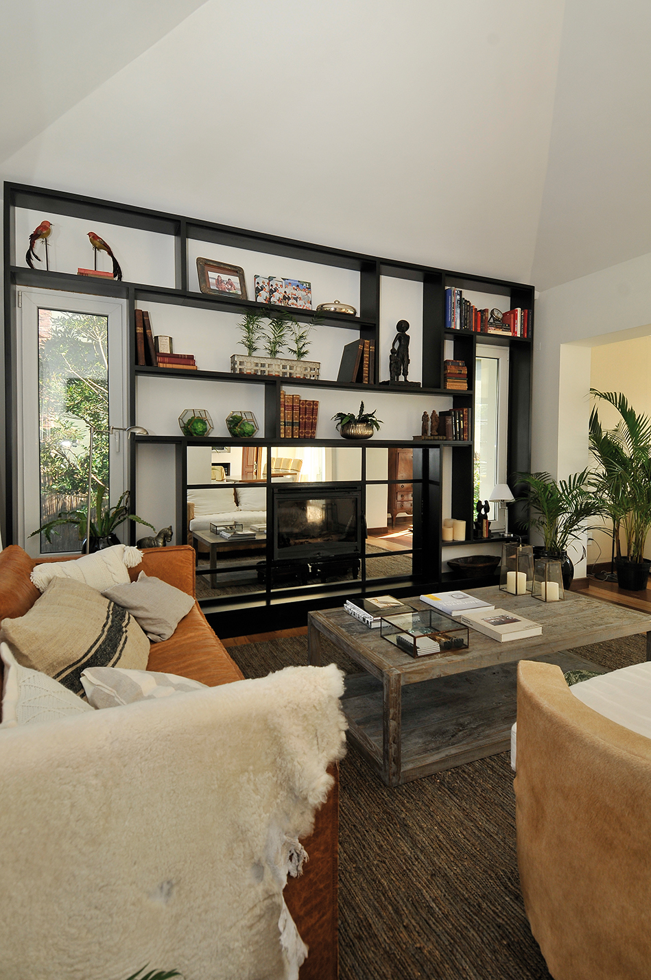 Cada uno de los ejemplos abraza una gran biblioteca, diseñada a medida para cada cliente, que roba el protagonismo de sus espacios. En el primero, está realizada en color negro, contrastando de manera evidente con la pared y los muebles claros, y además aludiendo al ventanal compartimentado que se puede apreciar en la habitación continua. En los otros ejemplos, la biblioteca fue creada en colores claros, y la protagonista pasa a ser su luz interior que permite el destaque de las piezas que la visten.