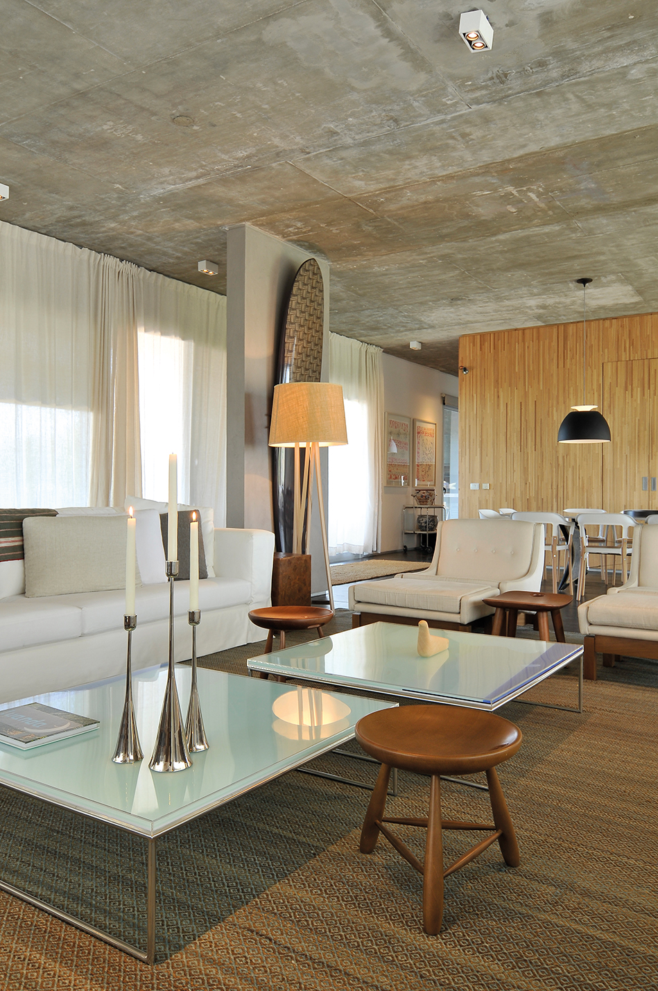 Los paneles de Heloisa Crocco, los muebles de Ilse Lang editados por Faro Design, las singulares piezas en cartón reciclado de Domingos Totora y los sofás italianos y las alfombras “trappos y Fiapos” de fibras naturales y algodón pintado, subrayan la impronta de Joseane, una diseñadora que promueve y exalta el trabajo de los más talentosos diseñadores internacionales. Los espacios interiores de esta casa, metro a metro, enseñan un concepto singular que es el mismo que Joseane Sturmer despliega en todas sus intervenciones. Color, texturas, simplicidad y diseño. A partir de esas claves los ambientes contienen a los habitantes interpretando gustos, necesidades. Es el caso de la barra que demarca el espacio para la cocina. Un par de encantadoras luminarias “Bossa” de Fernando Prado señalan al lugar, prestan la función pero al mismo tiempo asignan el carácter de ese espacio que recibe la luz natural desde los grandes ventanales que establecen el perímetro estructural de la planta baja,