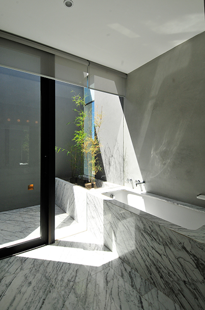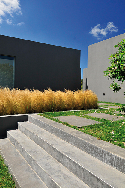 Líneas rectas y color gris grafito generan el ingreso a la vivienda mediante un interesante juego de desfasaje de los muros exteriores, que permite así filtrar la mirada de los curiosos que pasean por el lugar. Una vez dentro nos recibe un magnífico patio que conduce a diferentes áreas de la casa. La vivienda se ha estructurado en dos bloques conectados a través del jardín, donde se encuentran la barbacoa y la piscina. El primer bloque cuenta con el área social y las habitaciones para huéspedes. El segundo está formado por dos plantas, planta baja con gimnasio, sauna y un pequeño cine, mientras que en planta alta se ubica la suite principal, que cuenta con su propia terraza con vista al lago y al resto del barrio. Los techos altos de la vivienda y la luminosidad de la misma son puntos a destacar. Se ha abierto un patio en cada habitación, que se convierte en una fuente propia de luz natural y permite observar el paisaje que rodea el lugar. Salón, comedor y cocina con grandes ventanales hacia ambos lados, permiten una trasparencia total hacia el jardín y el lago. La piscina, diseñada con borde infinito, está conectada directamente con el jardín interior y el parrillero. Dentro de ella da la sensación que está suspendida en el aire y, gracias a su estratégica ubicación, se pueden tener vistas a toda la casa y el entorno.