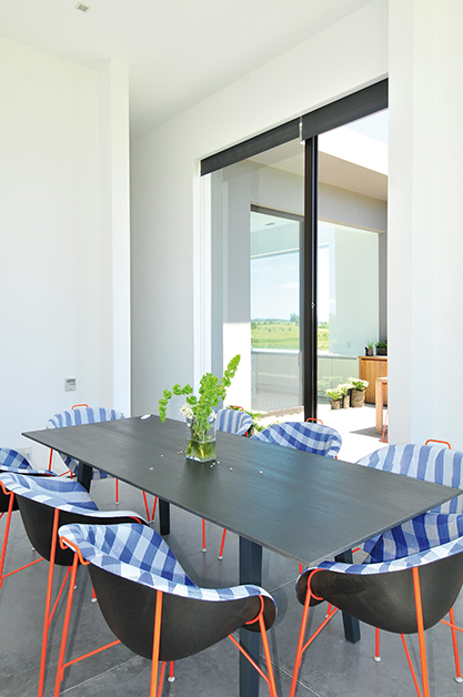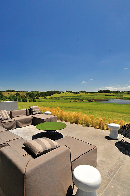 El diseño de El Zorzal acompaña el movimiento natural que propone la geografía del lugar. La arquitecta Stephania Kallos nos comenta: «No era simplemente plantar una casa convencional en el terreno sino mezclarse con el paisaje, obedecerle, responderle al viento sur con una pared o ensanchar al máximo el ventanal cuando lo que más importa en ese ángulo es la vista».