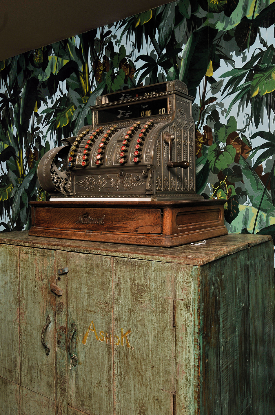El empapelado de Sophie se apodera del estar, en el subsuelo, generando un ambiente acogedor y cómodo. La máquina registradora antigua conseguida en un remate destaca sobre un aparador antiguo de Fez, patinado en verde. Enfrentado, como si se tratase de un túnel del tiempo, otro aparador, esta vez de madera natural y chapa, sostiene un telar y una máscara africana.
