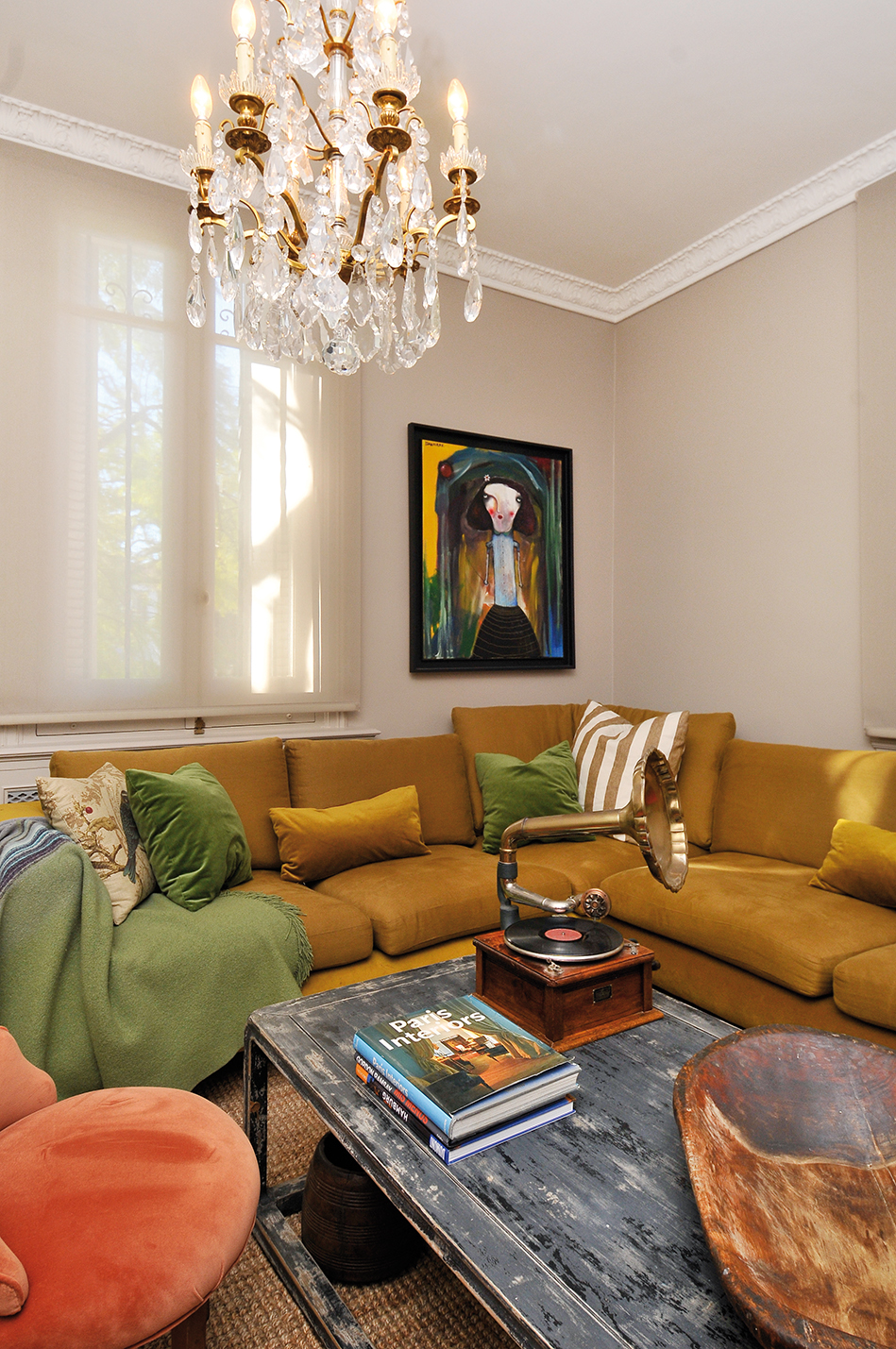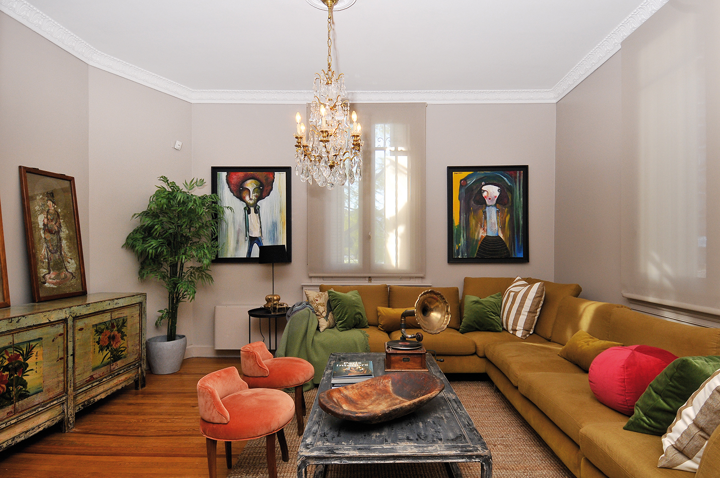 El empapelado de Sophie se apodera del estar, en el subsuelo, generando un ambiente acogedor y cómodo. La máquina registradora antigua conseguida en un remate destaca sobre un aparador antiguo de Fez, patinado en verde. Enfrentado, como si se tratase de un túnel del tiempo, otro aparador, esta vez de madera natural y chapa, sostiene un telar y una máscara africana.