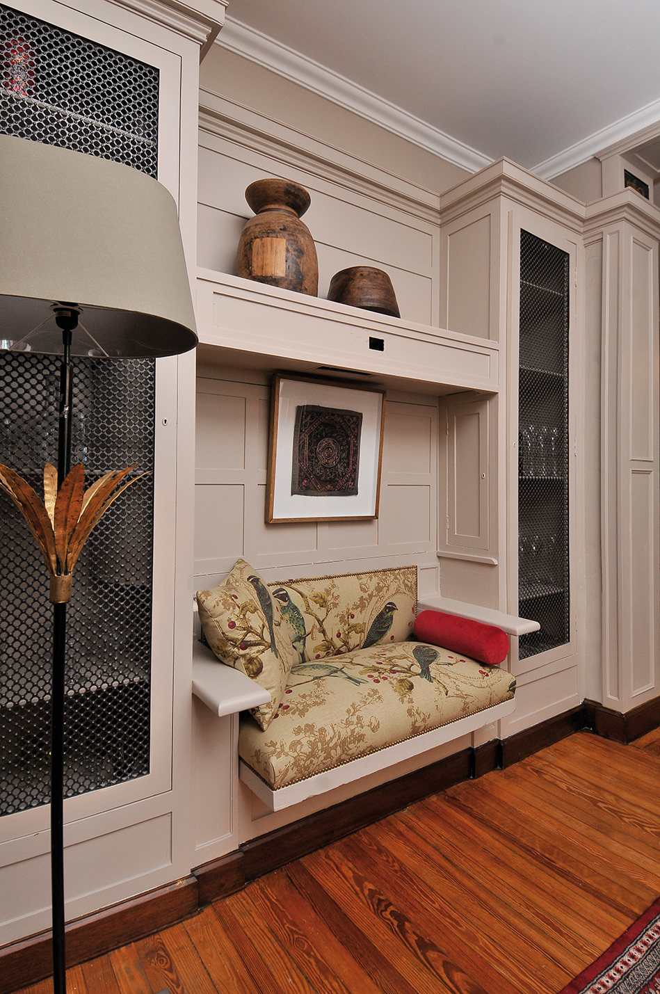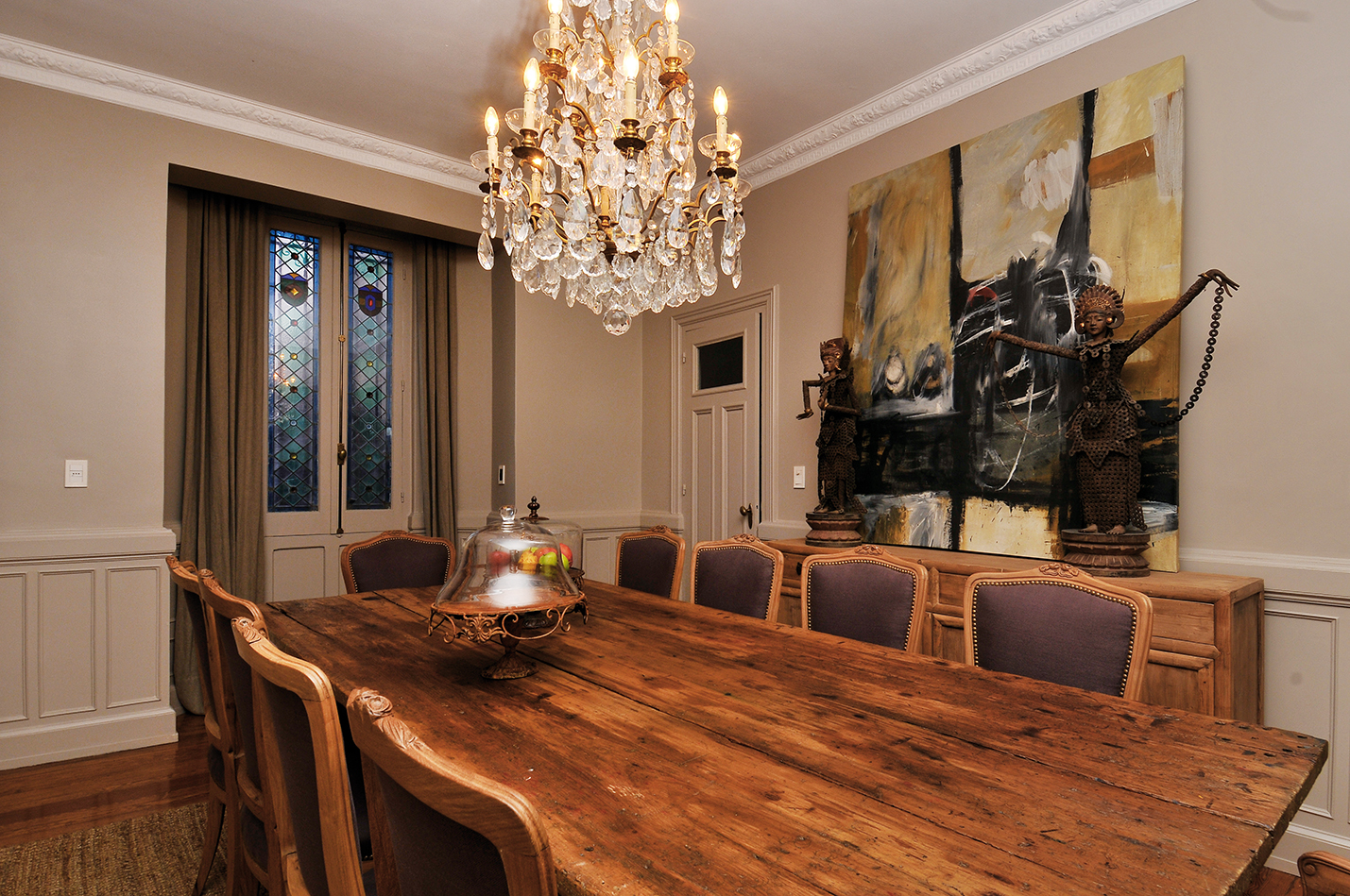 La protagonista es esta vez la madera. Madera natural tallada a mano, en el caso de las sillas antiguas conseguidas en un remate. Para el tapiz, Maitena se inclinó por un lino color uva, en un espacio que resulta más sobrio que el anterior. La gran mesa de comedor fue traída de un casco de estancia, pero en vez de restaurarla, decidieron dejarla como estaba, rústica y con las marcas que delatan sus años la mesa ha envejecido con dignidad y entonces no pareció ser necesaria restauración alguna. Sobre la pared, la obra del artista Carlos Musse es acompañada por dos esculturas construidas en hierro y materiales reciclados, traídas desde Indonesia. Y, entre tanto color, está el espacio para la dueña de casa: un lugar tranquilo, donde acostumbra descansar y distraerse de la rutina, entre libros la sana paz que ofrece el ambiente. Manteniendo la estructura original de la casa, el acogedor espacio de lectura es típico de las casas de época, con su estructura integrada a la biblioteca que, en este caso, fue reinterpretada como cava. Los tejidos metálicos que componen las puertas a los lados son originales de la casa, al igual que los libros del anónimo abogado que habitó estos espacios por primera vez y fueron acompañando a las diferentes familias que han pasado por ahí desde entonces. Esta vez, son acompañados por otros de los artículos del coleccionista, que completan la biblioteca con un poco más de historia. El sillón fue tapizado con las telas de las hermanas Hounié, con un simpático motivo de pájaros y plantas. Sobre este, un fragmento de tela bordada de un anticuario de Beijing se destaca sobre el passepartout blanco.