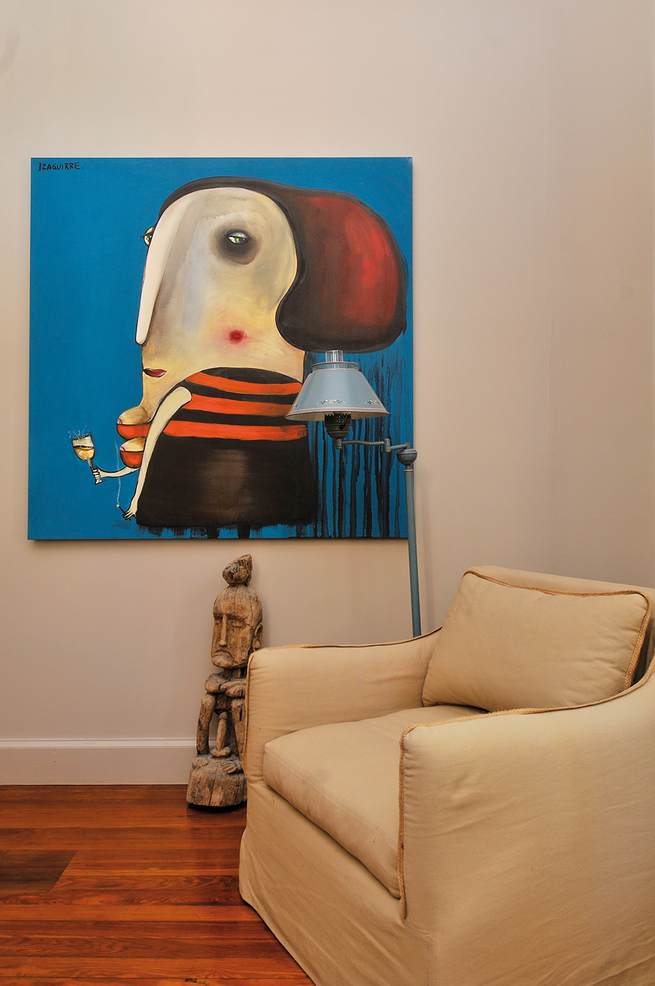 En el dormitorio principal, un empapelado de rosas y molduras antiguas se apodera de todas las miradas por su escala y tamaño que impactan y, una vez más, la interiorista nos muestra alternativas para no caer en lo habitual. El terciopelo azul piedra del acolchado y los almohadones es también de la tienda de las Hounié y, sin dejar de ser original, se mantiene más tímido que la pared del fondo. El respaldo de cama en cuero es también de líneas simples y puras, logrando despegarse de las flores por su color suela, que contrasta. Las mesas de luz continúan con la asimetría del ambiente, con dos lámparas antiguas y originales. Junto a la ventana, otra obra del artista Izaguirre resalta en un rincón de colores neutros.