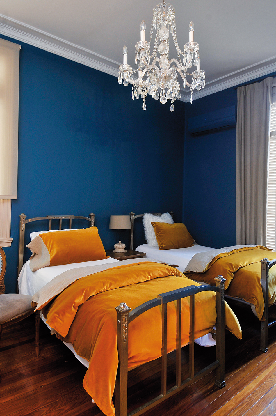 Para el dormitorio de las chicas optaron por colores puros e intensos. El terciopelo color oro se ve, una vez más, como protagonista del espacio y las paredes en azul fuerte hacen del espacio un lugar único.