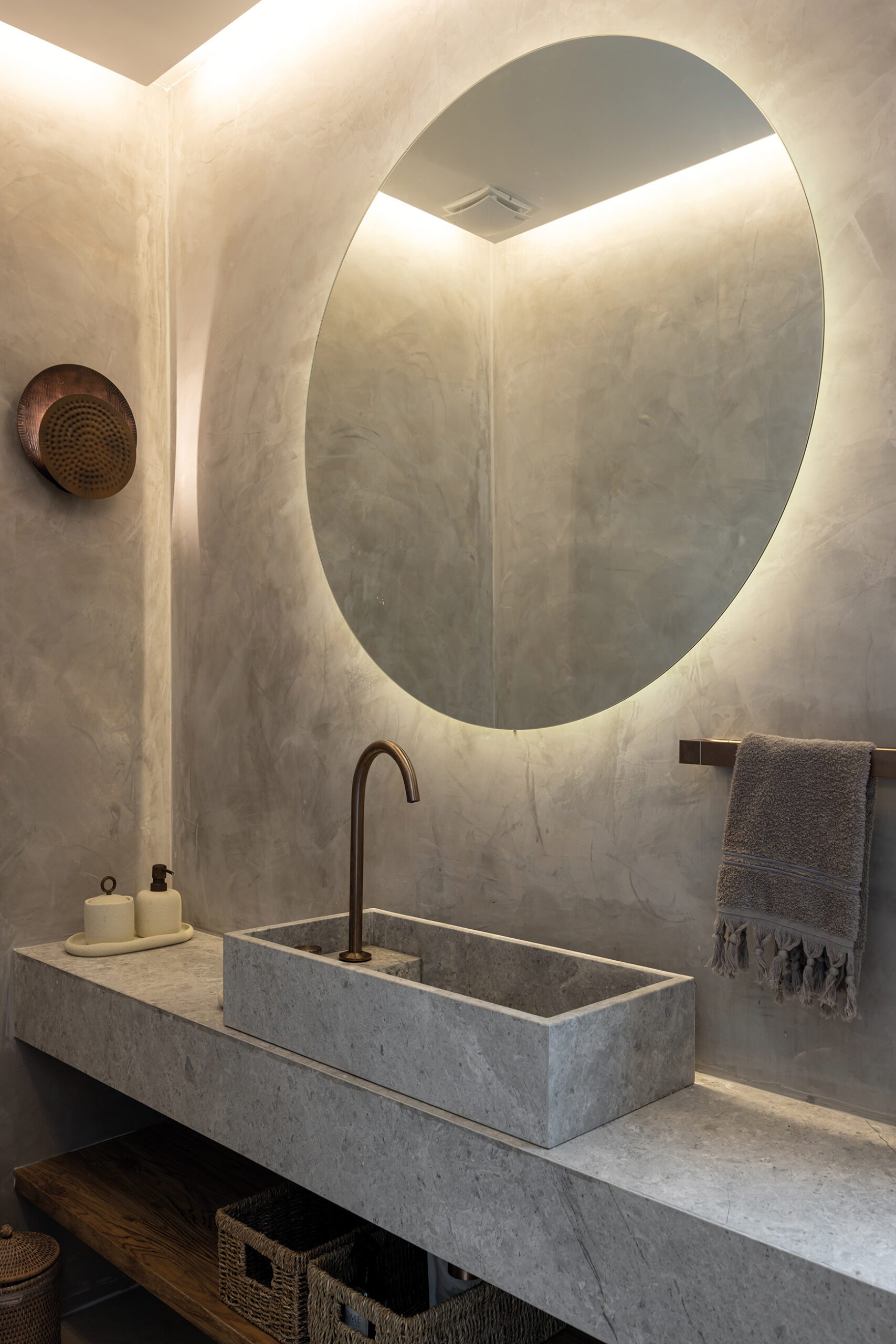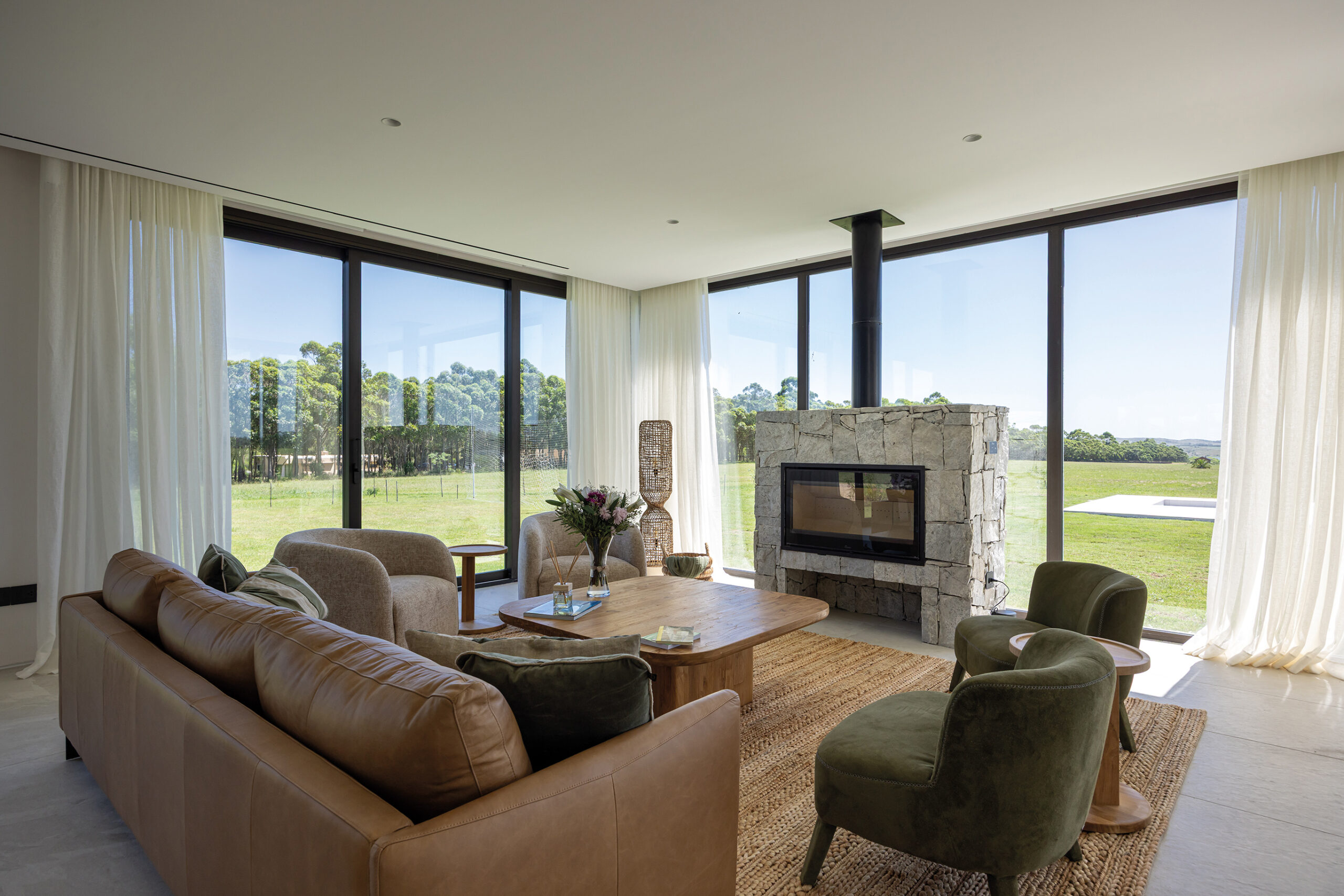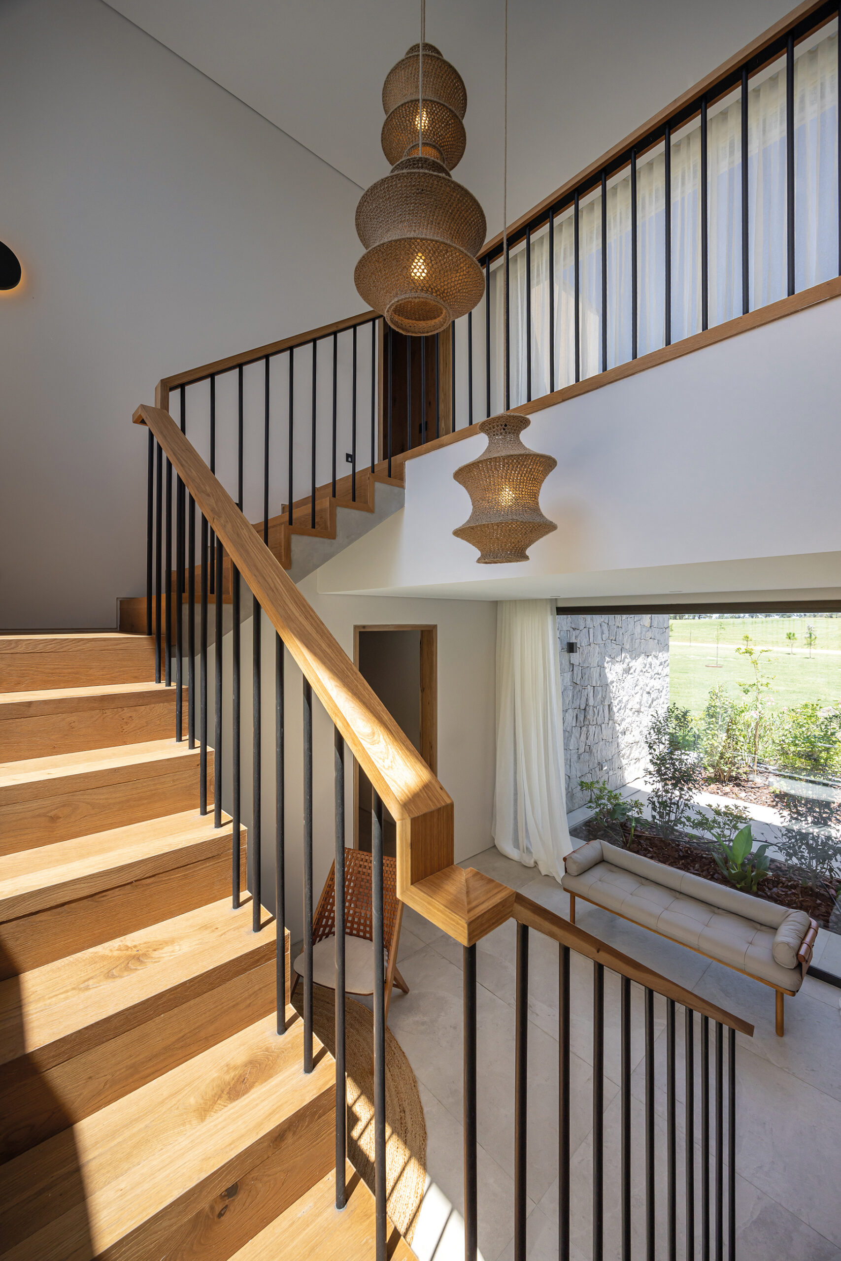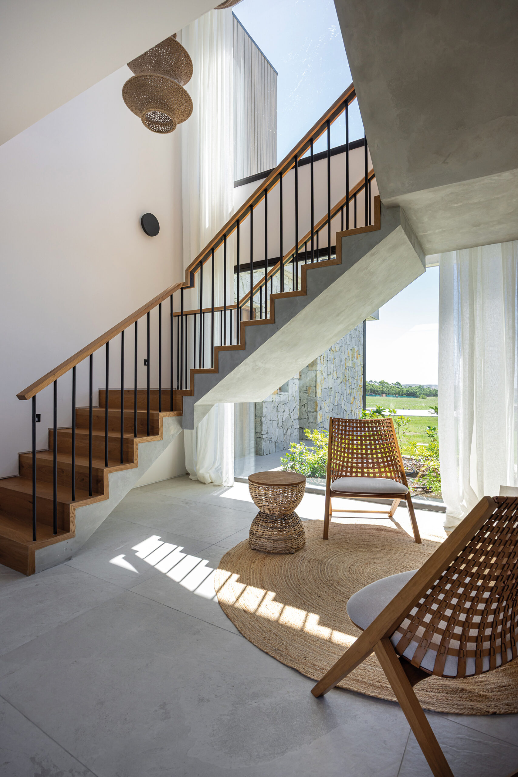 La vivienda se estructura en volúmenes funcionales separados por patios internos, que no solo aportan privacidad a los distintos espacios, sino que también refuerzan la fusión con el entorno natural. Estos vacíos funcionan como articuladores entre las áreas, generando transiciones sutiles entre lo construido y lo natural. La materialidad juega un papel clave en esta integración: piedra y madera predominan en la composición, en sintonía con la paleta cromática del paisaje. La piedra, extraída de canteras locales, establece un diálogo con la geografía del lugar, mientras que la madera, empleada en revestimientos y carpinterías, aporta calidez y armoniza con la vegetación circundante.