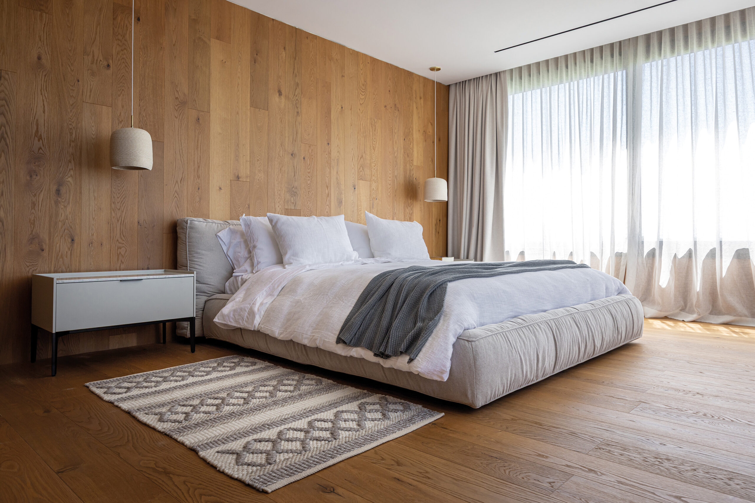 Distribuida en dos niveles, la casa responde a un esquema de sectorización eficiente. En la planta baja se ubica el área social, concebida para la convivencia y el esparcimiento. Aquí, las zonas comunes se organizan en una secuencia fluida que favorece la interacción, con espacios abiertos que se extienden hacia las galerías y jardines exteriores. La relación con el paisaje es constante: pérgolas y aleros matizan la incidencia del sol, mientras que el mobiliario exterior invita a disfrutar del entorno en diferentes momentos del día. Un sector independiente de alojamiento para visitas proporciona confort y privacidad a los huéspedes sin interferir en la dinámica cotidiana de la familia. La planta alta, en contraste, está reservada para la vida íntima. Los dormitorios principales disfrutan de amplias vistas al lago y los montes bajos, reforzando la premisa del proyecto: un hogar en equilibrio con su entorno.