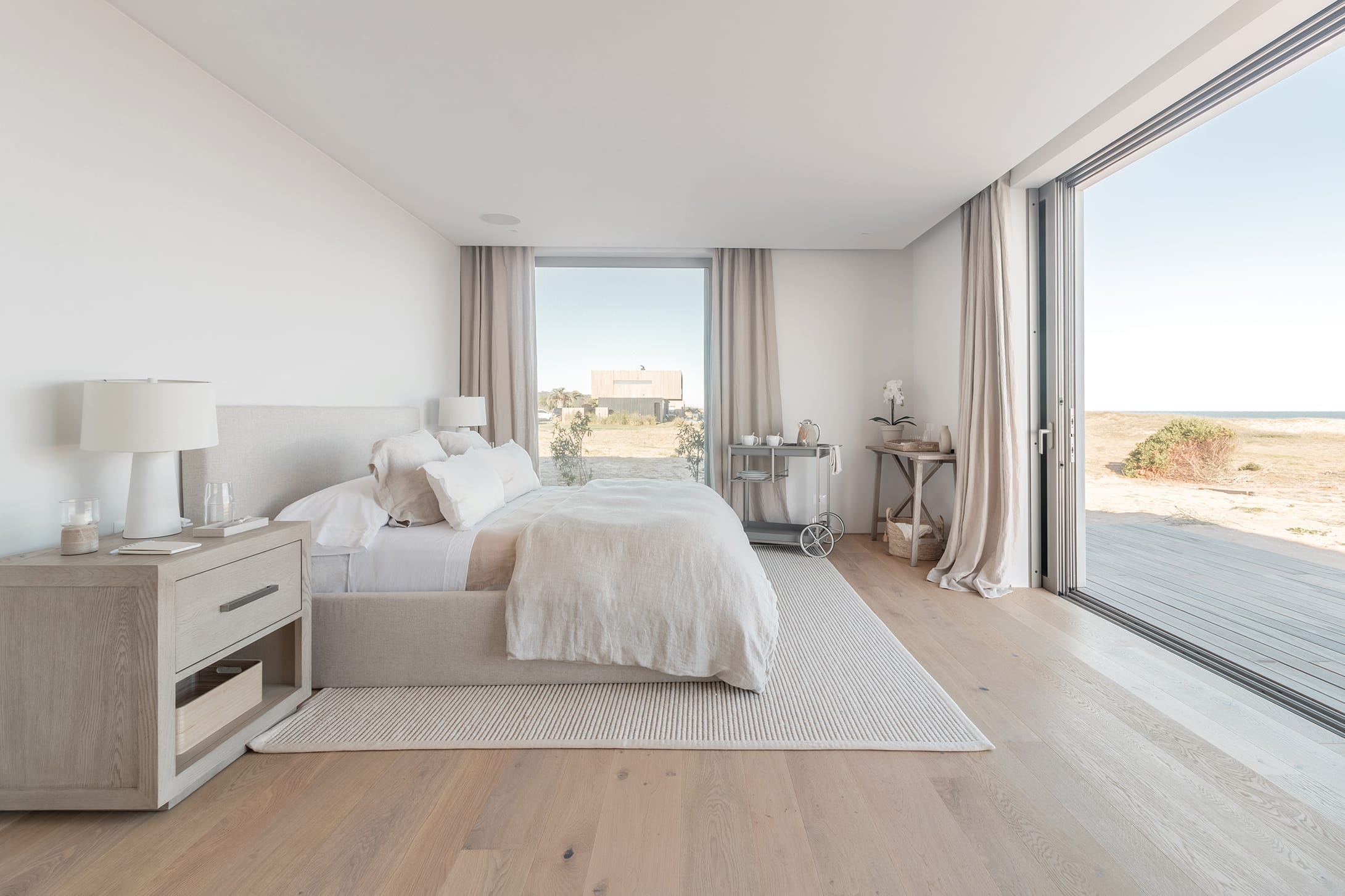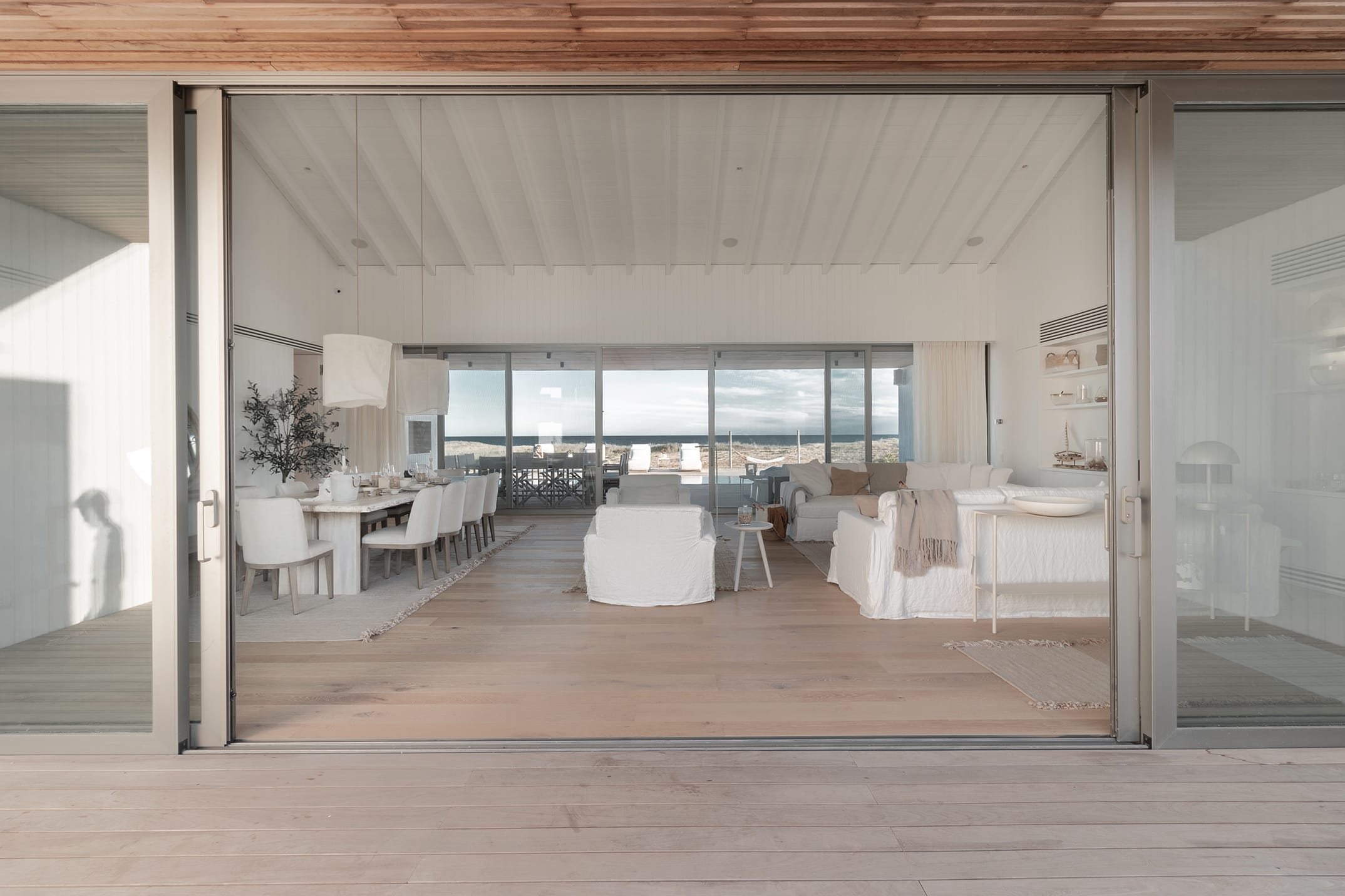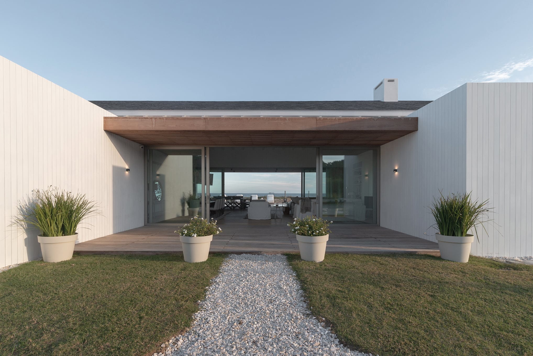 Proyectar en la playa supone todo un desafío que parte de la premisa de cuidar y proteger al máximo el entorno al implantar una nueva construcción y de alguna manera es una oportunidad para desplegar un lenguaje particular. La Bonita es una casa que se diseña inspirada en las antiguas construcciones de los pescadores de la zona. Para ello, se ha utilizado un estilo vanguardista con materiales y texturas nobles como la madera y techos livianos que acompañan el escenario natural. El diseño de la casa es sencillo y sumamente orgánico, con la idea de que sea parte del paisaje y que la naturaleza sea la protagonista. La casa se estructura en una sola planta compuesta por dos volúmenes que se unen entre sí por medio del techo a cuatro aguas. En su diseño se genera un espacio exterior techado y otro interior como ambiente social con sala y comedor, y de esta forma se compone un bloque rectangular que logra forzar el vínculo interior-exterior. Las áreas privadas se distribuyen a ambos lados del bloque. El proyecto es vanguardista y a la vez cuidadoso con el entorno, apela a tonalidades compuestas por colores puros que logran el efecto de el volumen con el paisaje. La casa se integra perfectamente en su entorno natural, generando la sensación visual de haber sido siempre parte del mismo. En el ala central de la casa, con salida a la fachada principal que marca la entrada y salida a la playa en la fachada posterior, se crea un gran espacio abierto que se divide en dos secciones mediante una distribución a partir de los muebles seleccionados diseñados específicamente para este fin. El estilo de la casa es muy puro, con predominancia de tonos blancos que se combinan con revestimientos de madera para crear un ambiente marítimo que conecta el interior y el exterior. El dormitorio principal está ubicado en uno de los laterales de la casa y cuenta con amplias transparencias que permiten disfrutar constantemente del paisaje.