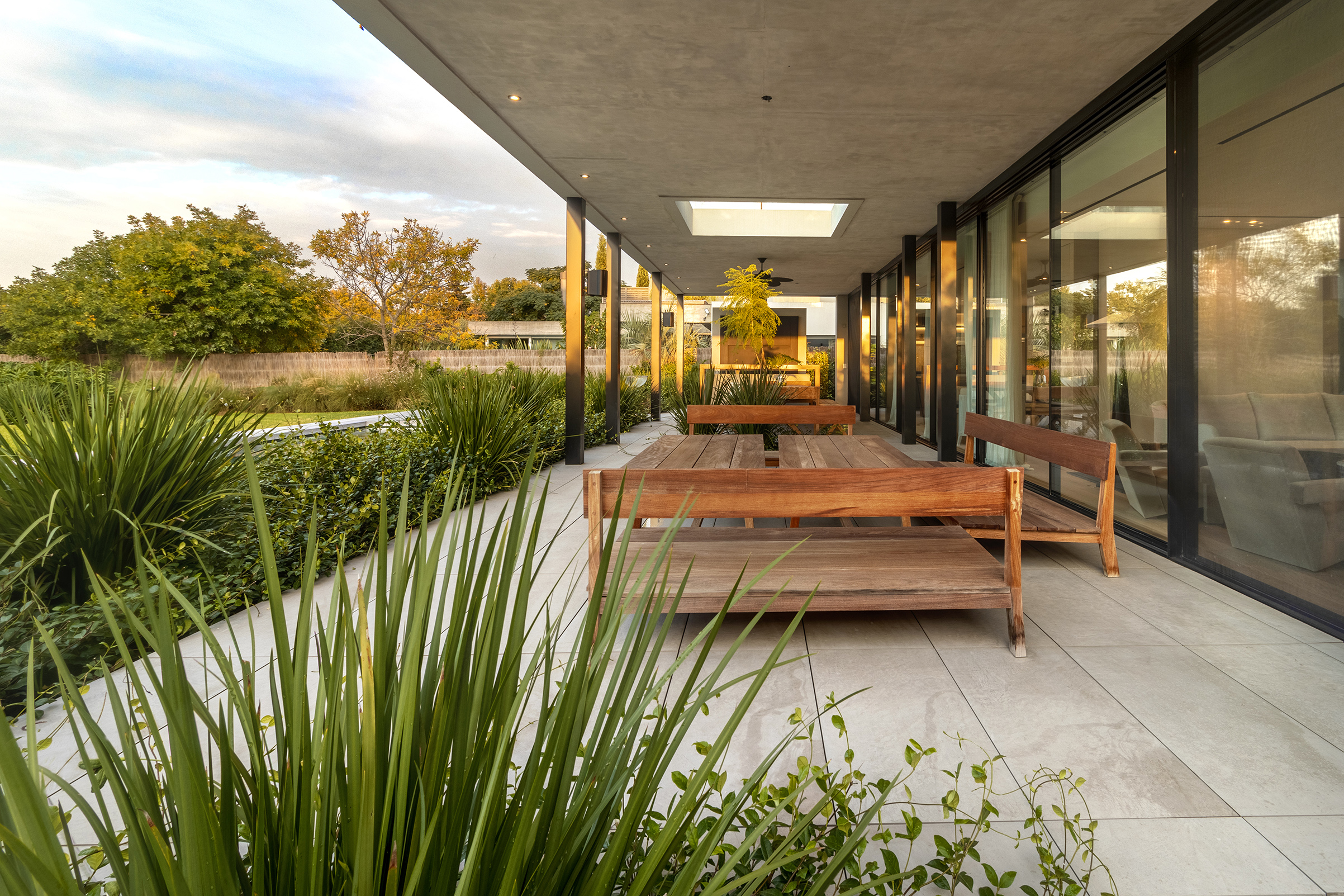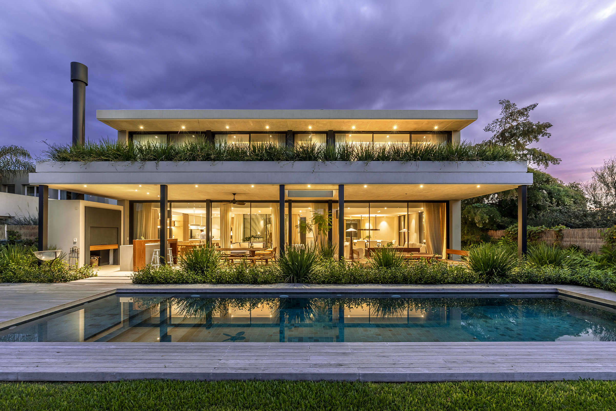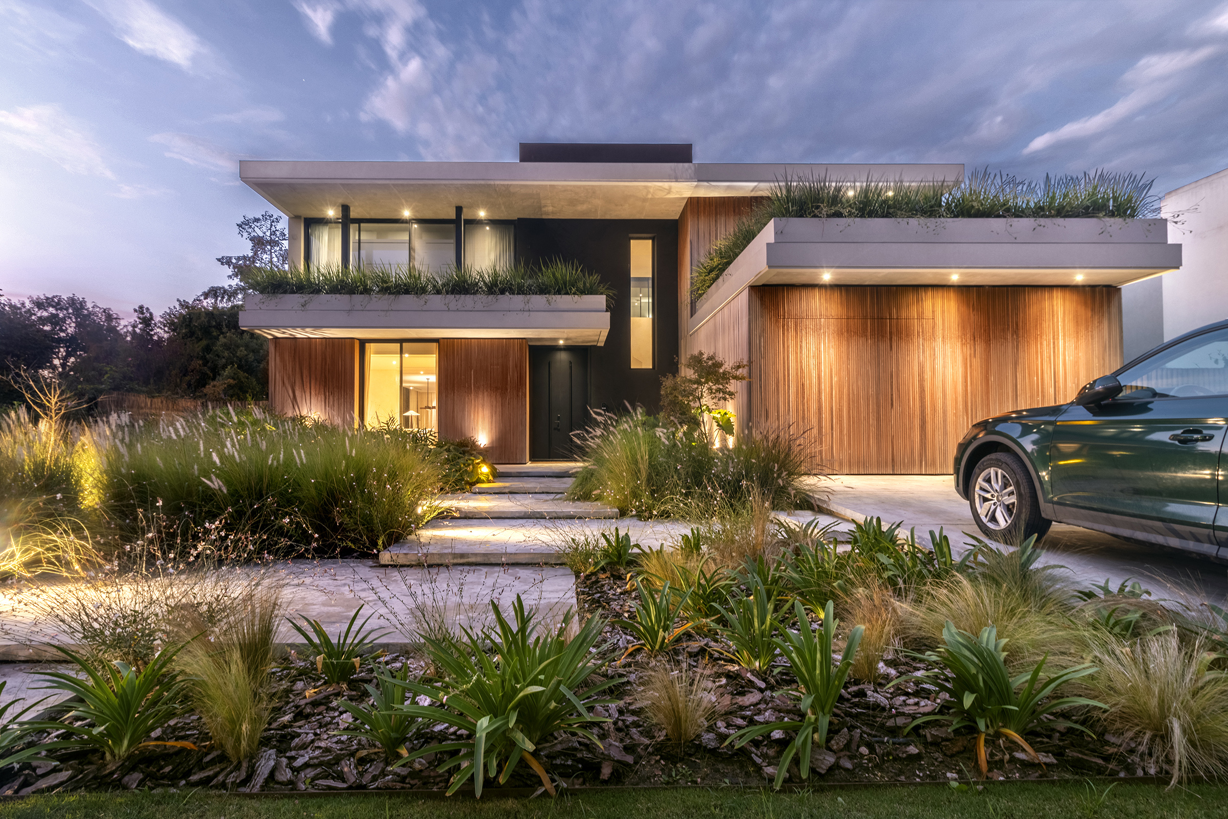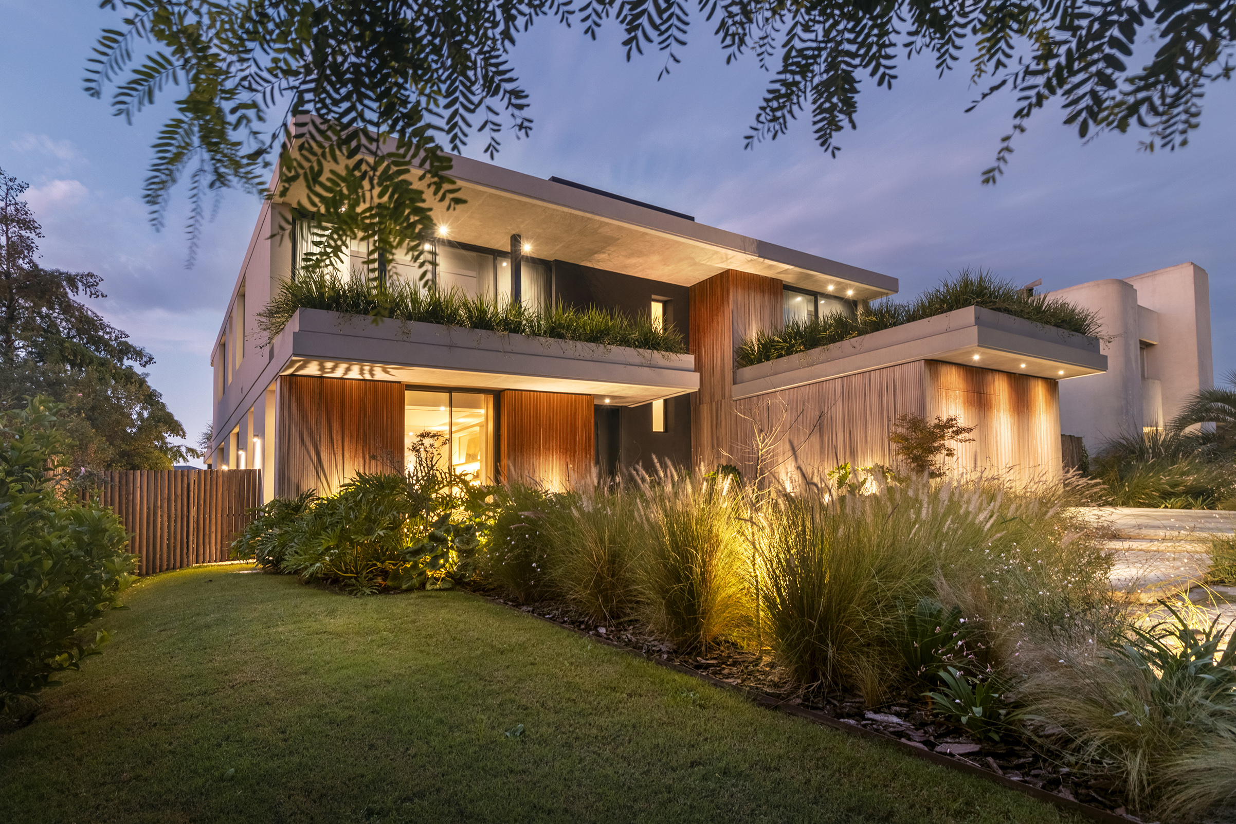 La elección material responde a una estética sin nostalgia, pero profundamente sensible: revoque texturado en tonos neutros, revestimientos de lapacho que aportan calidez sin rusticidad, ventanas de aluminio negro que enmarcan el paisaje sin interrumpirlo, barandas de vidrio, estucados interiores que suavizan la luz, pisos de madera y porcelanato en un equilibrio sobrio y táctil. La vegetación, presente incluso en las terrazas y en macetas diseñadas como parte de la arquitectura, refuerza la idea de un entorno construido pero vivo. En cuanto al confort térmico, la tecnología se integra con discreción: losa radiante por agua y aire acondicionado central aseguran una climatización eficiente durante todo el año, sin interferir con la percepción espacial ni con la atmósfera buscada. Esta casa no es un ejercicio de estilo ni una obra que busca la atención de quien pasa. Es, más bien, el resultado de una secuencia de decisiones precisas, guiadas por una mirada atenta y una sensibilidad afinada. Una arquitectura que no aspira a deslumbrar, sino a durar. Que no grita, pero deja huella.