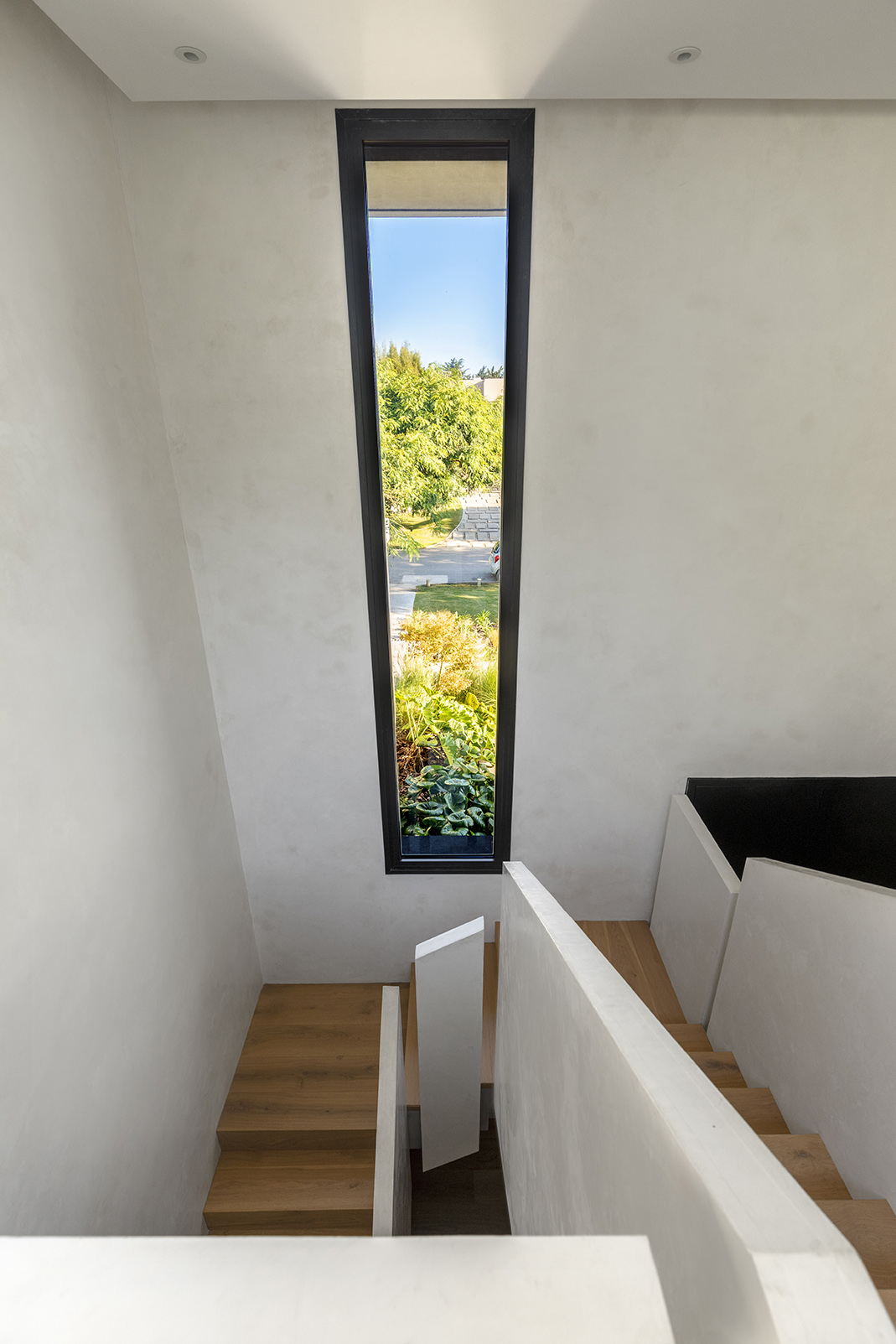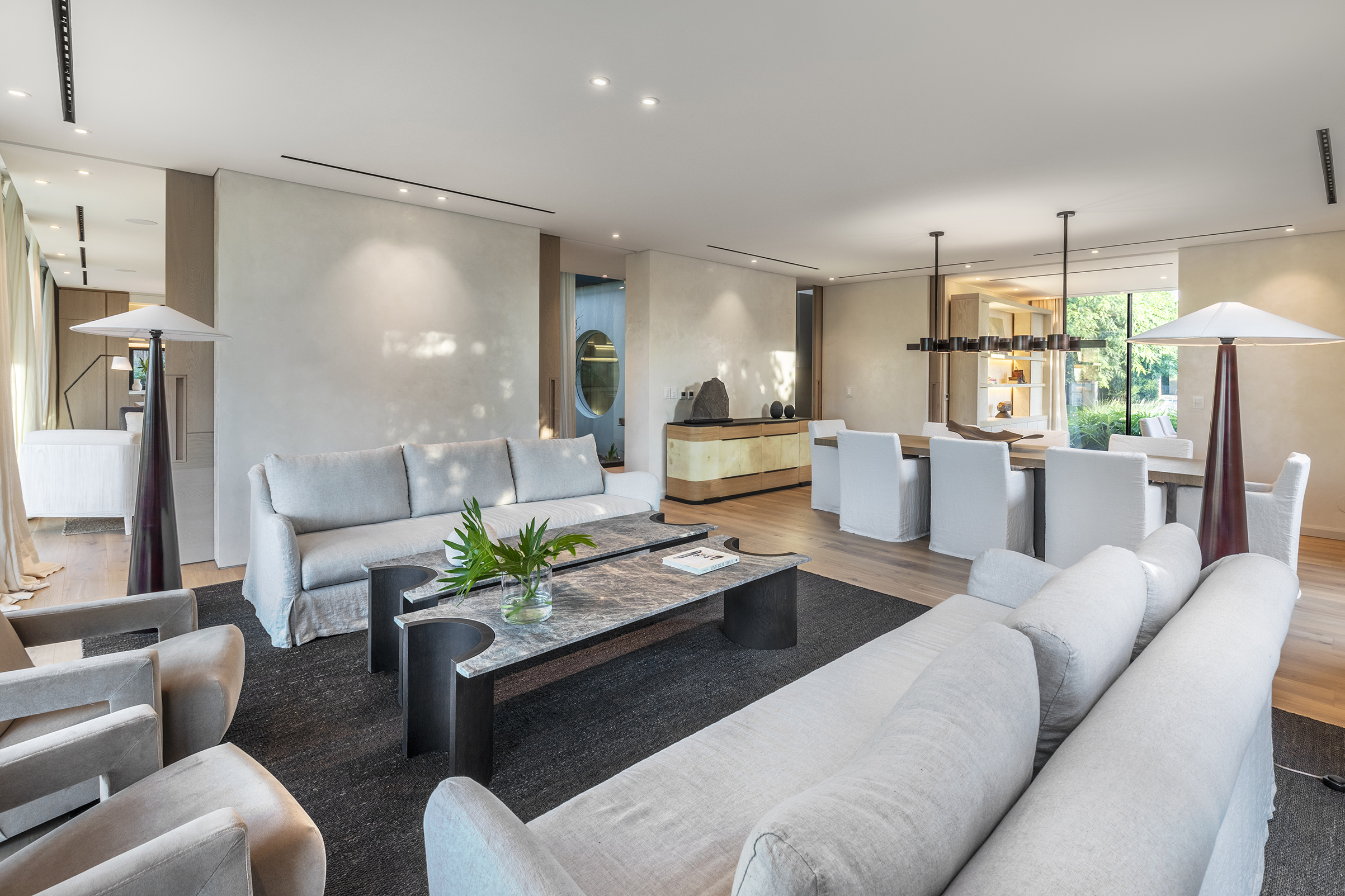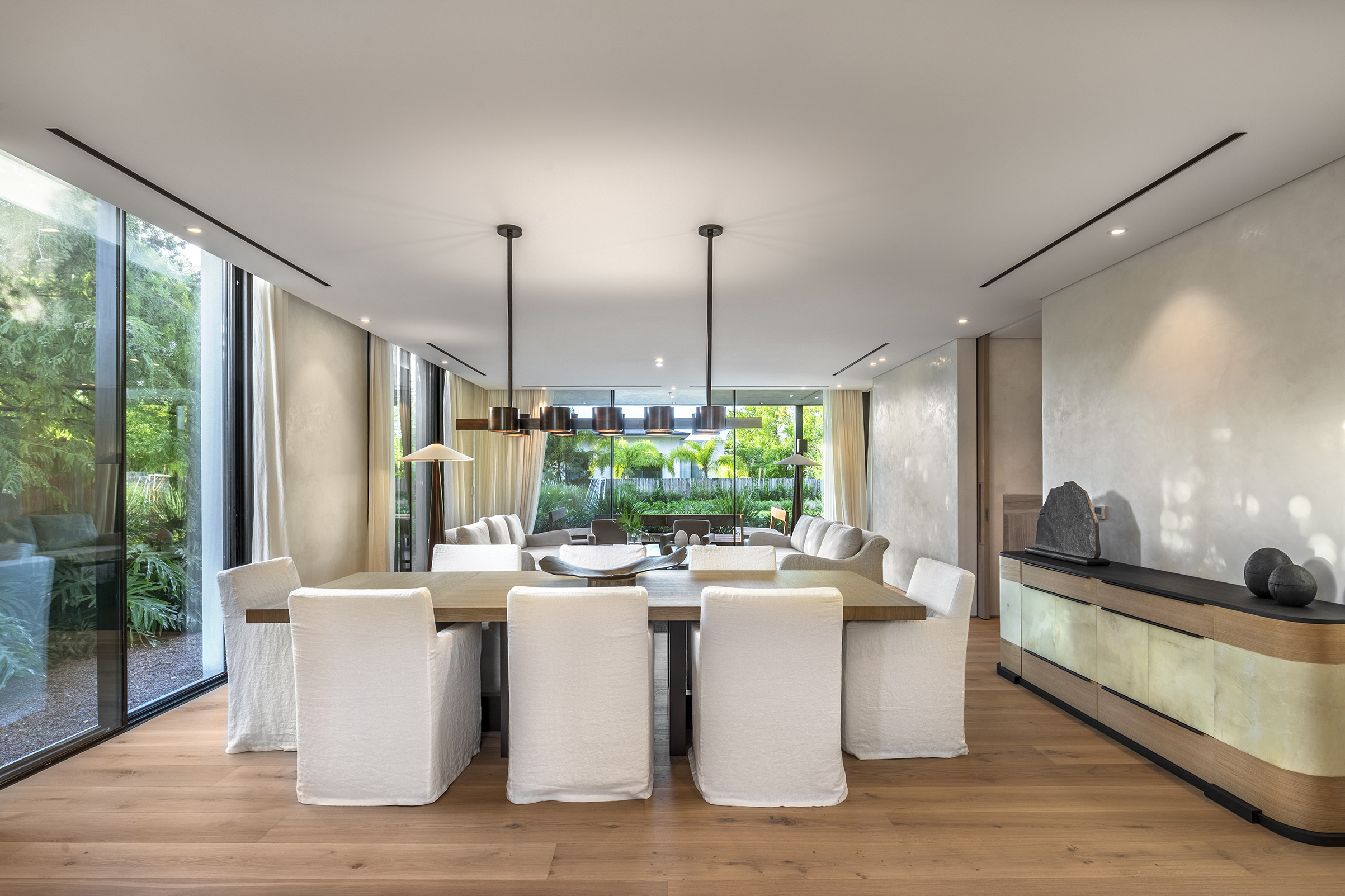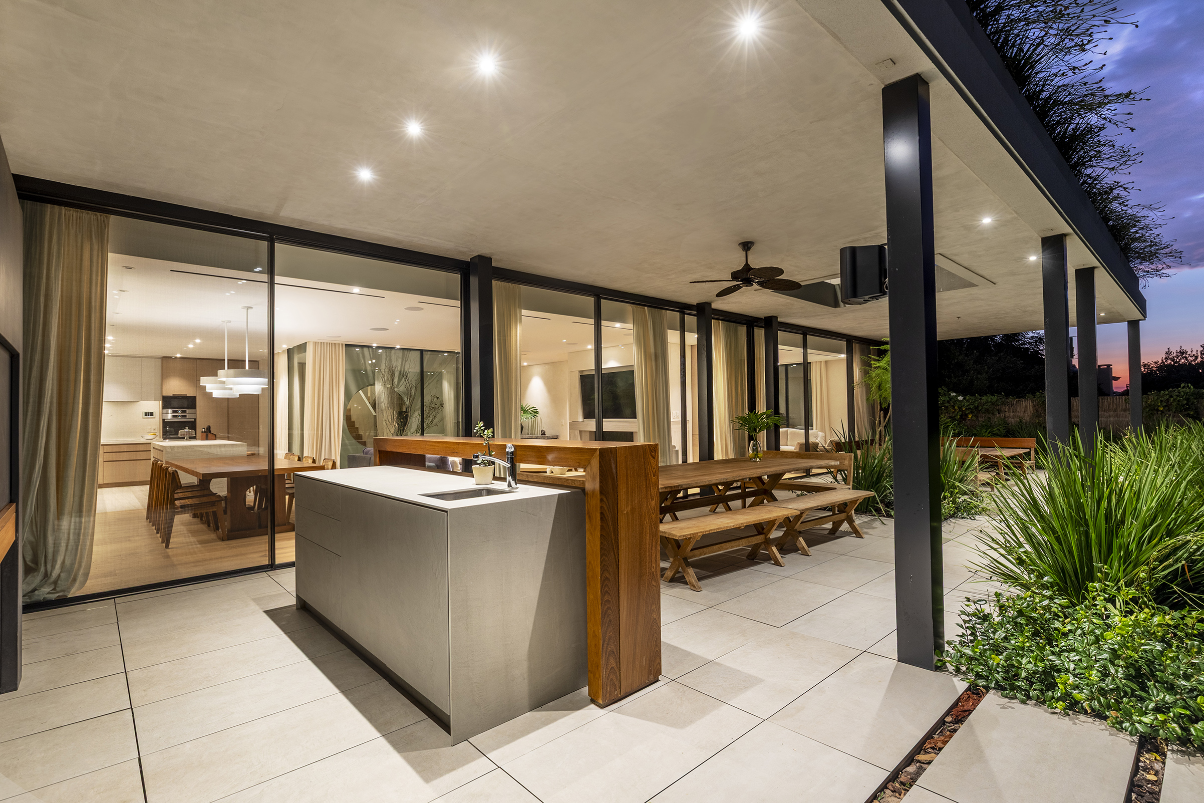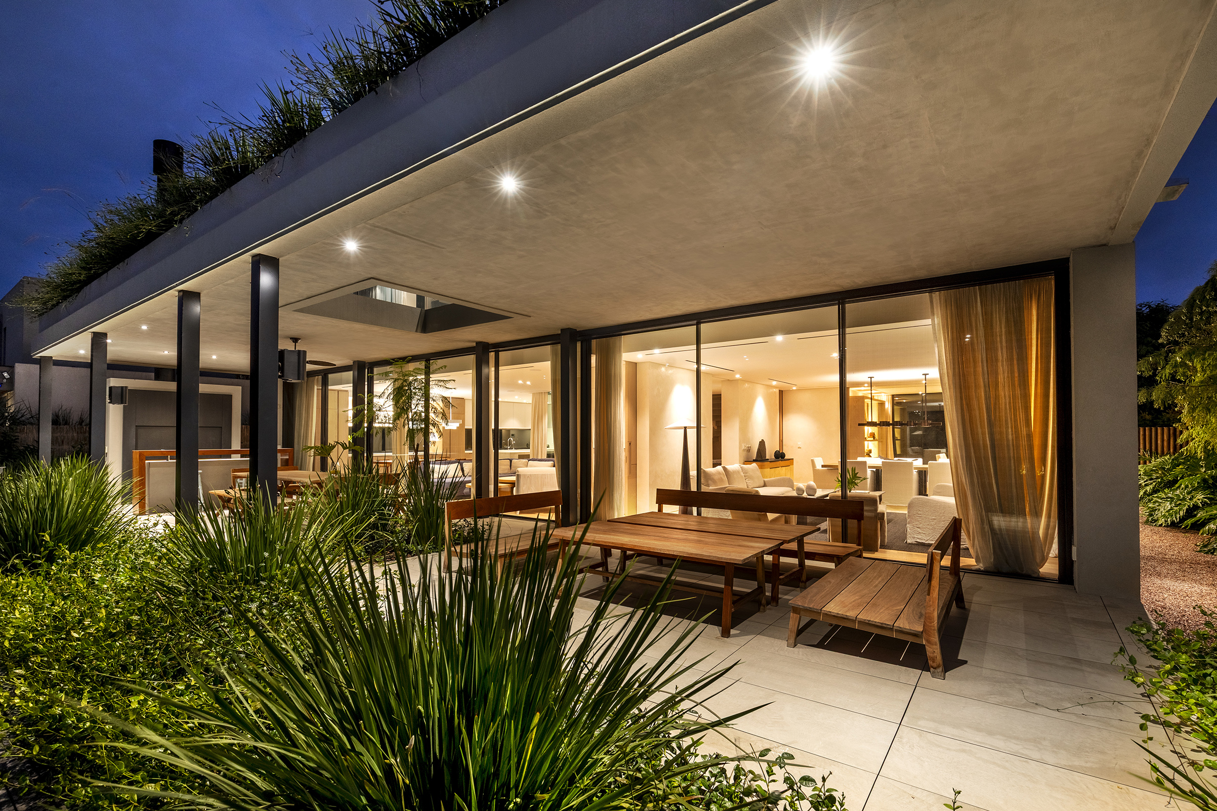 La elección material responde a una estética sin nostalgia, pero profundamente sensible: revoque texturado en tonos neutros, revestimientos de lapacho que aportan calidez sin rusticidad, ventanas de aluminio negro que enmarcan el paisaje sin interrumpirlo, barandas de vidrio, estucados interiores que suavizan la luz, pisos de madera y porcelanato en un equilibrio sobrio y táctil. La vegetación, presente incluso en las terrazas y en macetas diseñadas como parte de la arquitectura, refuerza la idea de un entorno construido pero vivo. En cuanto al confort térmico, la tecnología se integra con discreción: losa radiante por agua y aire acondicionado central aseguran una climatización eficiente durante todo el año, sin interferir con la percepción espacial ni con la atmósfera buscada. Esta casa no es un ejercicio de estilo ni una obra que busca la atención de quien pasa. Es, más bien, el resultado de una secuencia de decisiones precisas, guiadas por una mirada atenta y una sensibilidad afinada. Una arquitectura que no aspira a deslumbrar, sino a durar. Que no grita, pero deja huella.