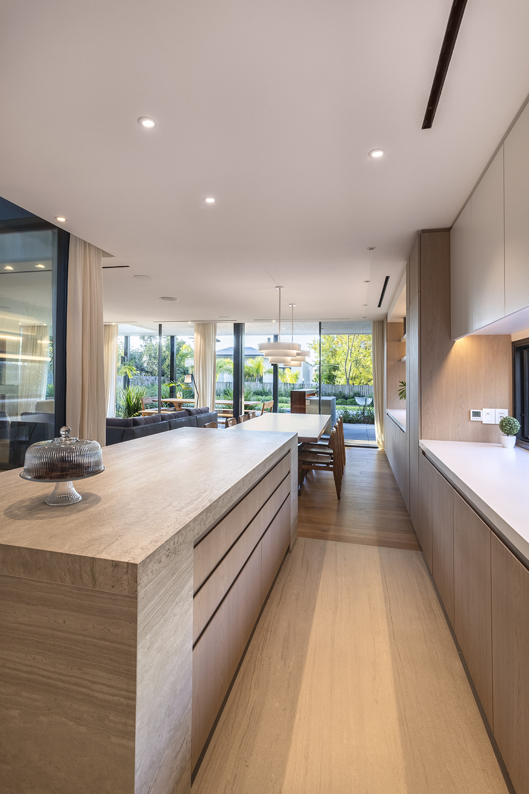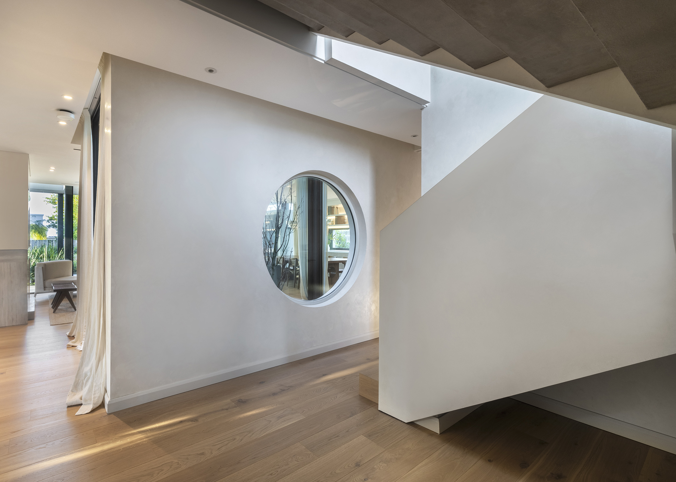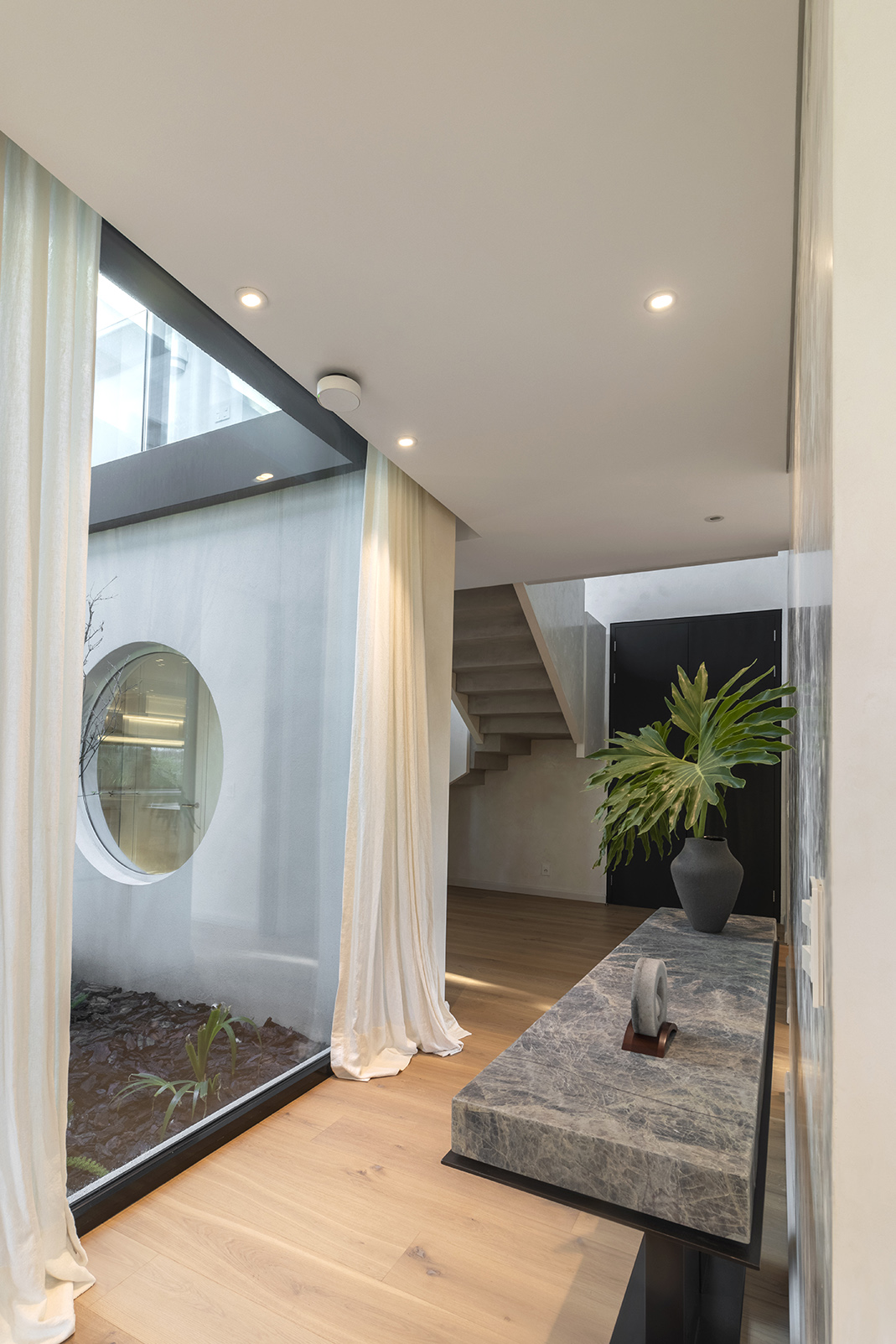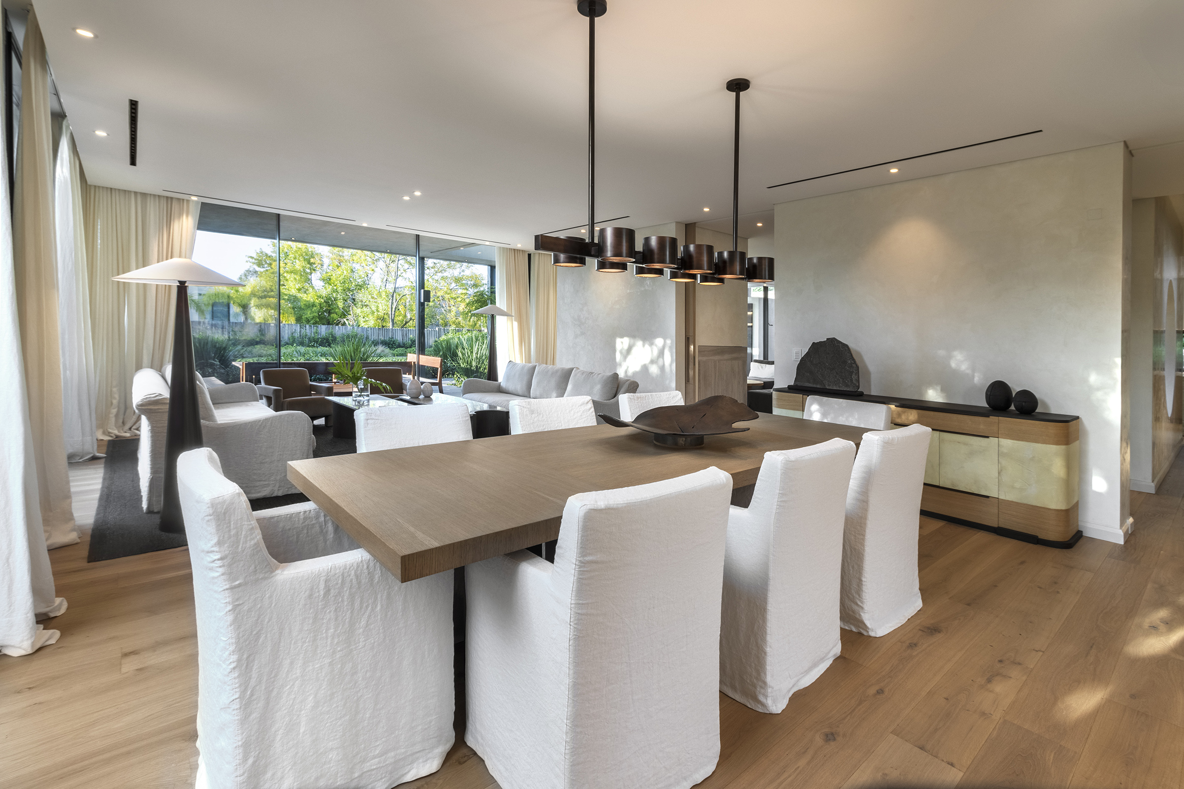 La elección material responde a una estética sin nostalgia, pero profundamente sensible: revoque texturado en tonos neutros, revestimientos de lapacho que aportan calidez sin rusticidad, ventanas de aluminio negro que enmarcan el paisaje sin interrumpirlo, barandas de vidrio, estucados interiores que suavizan la luz, pisos de madera y porcelanato en un equilibrio sobrio y táctil. La vegetación, presente incluso en las terrazas y en macetas diseñadas como parte de la arquitectura, refuerza la idea de un entorno construido pero vivo. En cuanto al confort térmico, la tecnología se integra con discreción: losa radiante por agua y aire acondicionado central aseguran una climatización eficiente durante todo el año, sin interferir con la percepción espacial ni con la atmósfera buscada. Esta casa no es un ejercicio de estilo ni una obra que busca la atención de quien pasa. Es, más bien, el resultado de una secuencia de decisiones precisas, guiadas por una mirada atenta y una sensibilidad afinada. Una arquitectura que no aspira a deslumbrar, sino a durar. Que no grita, pero deja huella.