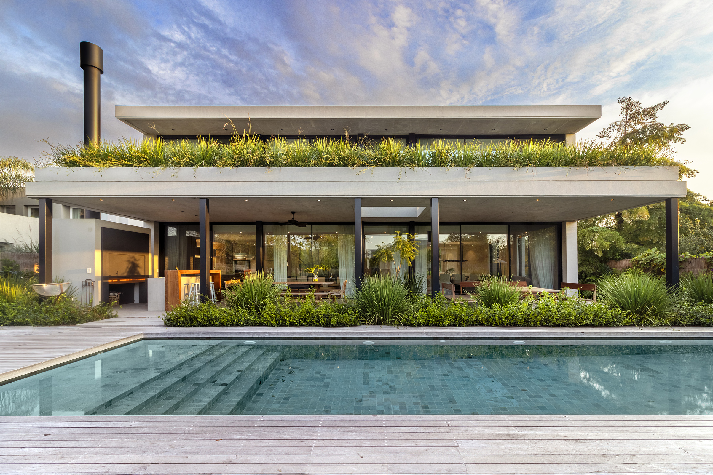 El gesto más poderoso del proyecto no está en la fachada ni en su volumetría contenida. Está en su interior: un patio central, densamente plantado, que no solo organiza la casa, sino que la anima. Es su corazón, su respiro. Visible desde el acceso principal, enmarcado por el hall en doble altura, este jardín interno es luz, es aire, es una pausa vegetal en el flujo doméstico. Cada espacio parece girar en torno a él con respeto. En la planta baja se distribuyen los espacios sociales: living, comedor, cocina con estar integrado, un escritorio que puede cerrarse por completo con paneles corredizos —la privacidad como opción, no como imposición—, y una zona de servicios pensada con igual rigor que el resto del programa. Desde allí, la casa se abre al exterior: una galería techada con parrillero y barra que extiende el espacio interior hacia el jardín y la piscina. Una pequeña franja de plantas en la propia galería recuerda que la naturaleza no es solo un fondo visual, sino parte constitutiva del vivir. Arriba, la planta alta abraza el vacío central. Una circulación perimetral recorre el contorno del patio y distribuye cinco dormitorios: el principal, tres secundarios y uno de huéspedes. Todos cuentan con terrazas, como si cada habitación necesitara su propio rincón de cielo.