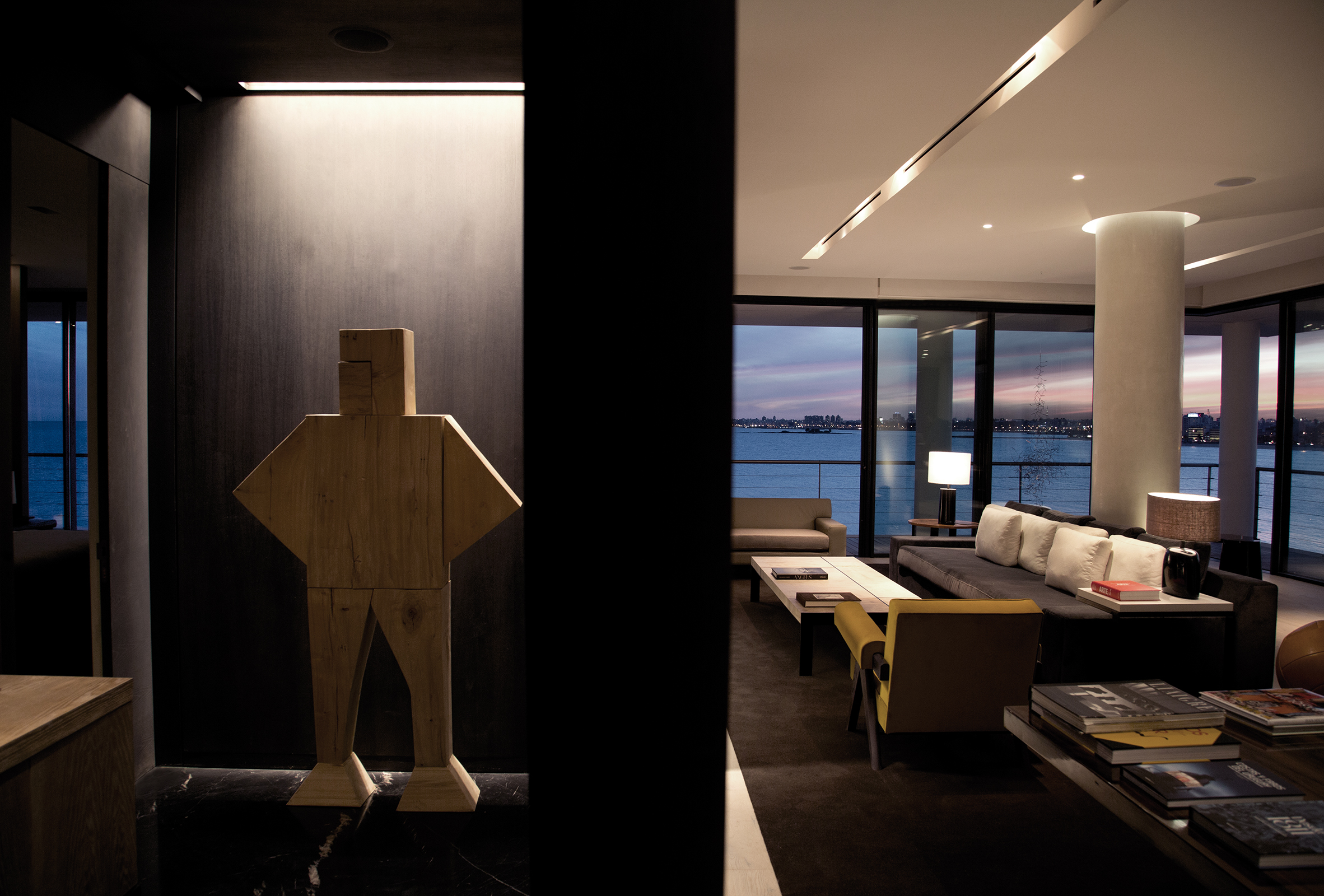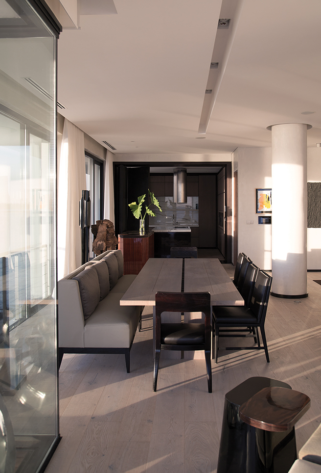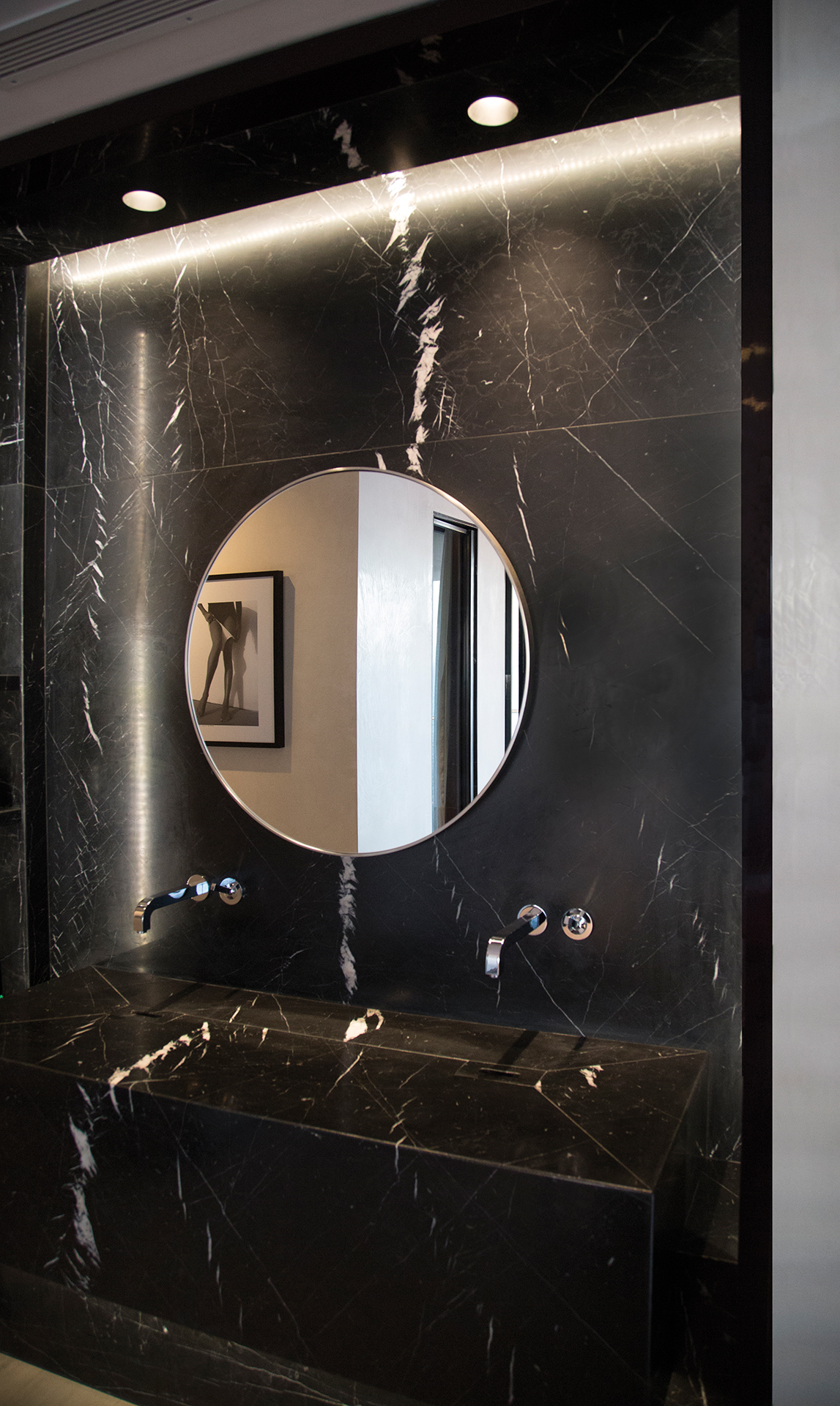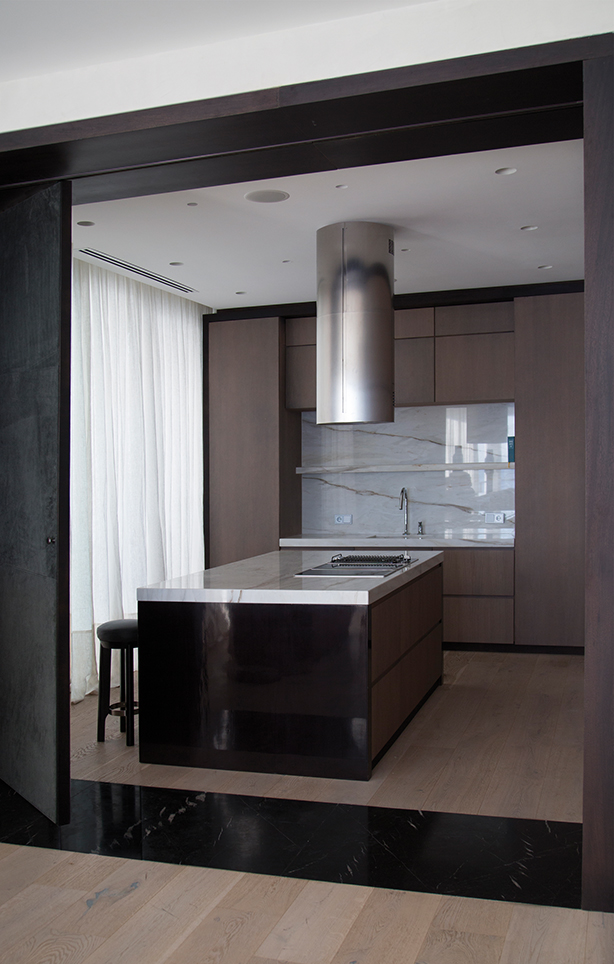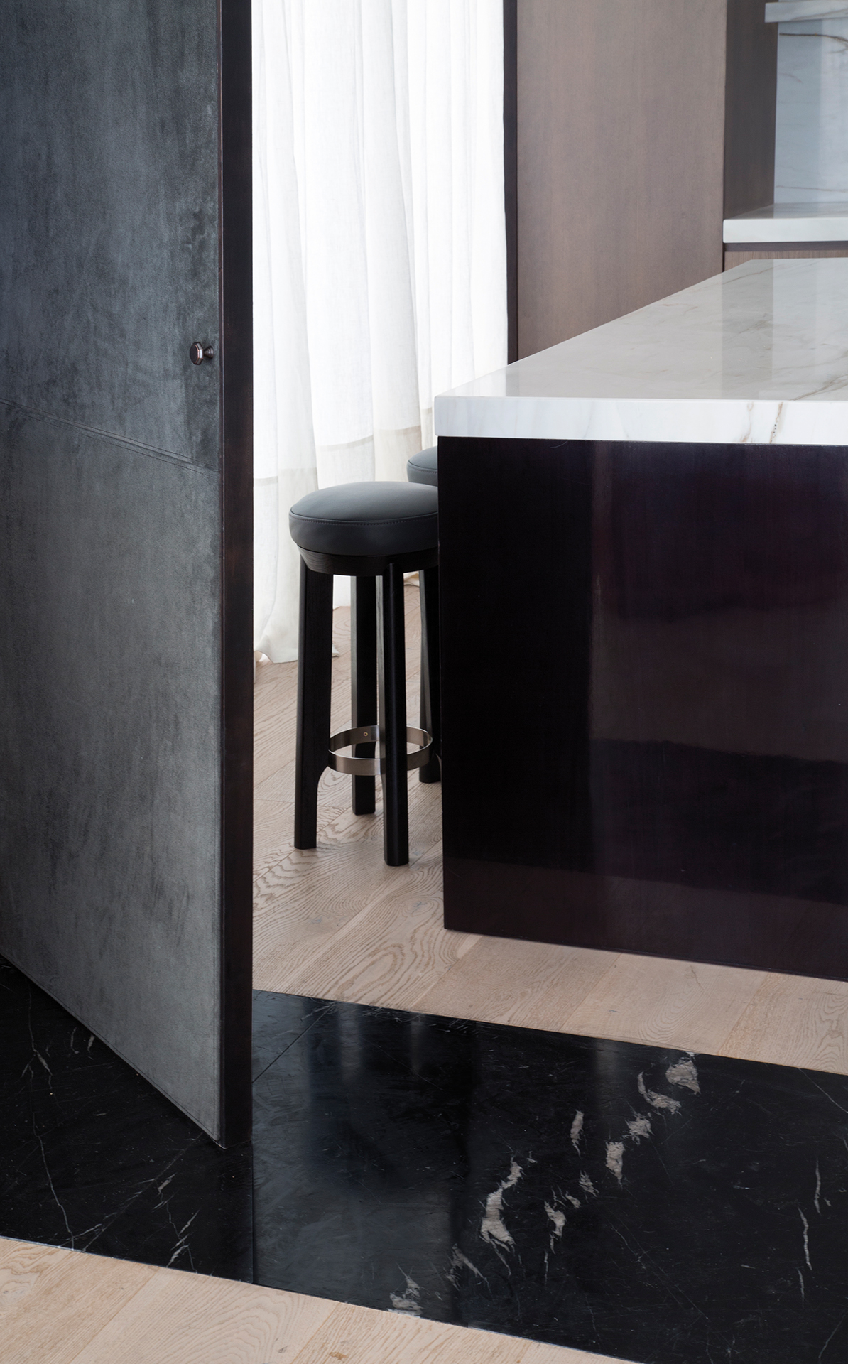 Piezas de mármol negro marquina fueron empleadas para generar las interfaces en la circulación. Aparecen integrando el comedor con la cocina, el hall de circulación con el baño social, en el dormitorio, los vestidores y el baño. Los enormes ventanales lucen cortinas en back out y otras con gruesos listones de madera que a modo de persianas aportan contención a la amplitud que ofrecen los espacios interiores. Las puertas se mimetizan con las paredes y en algunos casos, como la cocina o los dormitorios, están revestidas en gamuza color gris. Tiradores y herrajes en metal se presentan como detalles que acentúan el espíritu varonil de la escenografía propuesta por Balut. La iluminación cenital se apoya en luminarias belgas, especialmente importadas, con aperturas breves, con lo cual el carácter es dramático,