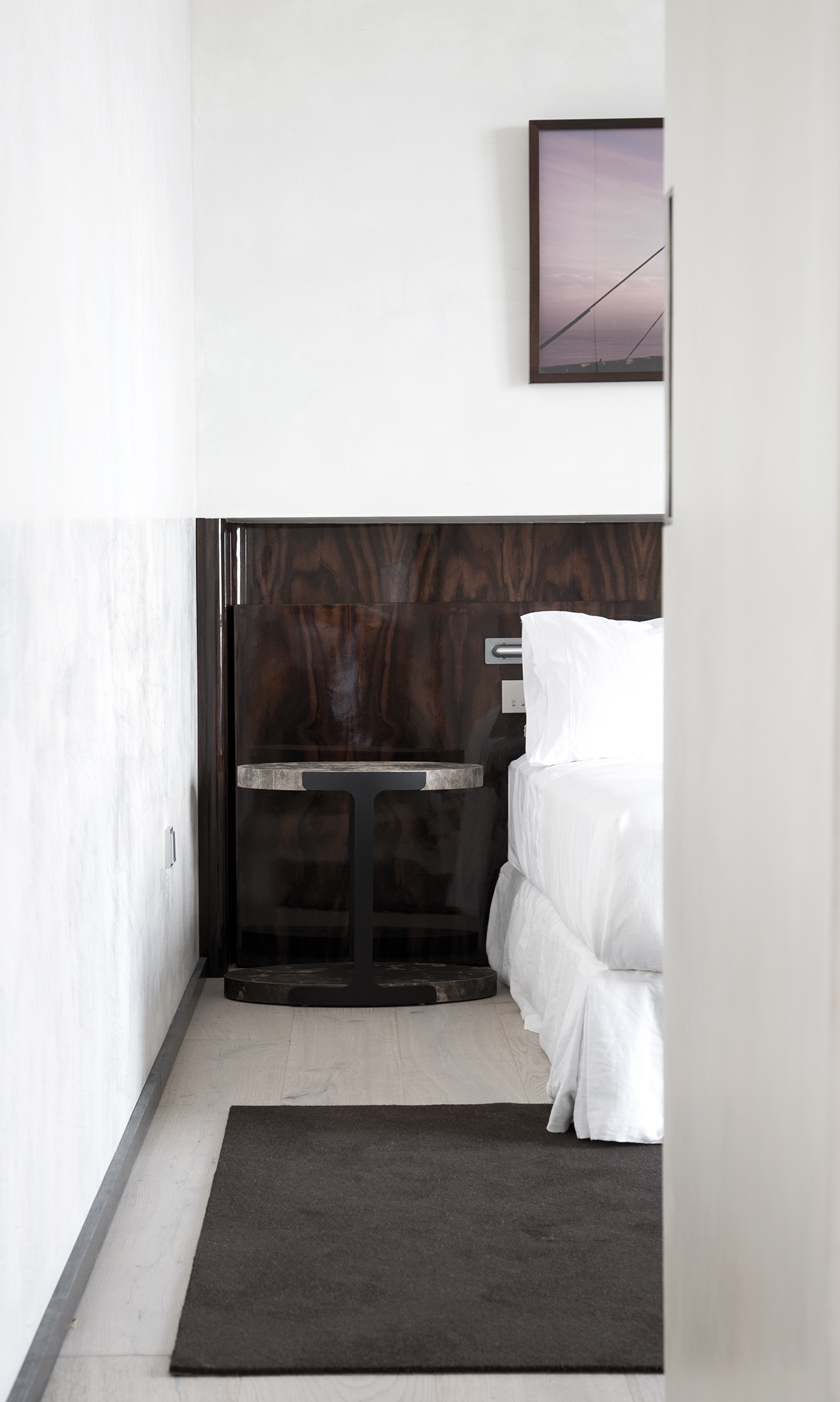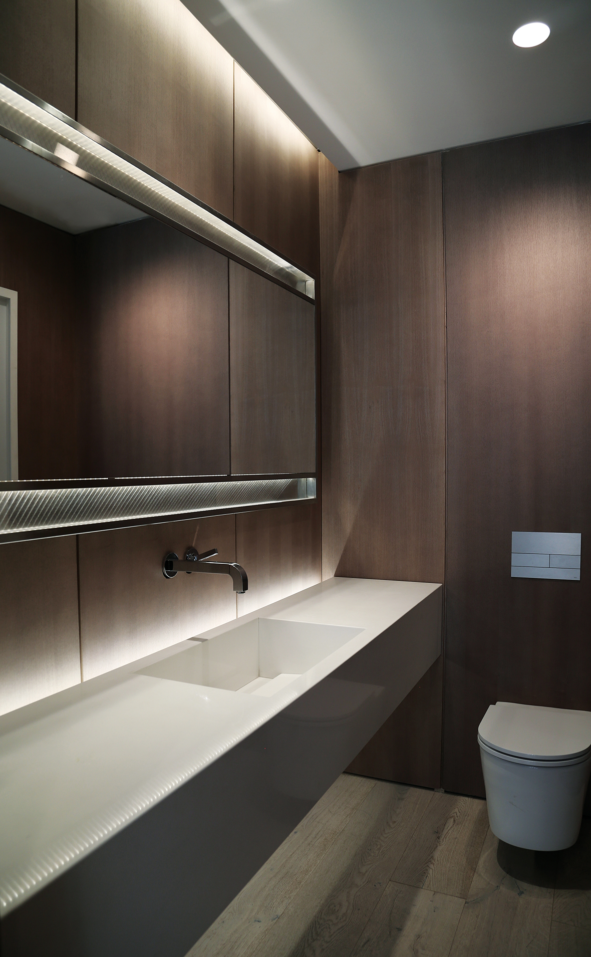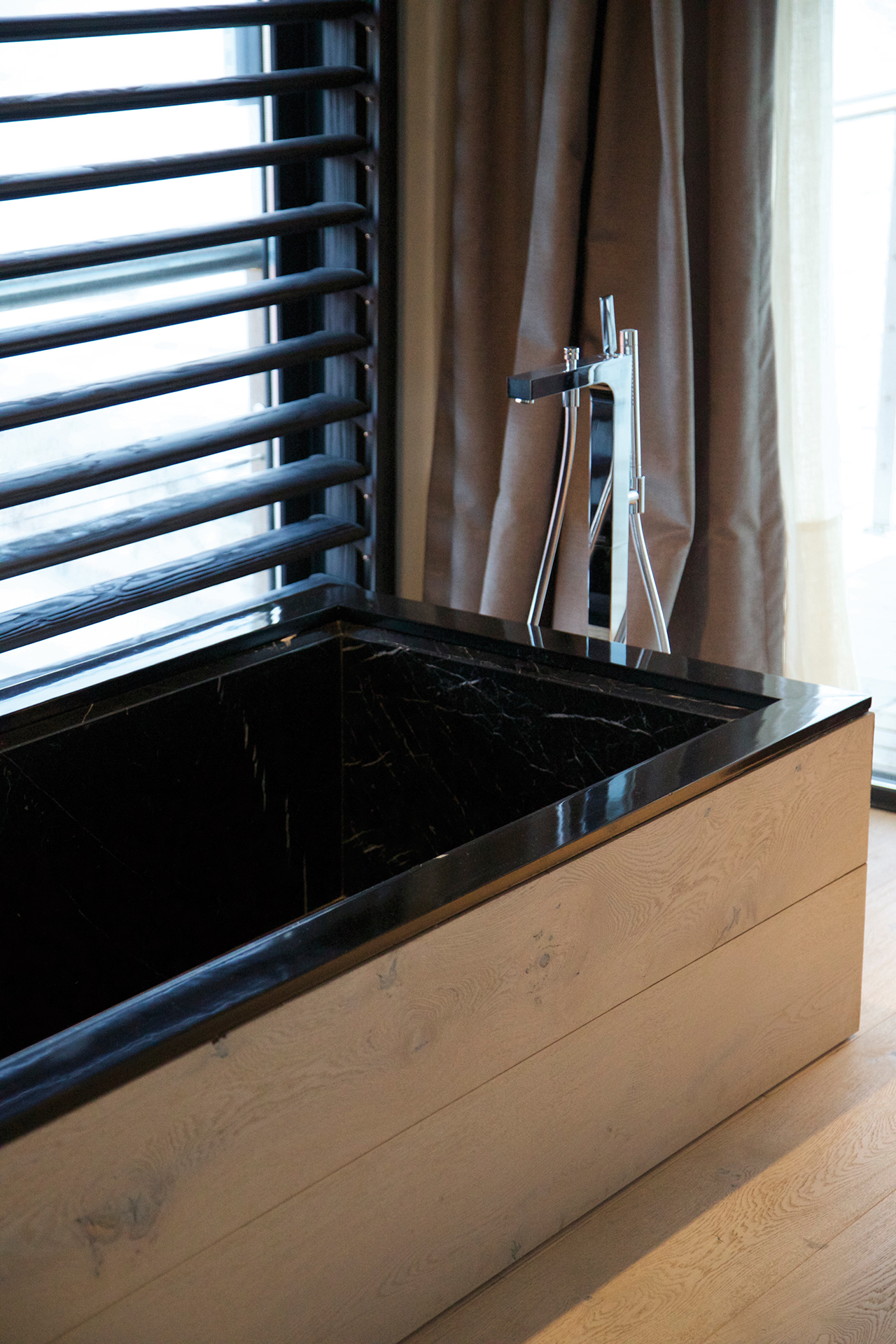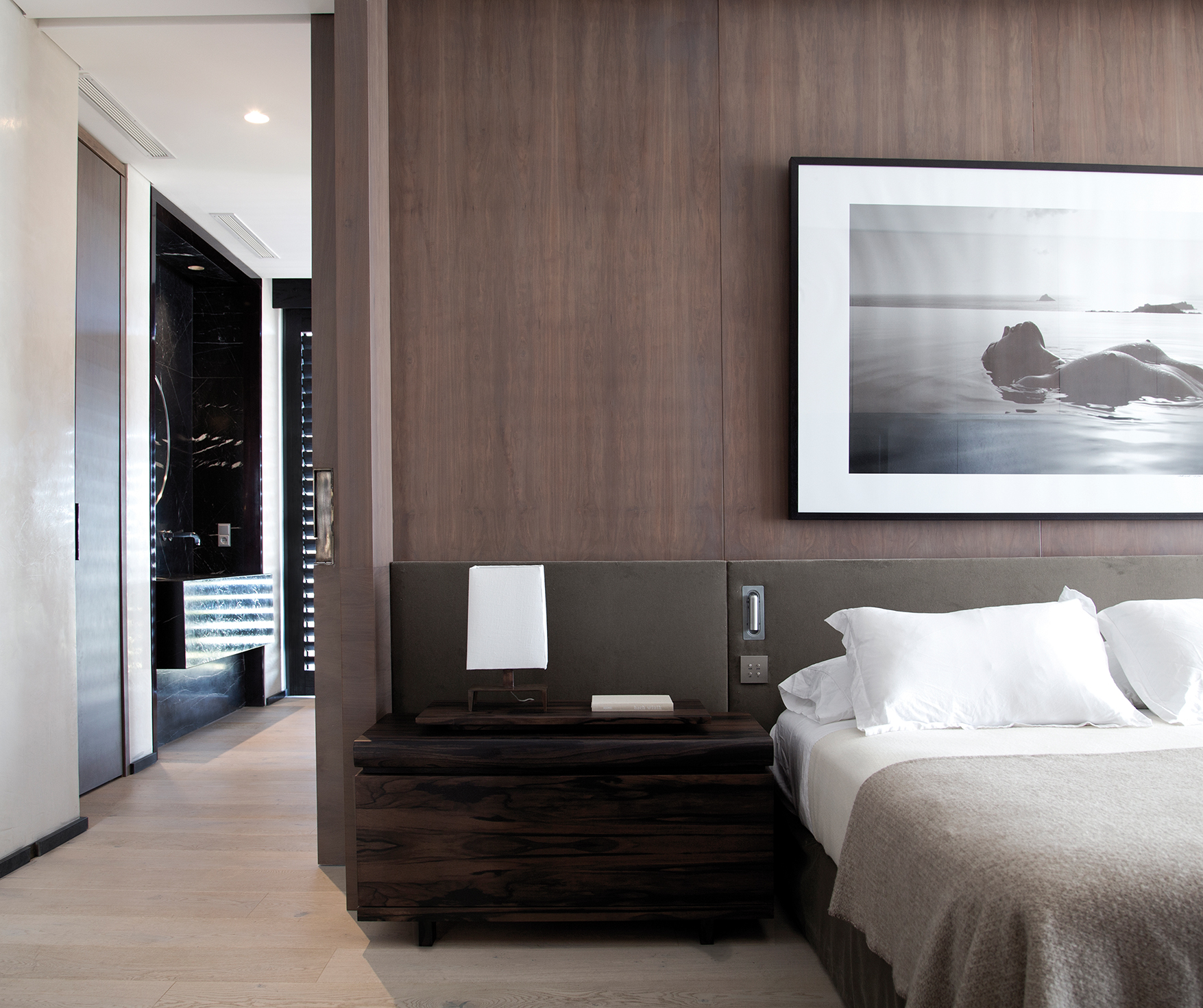 Piezas de mármol negro marquina fueron empleadas para generar las interfaces en la circulación. Aparecen integrando el comedor con la cocina, el hall de circulación con el baño social, en el dormitorio, los vestidores y el baño. Los enormes ventanales lucen cortinas en back out y otras con gruesos listones de madera que a modo de persianas aportan contención a la amplitud que ofrecen los espacios interiores. Las puertas se mimetizan con las paredes y en algunos casos, como la cocina o los dormitorios, están revestidas en gamuza color gris. Tiradores y herrajes en metal se presentan como detalles que acentúan el espíritu varonil de la escenografía propuesta por Balut. La iluminación cenital se apoya en luminarias belgas, especialmente importadas, con aperturas breves, con lo cual el carácter es dramático,
