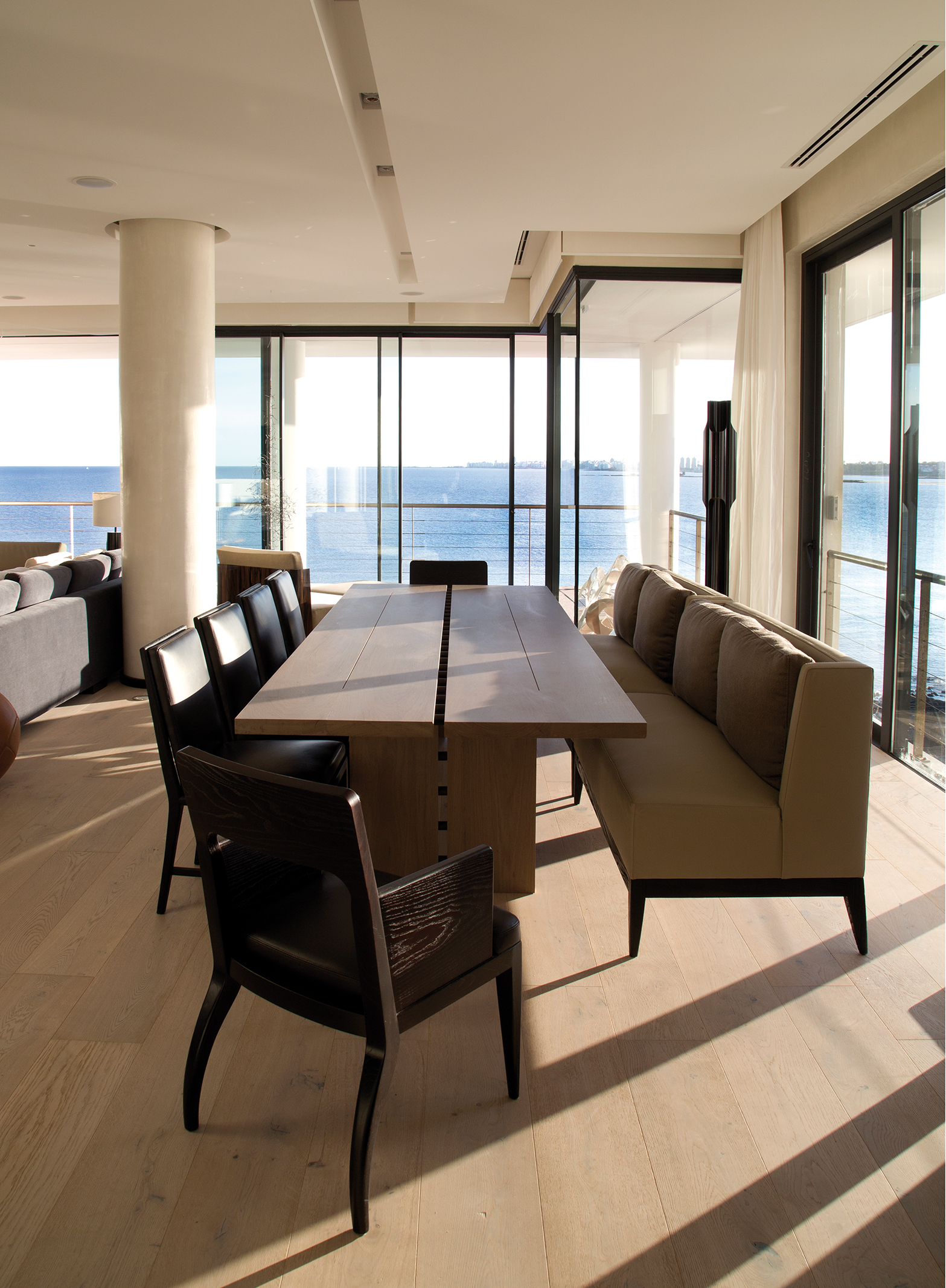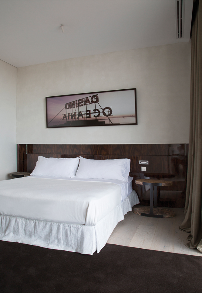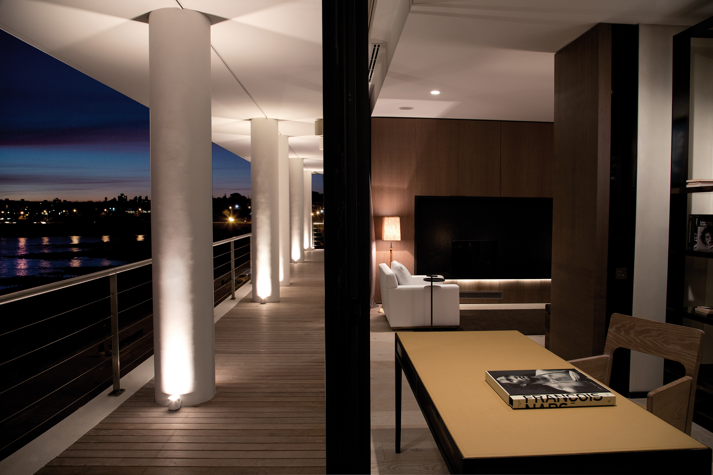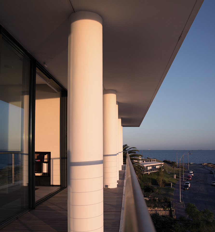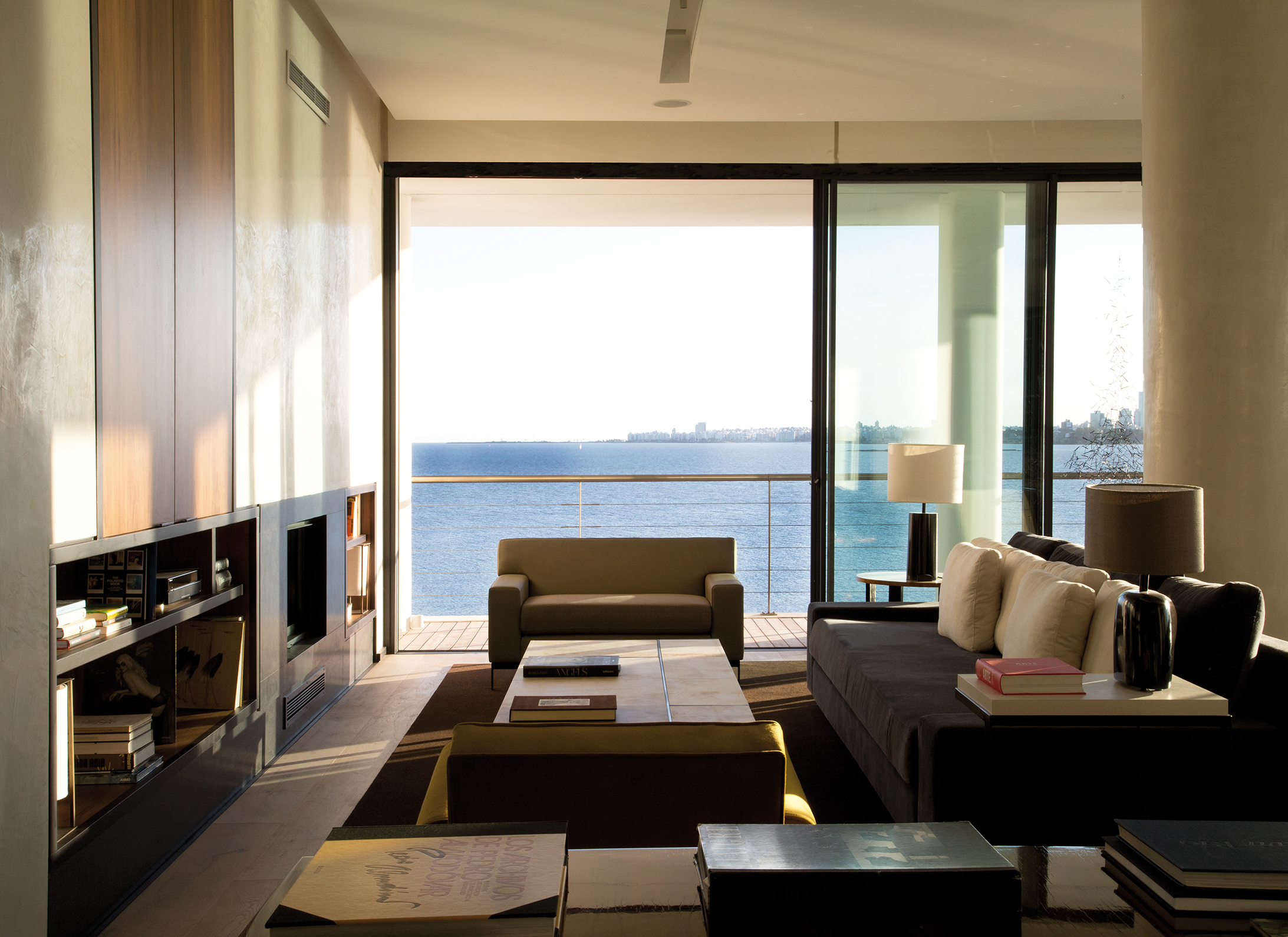 La intervención en una de las plantas del legendario edificio que originalmente contenía al Hotel Oceanía ofreció una fantástica oportunidad para que Balut desplegara su idea acerca de la resolución espacial del apartamento. Volcado hacia la costa del mar dulce, como lo denominara Solís al descubrirlo, el edificio ocupa uno de los predios con mejores vistas que ofrece la costa montevideana. El diseño de planta propuesto por Balut se apoyó en un dato significativo; doscientos cincuenta metros cuadrados de planta, a los que se suman otros cien de terrazas y enormes ventanales estableciendo un precioso perímetro. Las columnas circulares originales rescatan el espíritu art decó del edificio. Sobre ellos, Balut operó como un cirujano, generando una espacialidad rica que incluye paseos interiores con circulaciones inteligentes donde desplegó poesía. El trabajo de Balut comenzó con la obra de remodelación de la estructura. Aprovechando esa circunstancia generó una planta a medida que atiende la idea sobre la cual el diseñador concibió el espacio para su habitante.