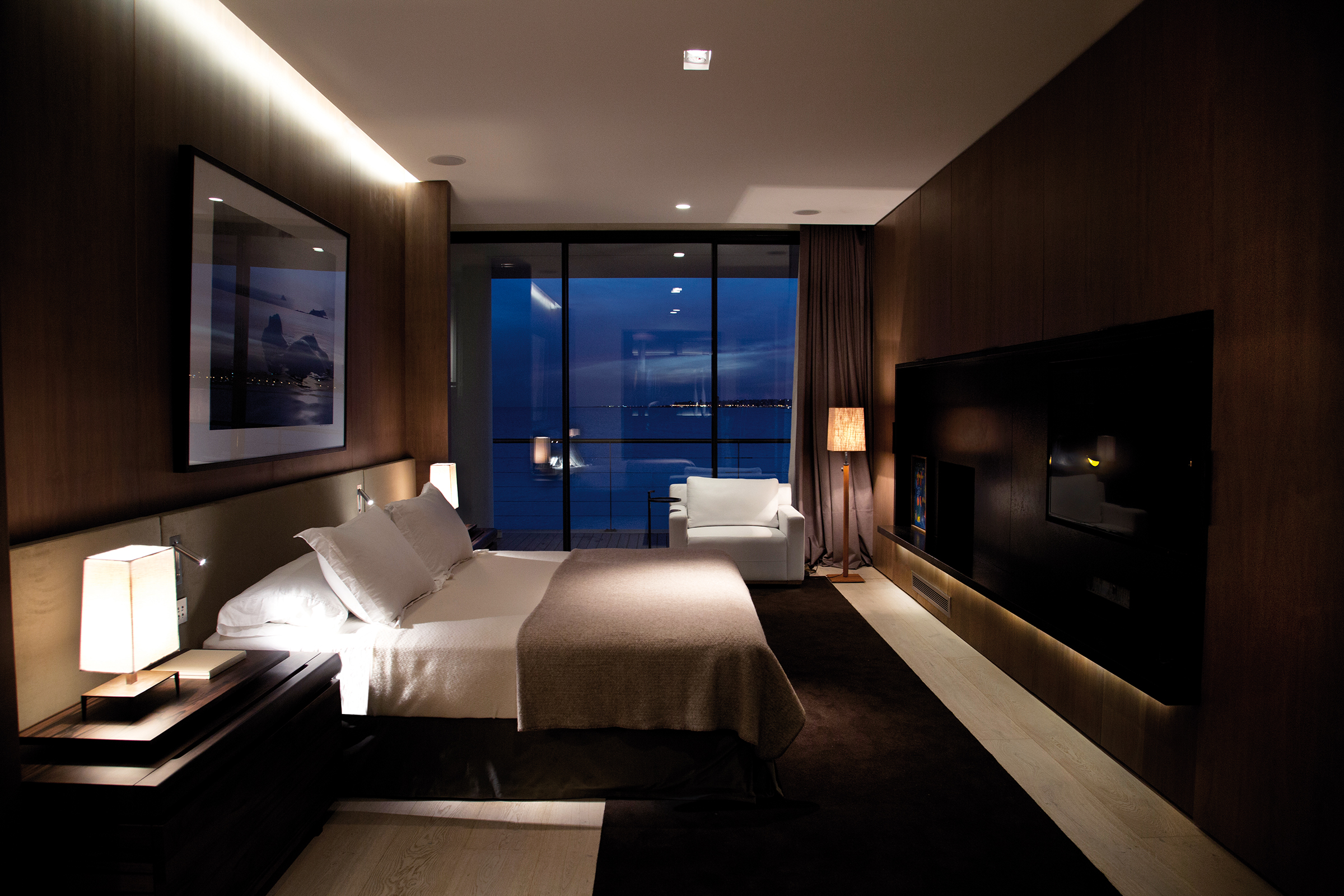 La intervención de Hassen Balut en un piso del nuevo edificio OCEANIA nos enseña un espíritu donde el confort alcanza un nivel distinto. La atmósfera lograda por el profesional es sugestiva y promueve magia y encantamiento. La planta, re definida por el diseñador, se vuelca hacia esa ensenada de poesía a la que los montevideanos denominan “la curva del ensueño”. La atmósfera es varonil, las paredes fueron revestidas con estuco veneciano, técnica centenaria que confiere una textura especial a las superficies. El color es claro, casi blanco y dialoga con el rubio desde los matices que proponen las piezas de roble de malasia que revisten el pavimento.