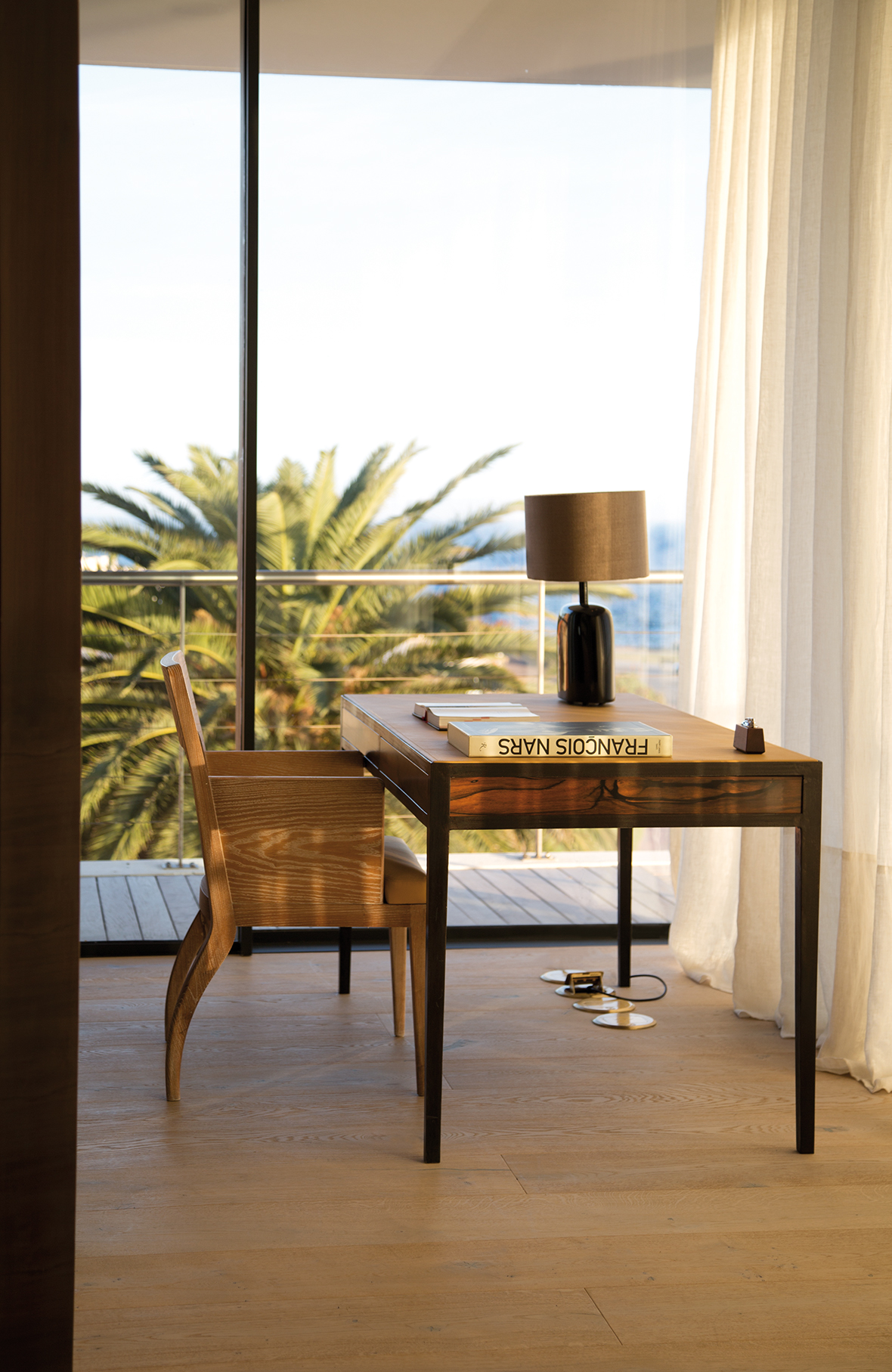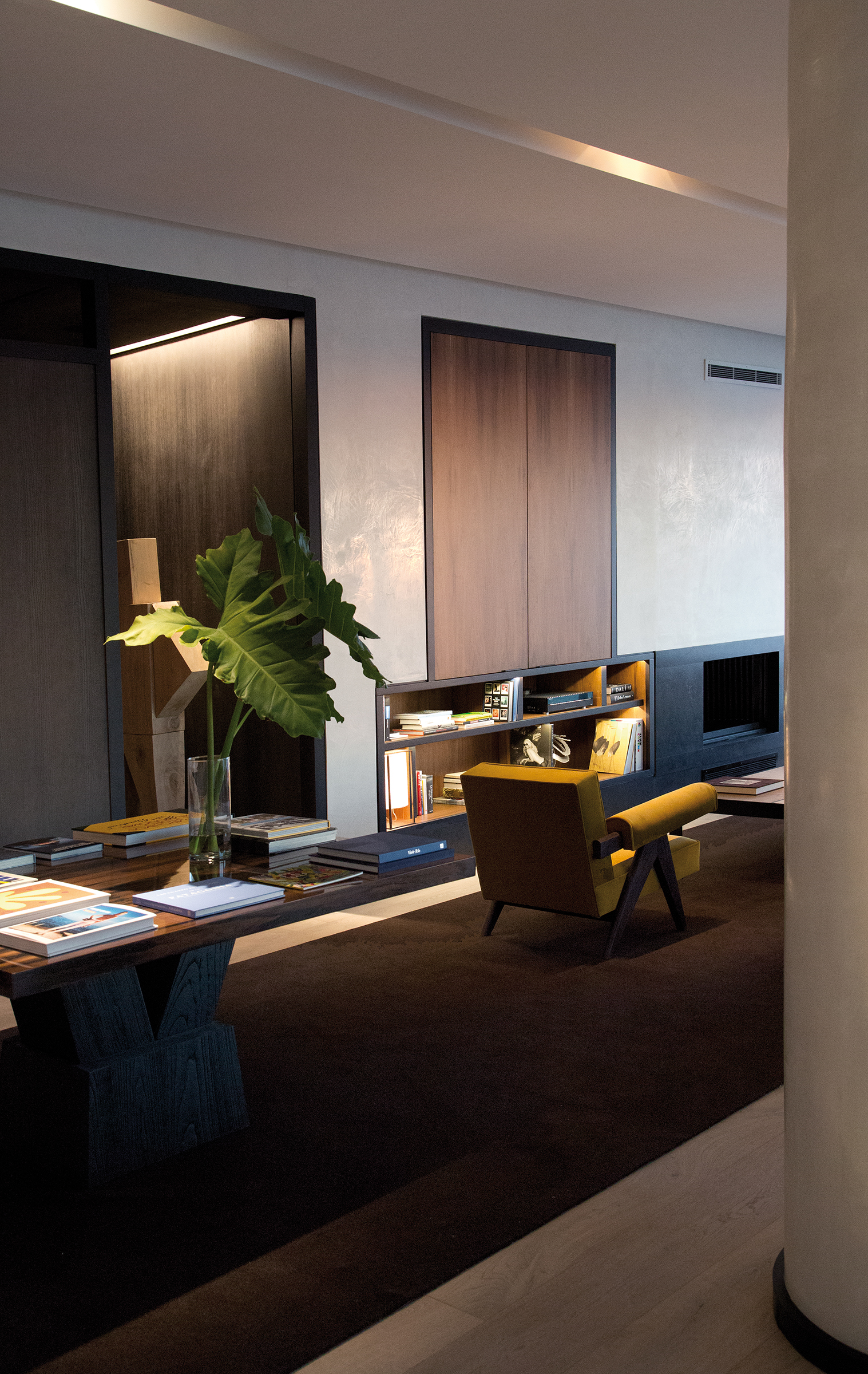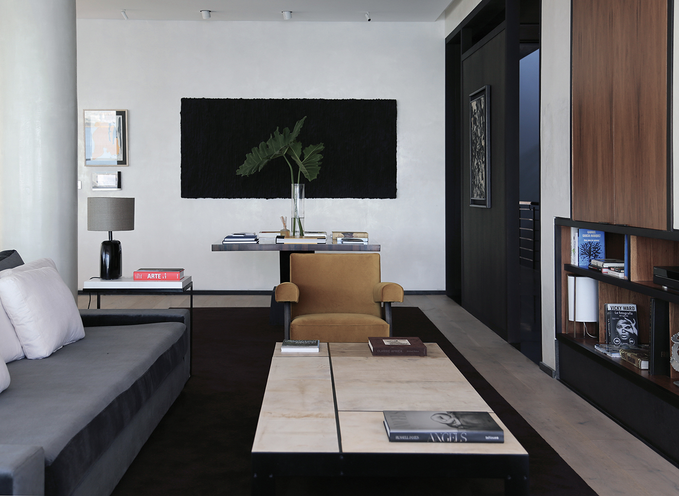 Al momento de resolver el equipamiento, Hassen Balut desplegó la idea sobre las que se establecieron las necesidades culturales y espirituales del habitante. En base a ello, se diseñó y construyó cada pieza de mobiliario, recurriendo al mercado local solo para los complementos o aquellos muebles que era necesario para completar las distintas escenas. La marcada influencia estética que marca la obra de Hassen Balut lo vincula con el trabajo artesanal de los viejos muebleros europeos, los mismos a los que podemos identificar como precursores del interiorismo, antecesores de lo que hoy denominamos diseñadores de interiores. En la zaga que conforma la biblioteca de Balut, un personaje en particular cuenta con especial admiración, el francés Christian Liaigre. Los muebles diseñados para este apartamento se inspiran notoriamente en este creador, así como en Le Corbusier. Es el caso de las butacas y sofás que llamaron nuestra atención.