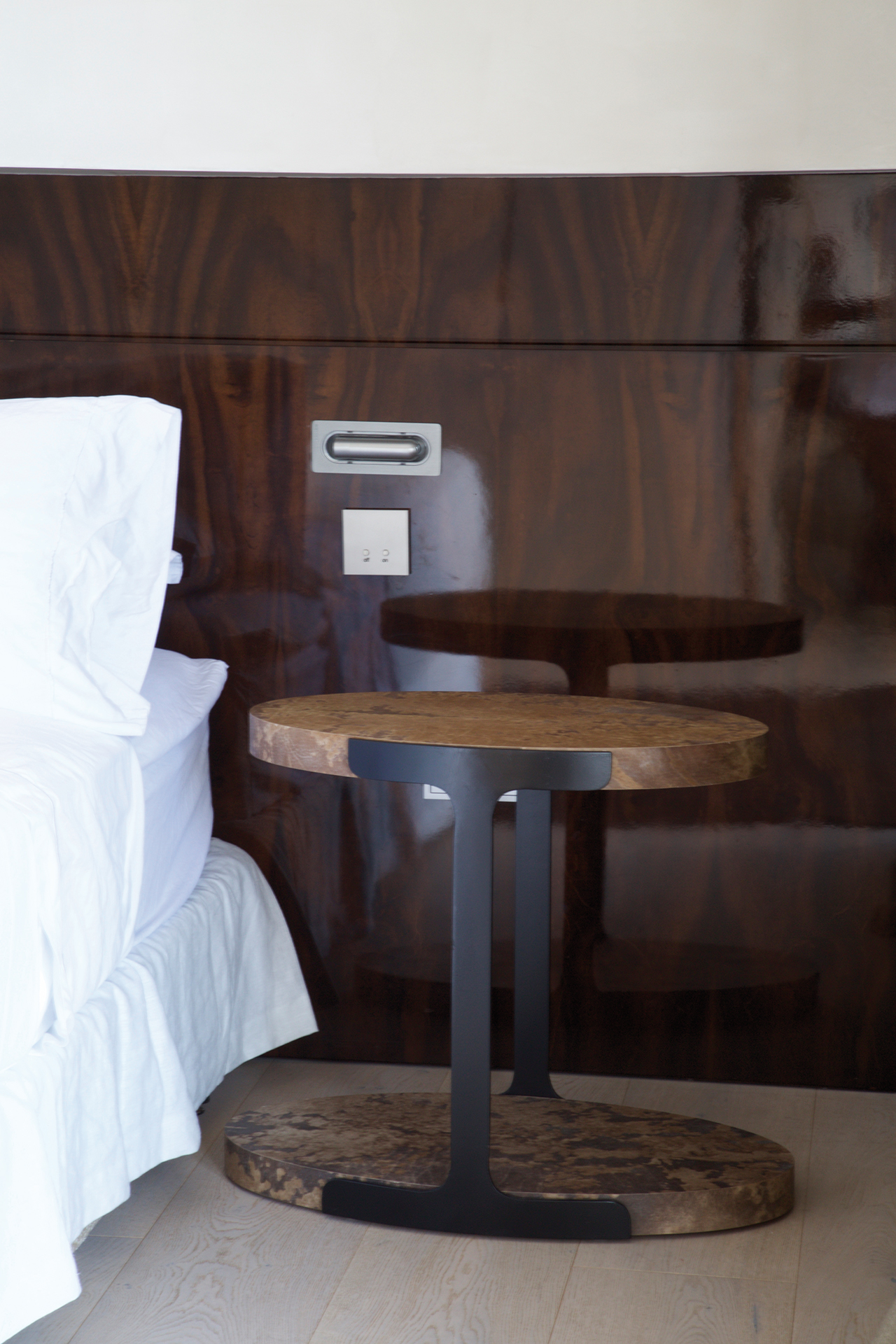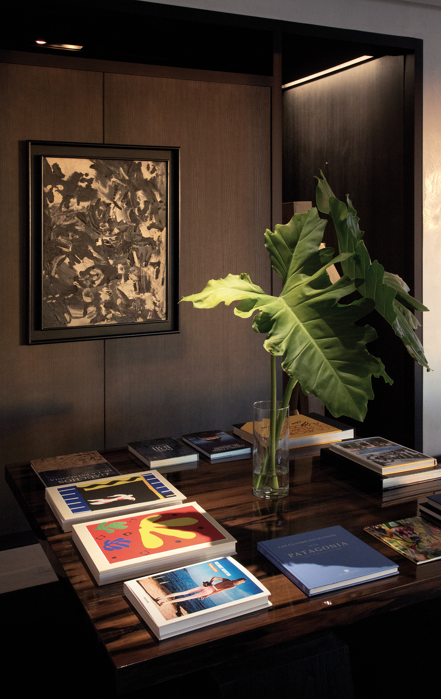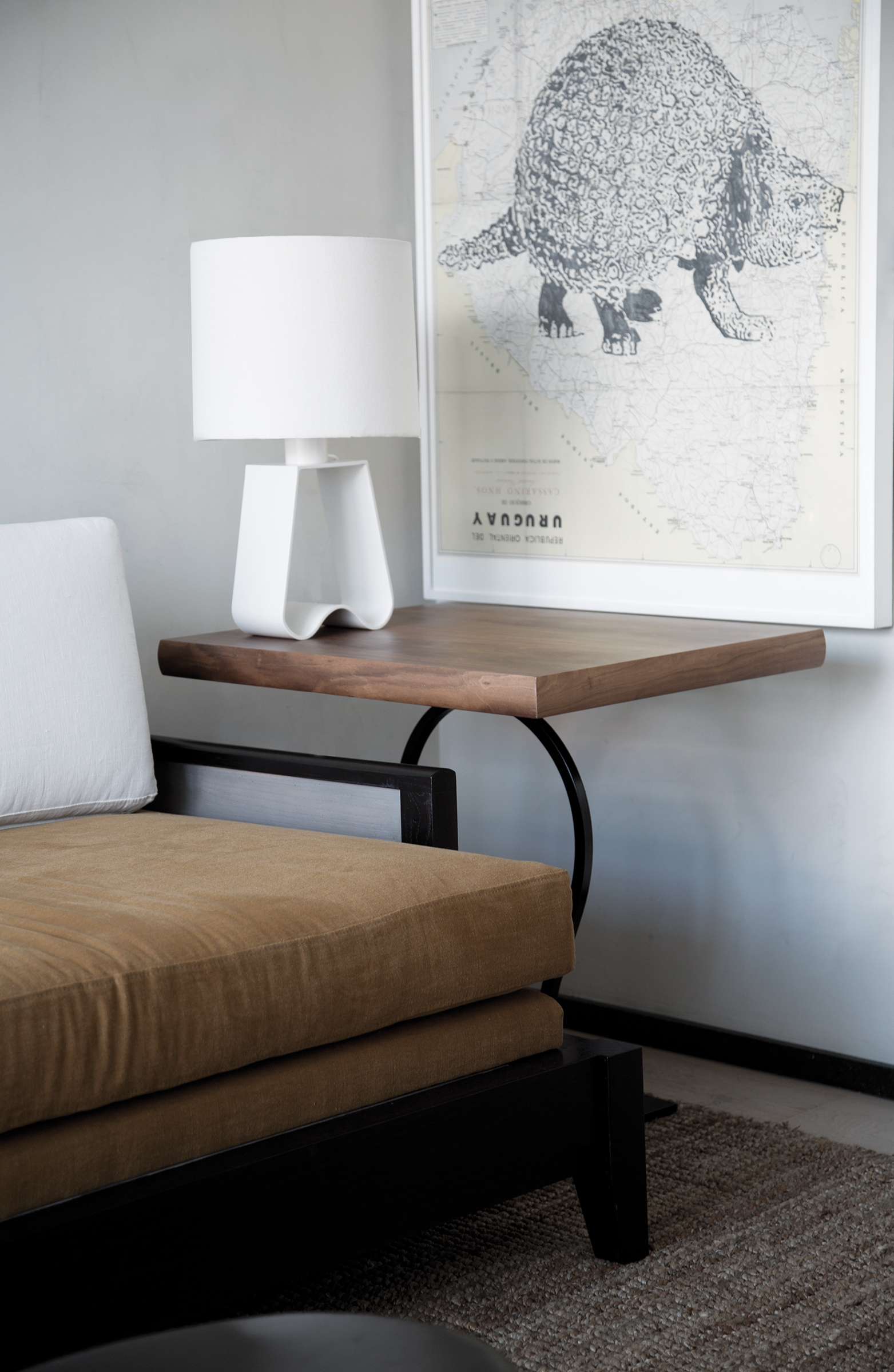 “Los muebles de asiento suelen establecer el concepto de la comodidad y el confort. Además de un ejercicio plástico, las butacas y sofás deben ser cómodos, atrapar al usuario y contenerlo con delicadeza, pero contenerlo…” afirma Balut. Llama la atención la presencia de obras de arte. Un personaje en madera de Joaquín Torres García, con una escala que no conocíamos, fotografías de Velazco y tallas en madera de Abdala. “…el personaje de Torres García integra un universo propio que he creado replicando al personaje del maestro. He fabricado 33 orientales y disfruto mucho al incorporarlos a mis trabajos. Luego la fotografía de Velazco es increíble, nos regresa el cartel original del viejo hotel que ocupaba al edificio. Es una toma increíble y además llega a medida de lo que nosotros buscamos al momento de concebir el espacio en este edificio. Con Abdala, sucede otro tanto. Y seguramente no es casualidad que trabaje con madera… El habitante es además un hombre de cultura plástica muy fina, hemos ubicado otras obras de arte con las cuales existe historia, vinculación, dialogo. Es importante asumir que los espacios humanos deben contener arte y libros.”