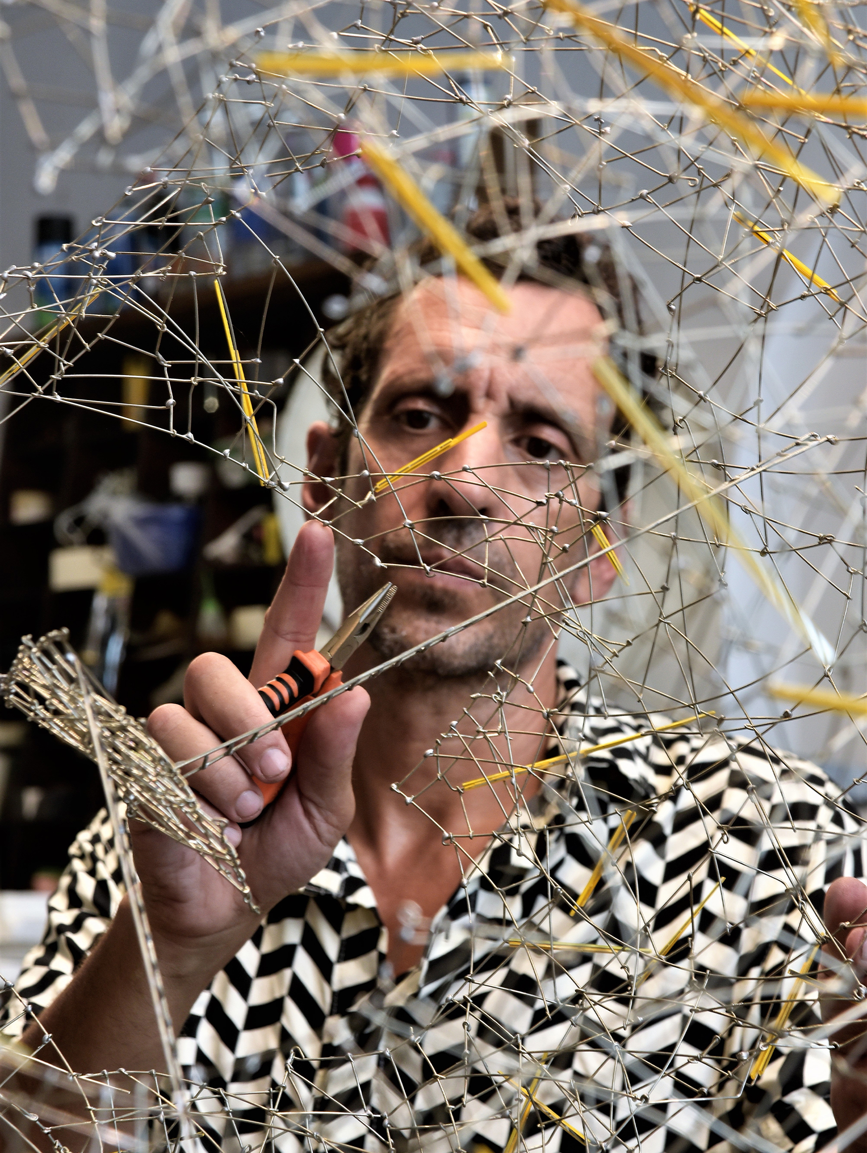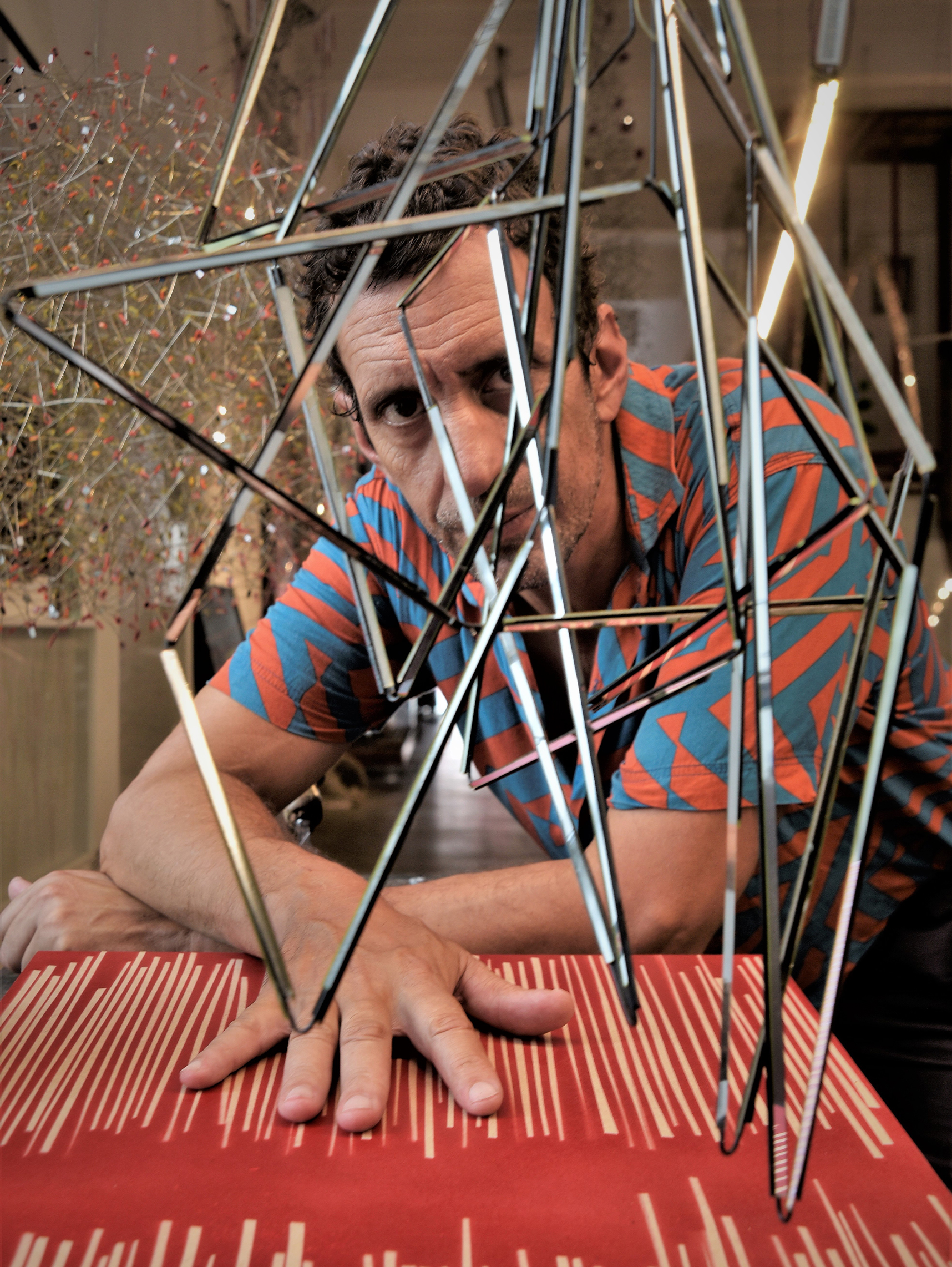 Su obra se distingue por la utilización de materiales como el alambre de hierro, que le permite «dibujar en el espacio» y crear estructuras que, al interactuar con el viento, generan movimientos sutiles y efectos lumínicos cautivadores. Estas piezas, que él denomina «familias de trabajo», son el resultado de una investigación constante y una curiosidad innata por explorar nuevas formas y expresiones artísticas. ​
