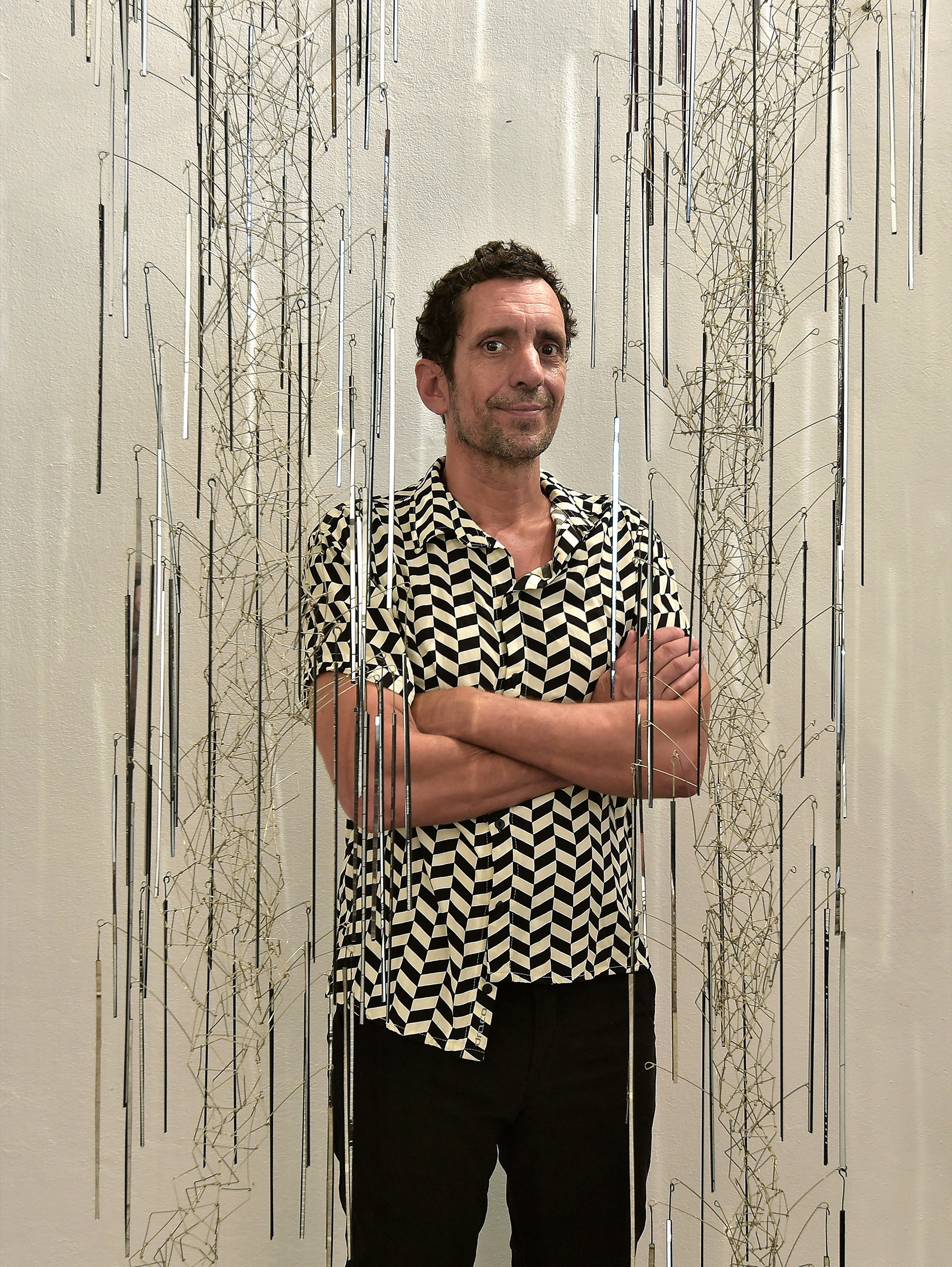 Su obra se distingue por la utilización de materiales como el alambre de hierro, que le permite «dibujar en el espacio» y crear estructuras que, al interactuar con el viento, generan movimientos sutiles y efectos lumínicos cautivadores. Estas piezas, que él denomina «familias de trabajo», son el resultado de una investigación constante y una curiosidad innata por explorar nuevas formas y expresiones artísticas.