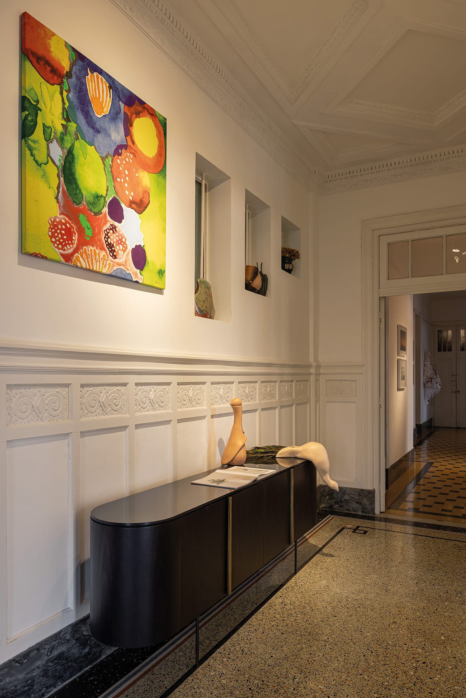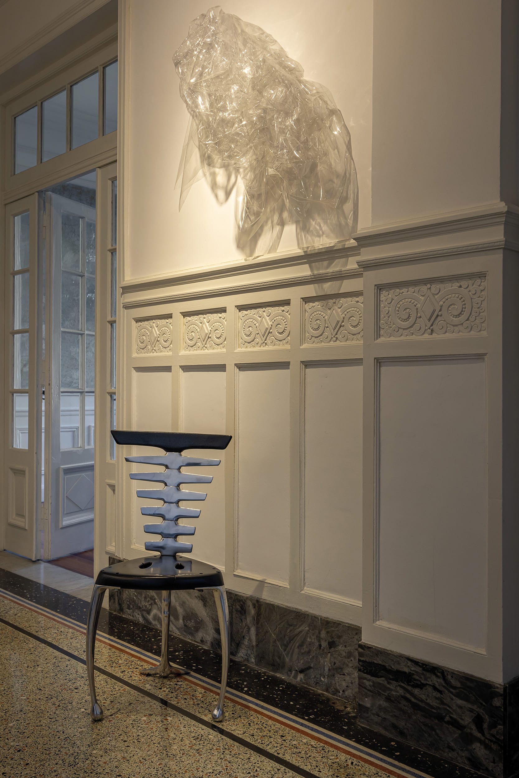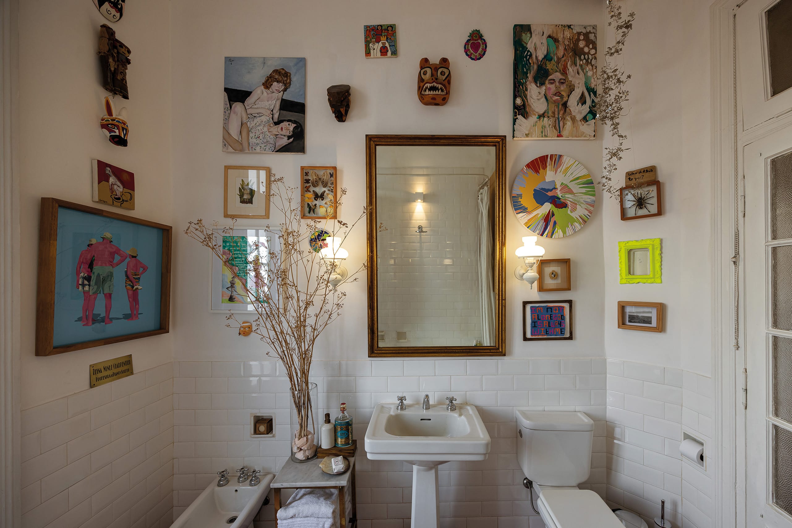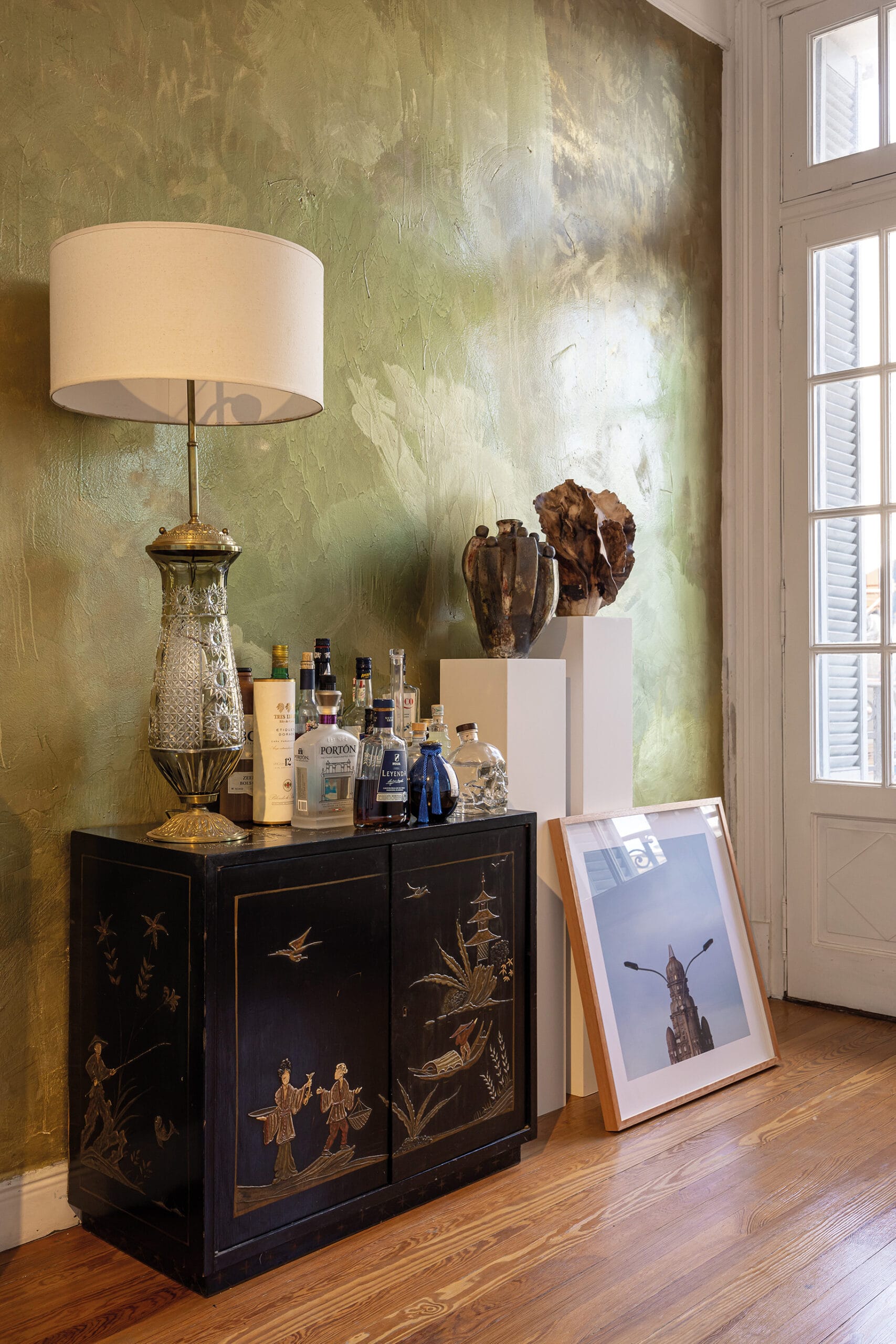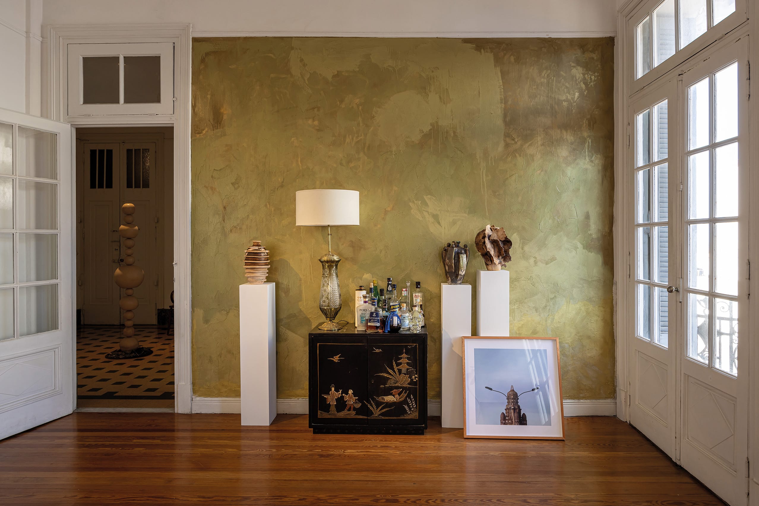 Ramiro Colinet, figura multifacética con una elevada sensibilidad por aspectos de la vida a veces ignorados, es diseñador de interiores, escaparatista y artista plástico. Siendo adolescente y procediendo del interior del país, en sus visitas a Montevideo fantaseaba con habitar aquel majestuoso edificio. Esa atracción casi magnética lo llevó, finalmente, a mudarse al Rex en 2020. “Yo llegué a él o él a mí”, reflexiona Ramiro. “Siempre me llamó la atención contemplándolo. Era una fantasía adolescente”. Tras regresar de la Art Basel en 2019, se cuestionó: “¿Por qué no volver a vivir en Montevideo?”. Comenzó la pandemia, pero estaba tan concentrado en poner amor al lugar que esa circunstancia pasó a un segundo plano. “Mi rutina diaria era rasquetear las paredes, recuperar los pisos y vitrales. No cambiar nada sino potenciar lo que es, como los pavimentos de monolítico. Hay cosas que son perfectas y merecen ser respetadas”.