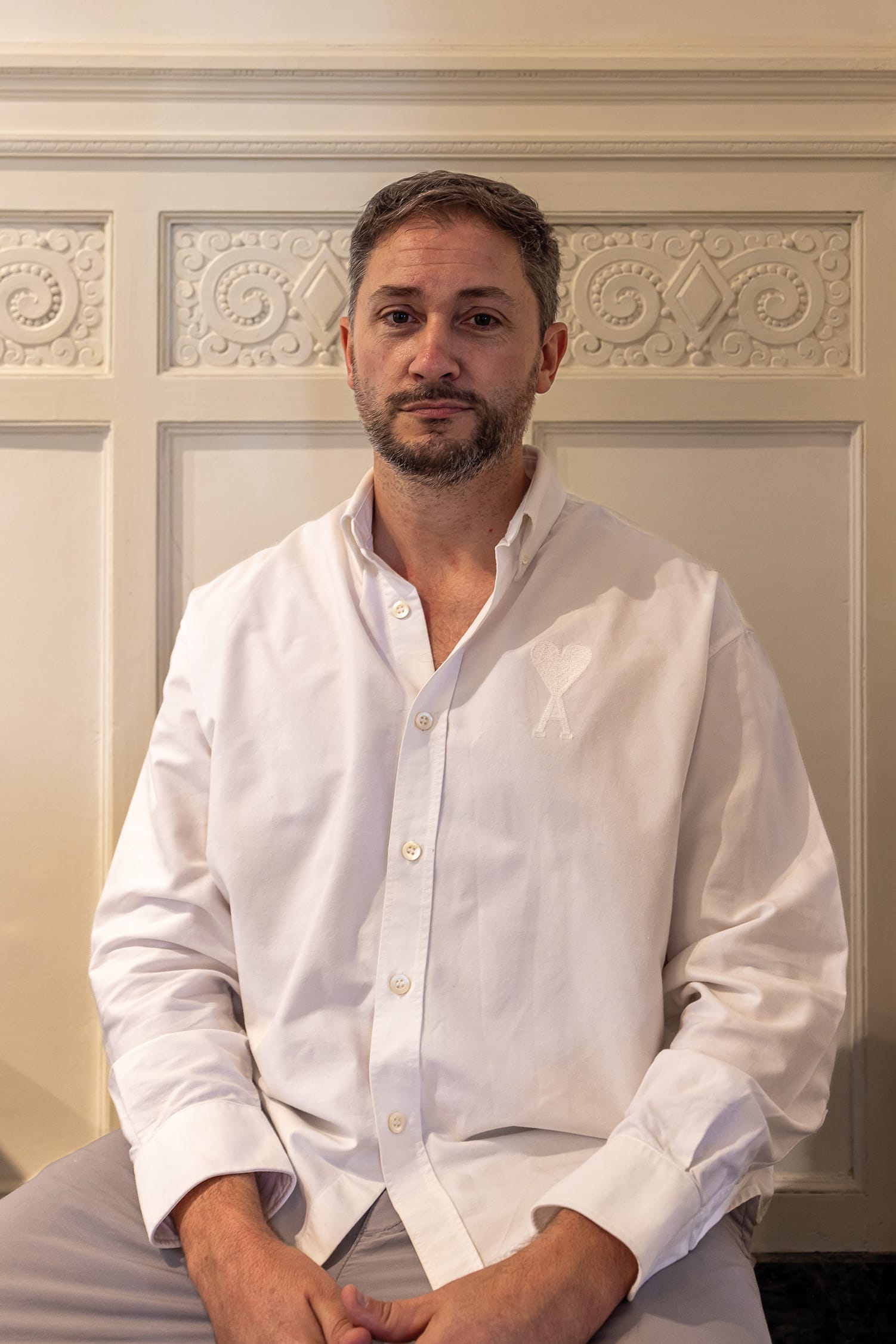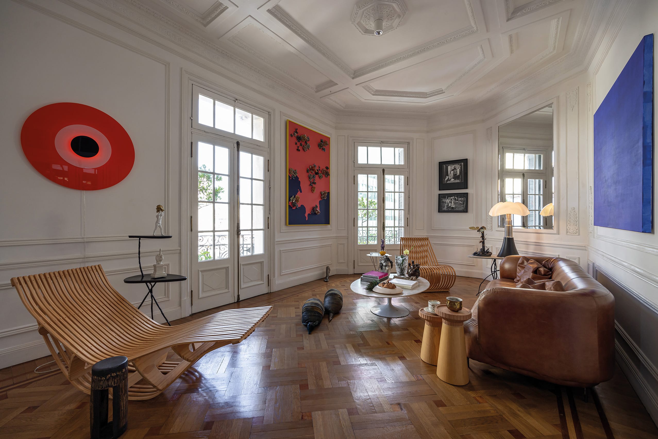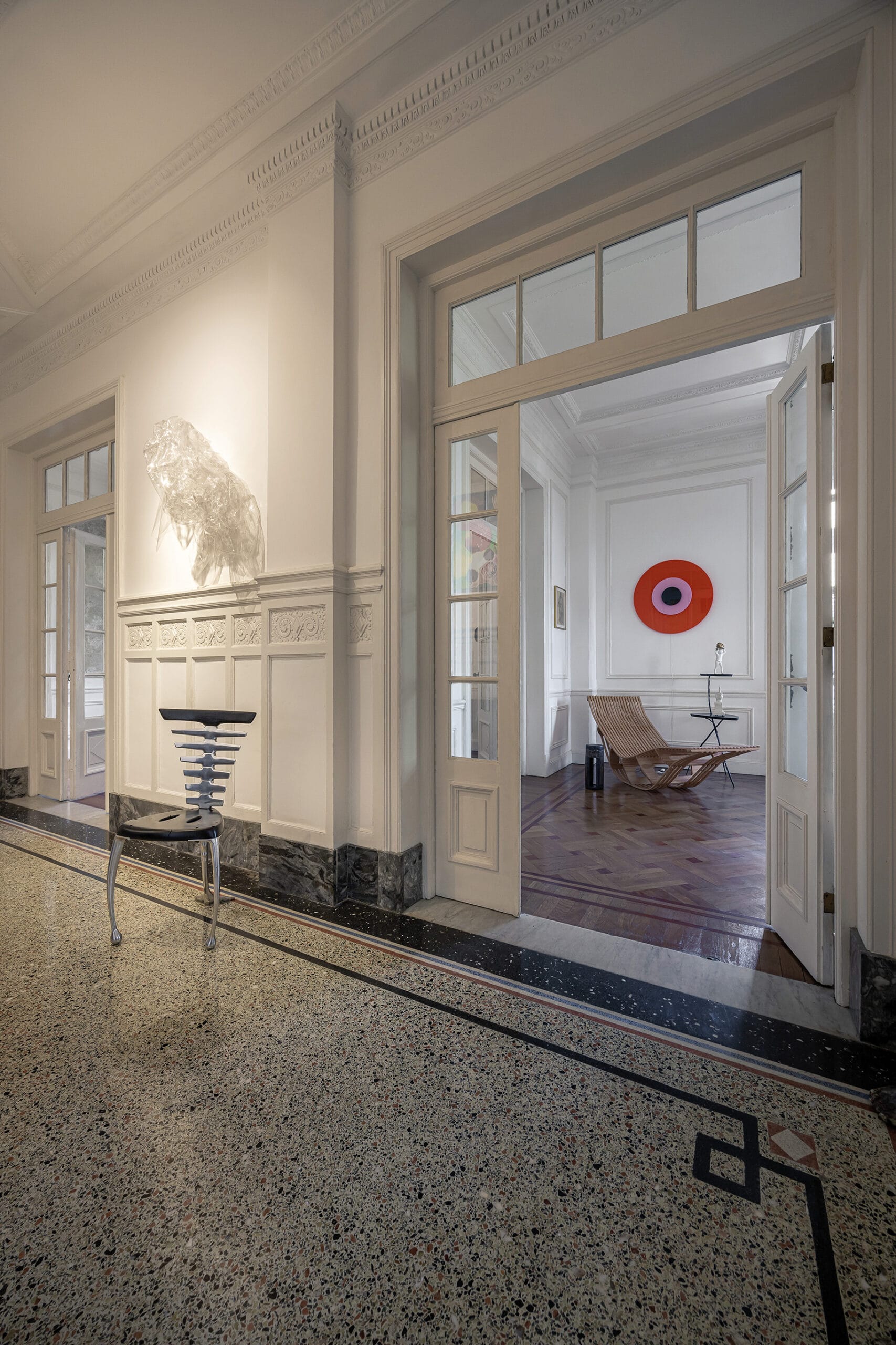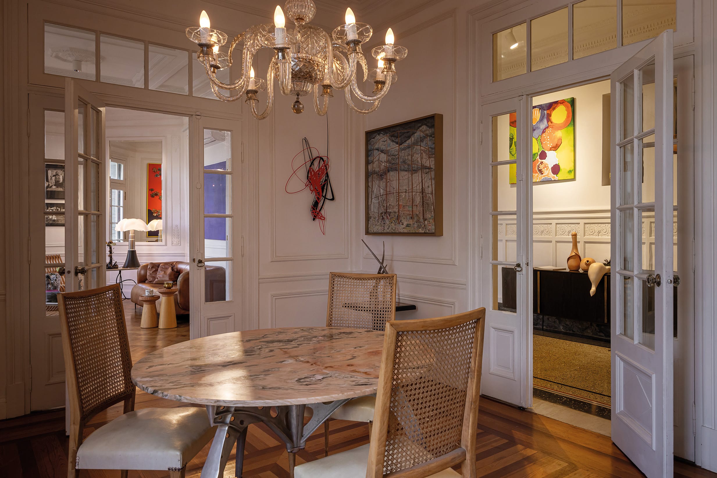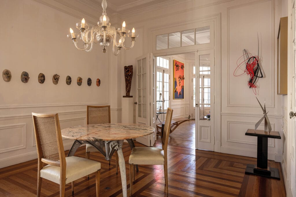 La energía del edificio lo enamora cada vez que sube. “La perspectiva de la Avenida Libertador es una de las mejores de Montevideo”. Entre las piezas que destacan en su hogar se encuentra también una lámpara Pipistrello, de la importante diseñadora italiana Gae Aulenti. “La mesa baja surge de piezas post destrucción, desarrollada junto con Gustavo Martínez. Tomé la mesada original de la cocina del Rex y la adaptamos utilizando hierros de desecho recuperados de la orilla del Río de la Plata”. La espacialidad del apartamento es notable. “Podés tener una visual completa de las áreas sociales del apartamento a través de las puertas acristaladas. Es muy escenográfico. Me gustan mucho las guardas que están en el comedor, que también están presentes en la Sala Zitarrosa y simbolizan la abundancia; son canastas. Jones Brown era experto y consciente de cada elemento en la materialidad y en todo lo que hacía. Tengo dos laureles topiarios en los balcones, que simbolizan el triunfo y se asocian a la historia del edificio”. «El aislamiento acústico es excelente, y el sistema de ventilación natural es perfecto. ‘No me gusta el aire acondicionado’, comenta. Reflexiona, por otro lado: ‘Lo que hoy proponen como amenities lo tengo dentro de mi apartamento: bañarme en una bañera inglesa, la espacialidad, las vistas y materialidades que hoy son inconcebibles. Hay tantos edificios así, menospreciados.” La escalera de mármol de Carrara que genera la circulación vertical, junto al ascensor con cabina de hierro, es otra de las joyas del edificio. ”El Rex era, es y va a ser arquitectura, tan simple como eso. Concebido para ser, durar y perdurar”. “Siento que soy un visitante del Rex. Han pasado muchas vidas en él. Por eso también la elección”. El Edificio Rex no es solo una construcción histórica; es un espacio vivo que continúa albergando historias y sueños, como los de Ramiro, quien ha sabido respetar y potenciar la esencia de este majestuoso edificio, fusionando pasado y presente en una simbiosis armoniosa.