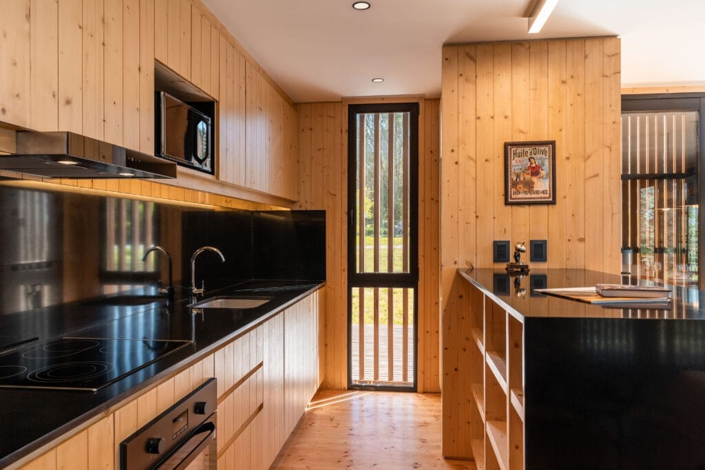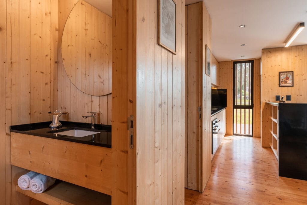 La economía de materiales aporta al encanto del volumen, los interiores mantienen la frecuencia natural con revestimientos de madera que se interrumpen en las aberturas resueltas con grandes piezas metálicas color negro que aportan el toque tecnológico. El equipamiento nos traslada hacia los años sesenta con piezas que más que recordar la época, la recrean con singular encanto.