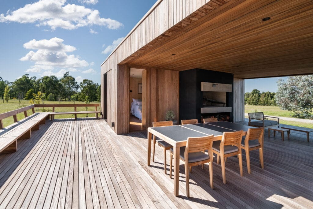 Haciendo referencia al bosque centenario y a la paleta de color del campo, los paramentos exteriores fueron revestidos en tablas de lapacho al natural colocadas de forma vertical y cubriendo de manera integra el volumen total.