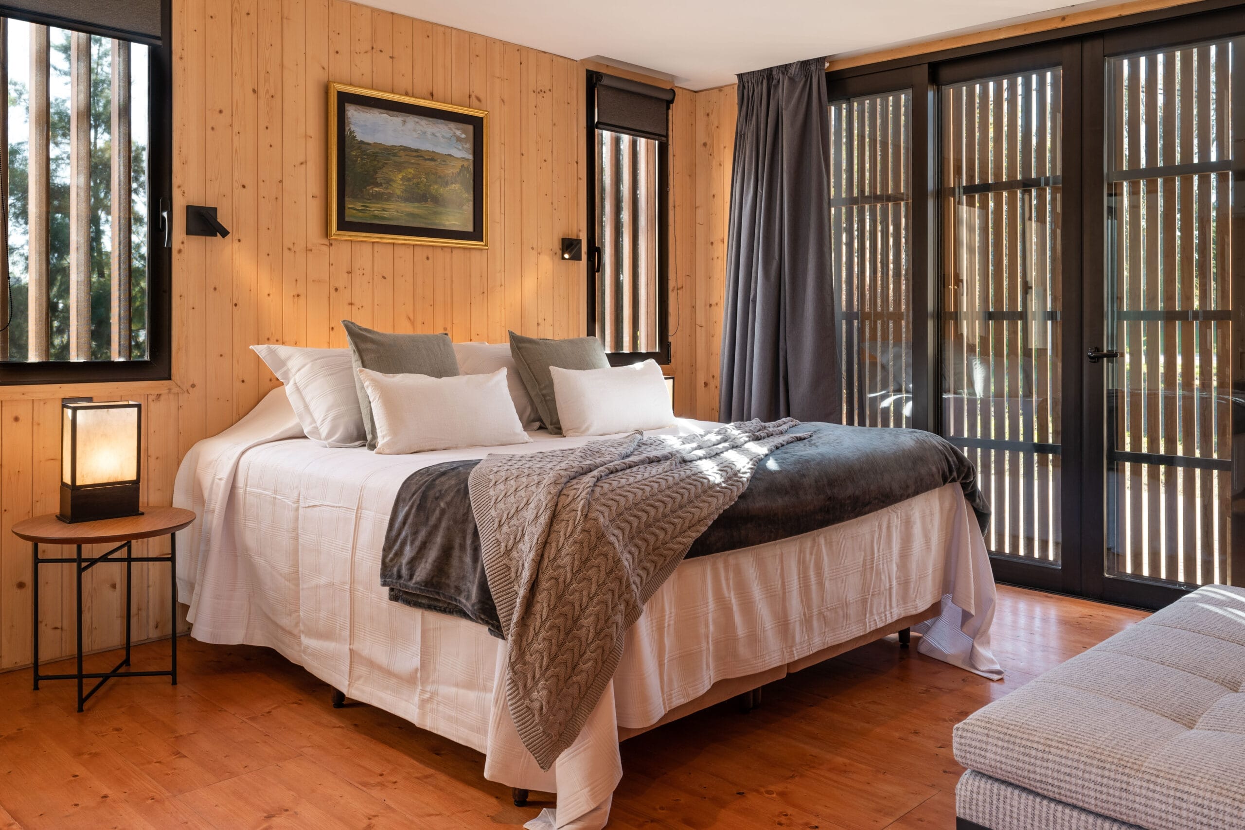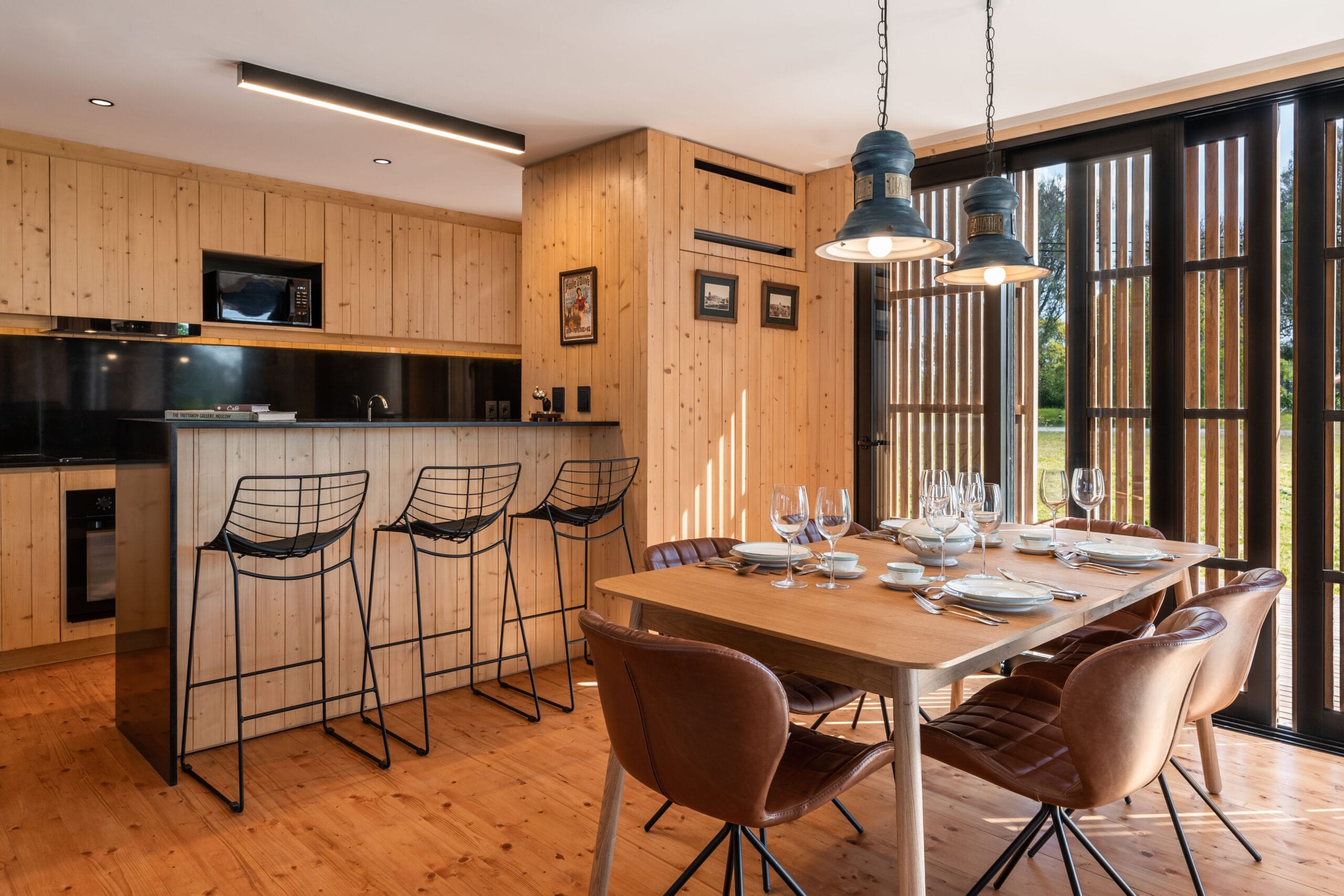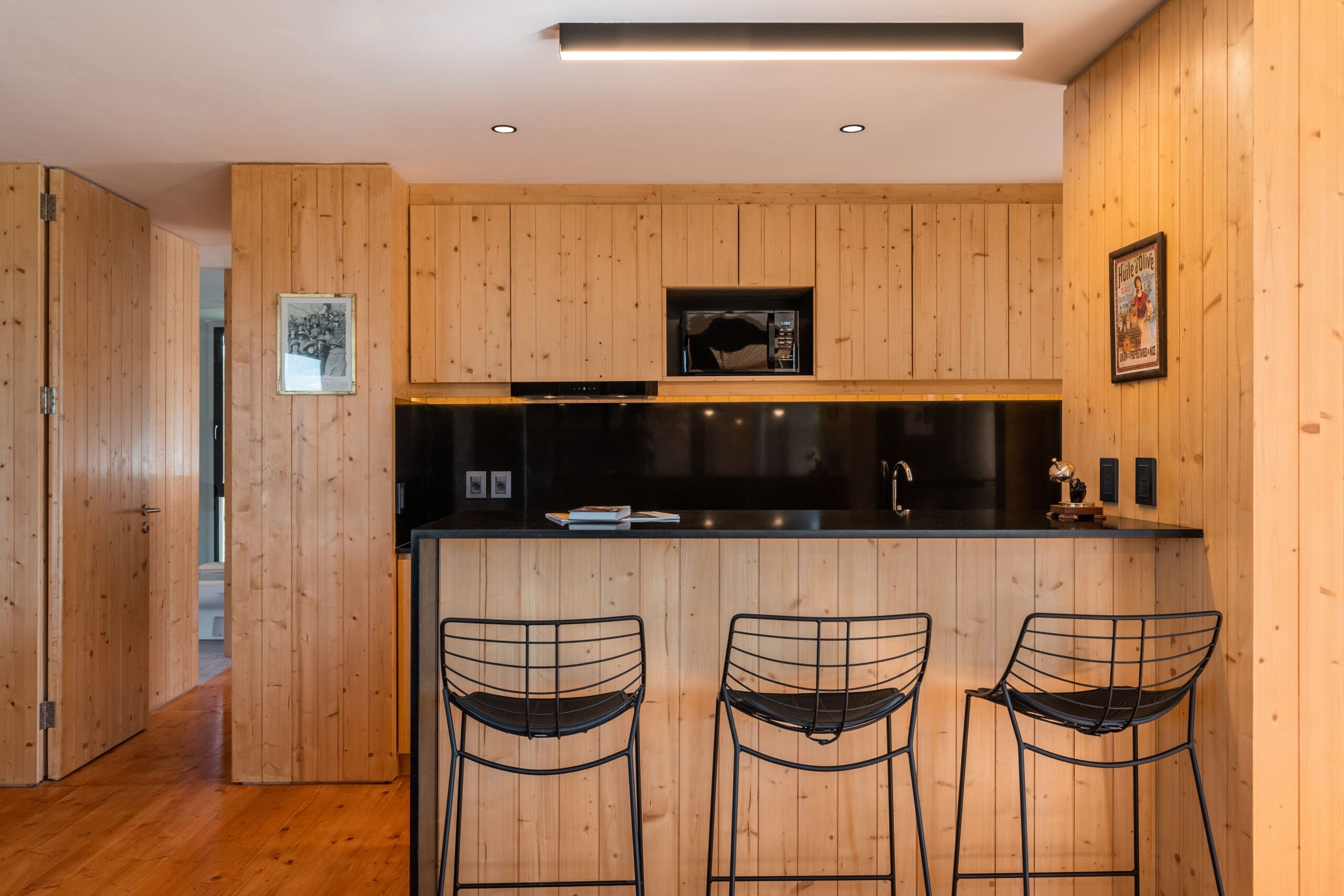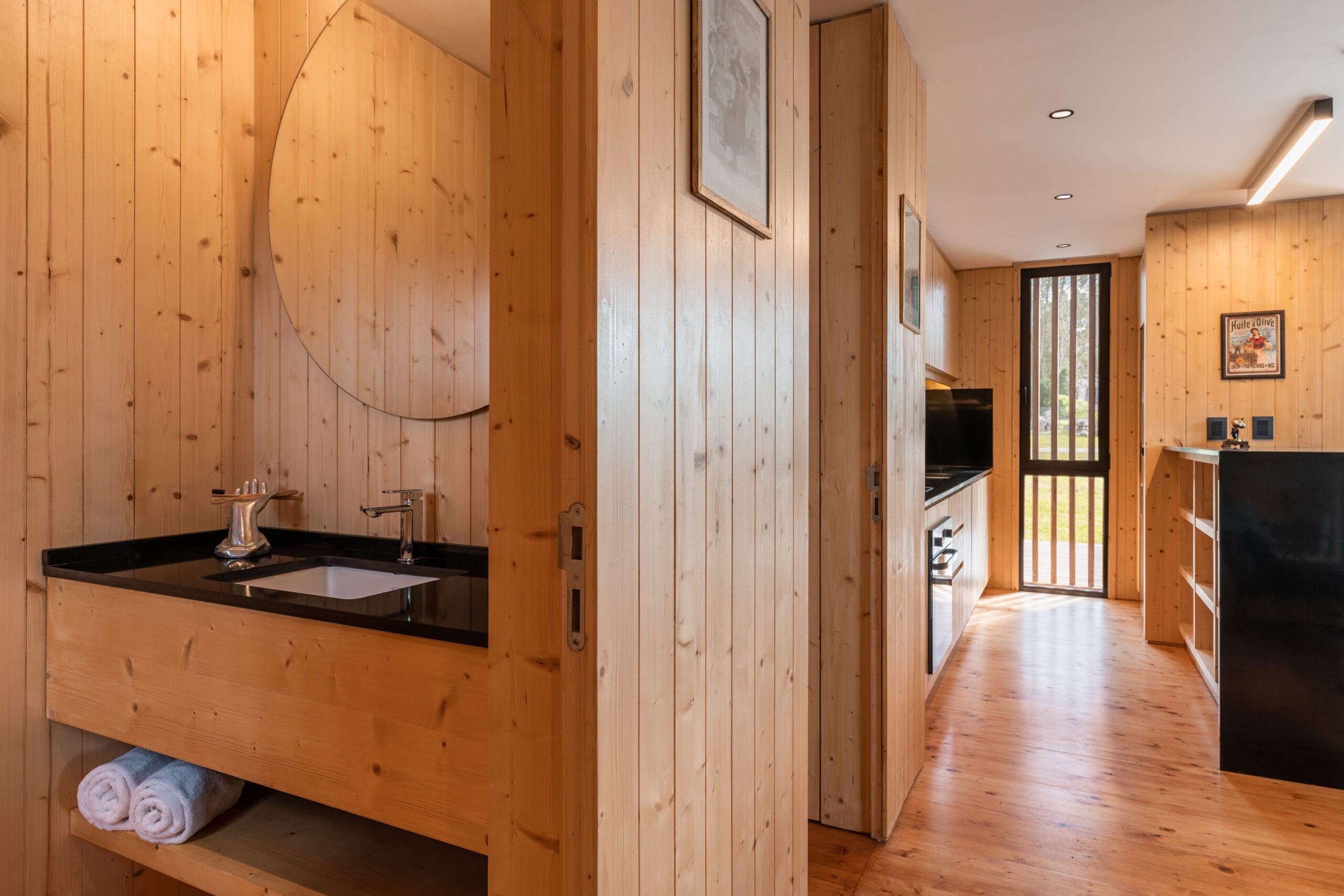 La economía de materiales aporta al encanto del volumen, los interiores mantienen la frecuencia natural con revestimientos de madera que se interrumpen en las aberturas resueltas con grandes piezas metálicas color negro que aportan el toque tecnológico. El equipamiento nos traslada hacia los años sesenta con piezas que más que recordar la época, la recrean con singular encanto.
