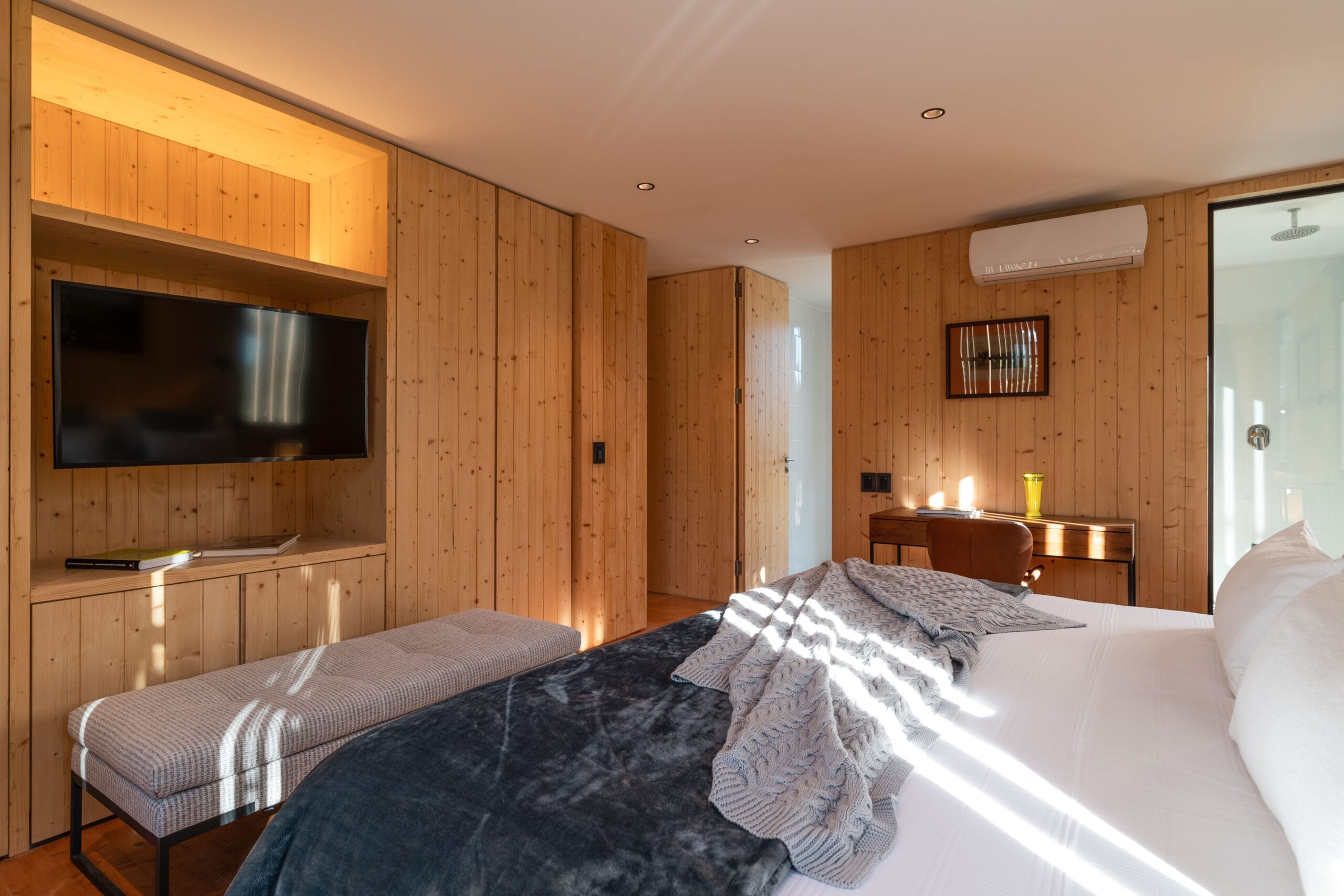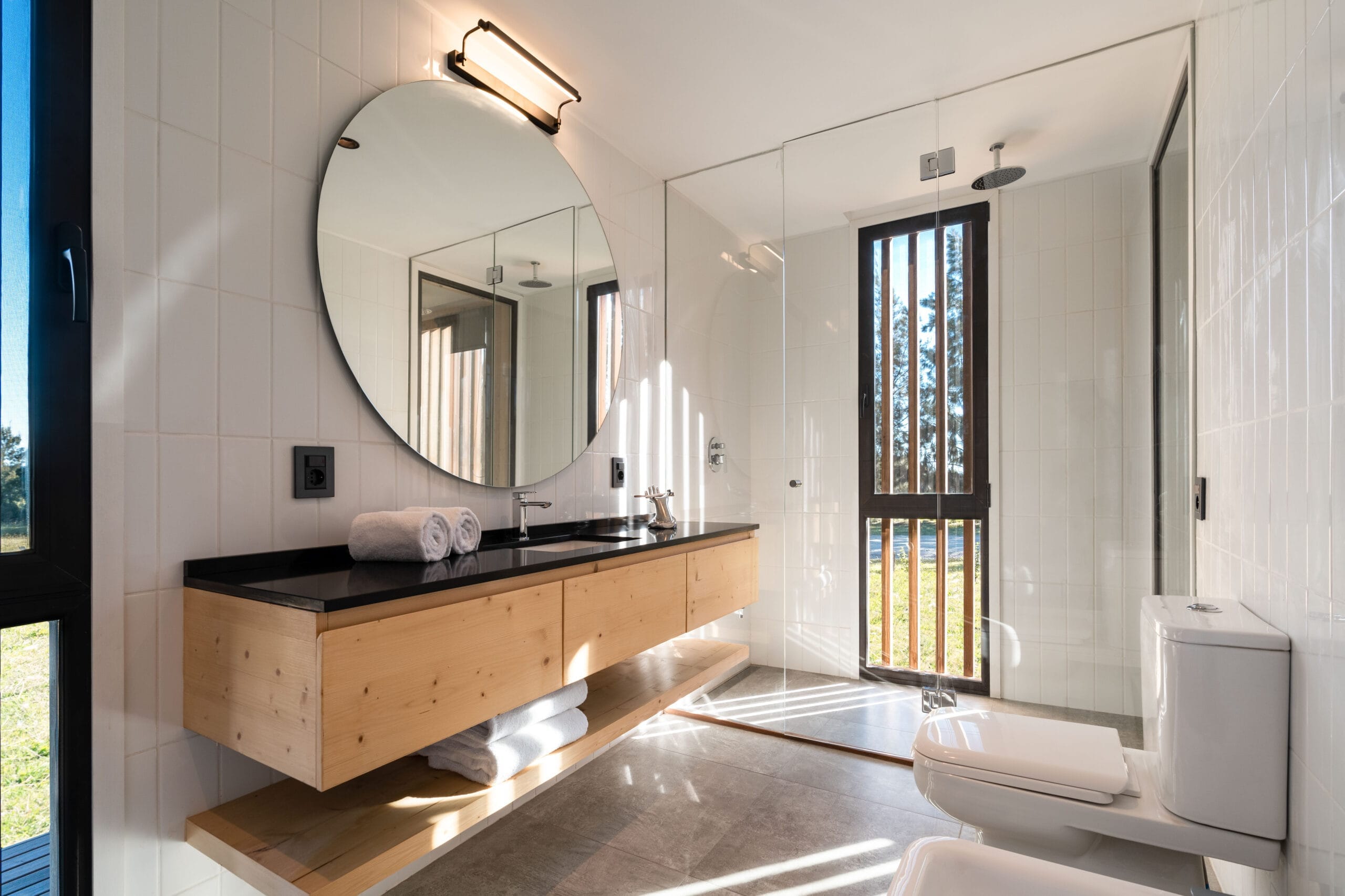 Un dormitorio principal con su baño en suite se le suma a este volumen principal. El segundo volumen está conformado por un dormitorio con baño en suite y un espacio destinado al lavadero. Ambos volúmenes están separados por el semi cubierto abierto a las vistas francas del campo, un espacio pensado tanto para el ocio como para la contemplación.