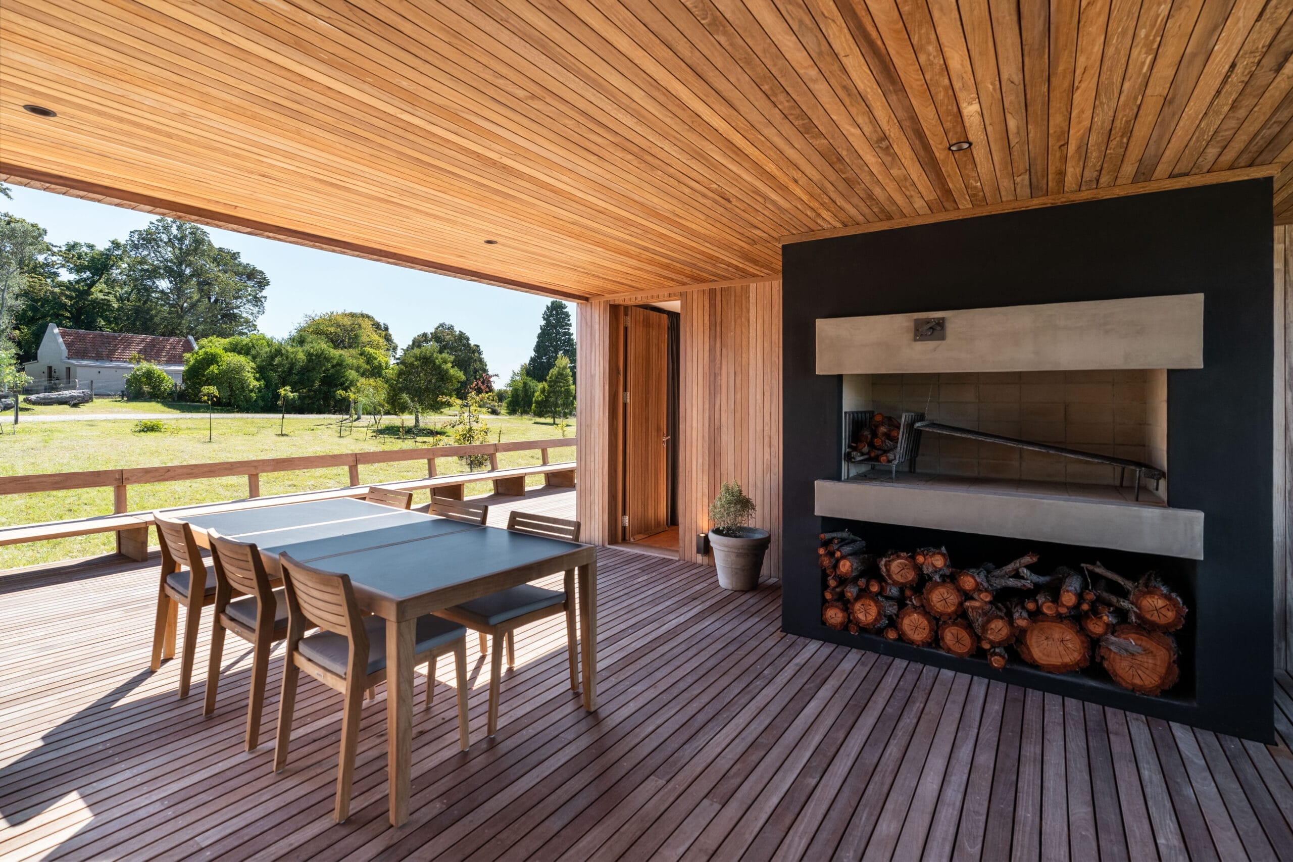 Haciendo referencia al bosque centenario y a la paleta de color del campo, los paramentos exteriores fueron revestidos en tablas de lapacho al natural colocadas de forma vertical y cubriendo de manera integra el volumen total.