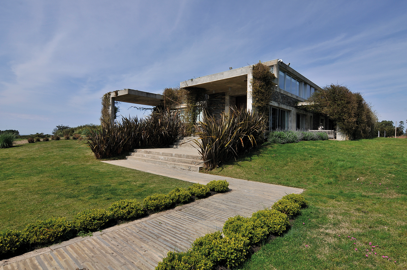 Ubicada en las sierras de Lavalleja, esta vivienda proyectada por Valentina Cibils se posa sobre una pendiente con la naturalidad de lo inevitable. Con guiños a la arquitectura colonial reinterpretados desde una clave contemporánea, la casa combina materiales nobles —piedra, hierro, madera— con una geometría serena y precisa. Una galería perimetral abraza el volumen principal, mientras una piscina aterrazada desciende suavemente hacia el paisaje.