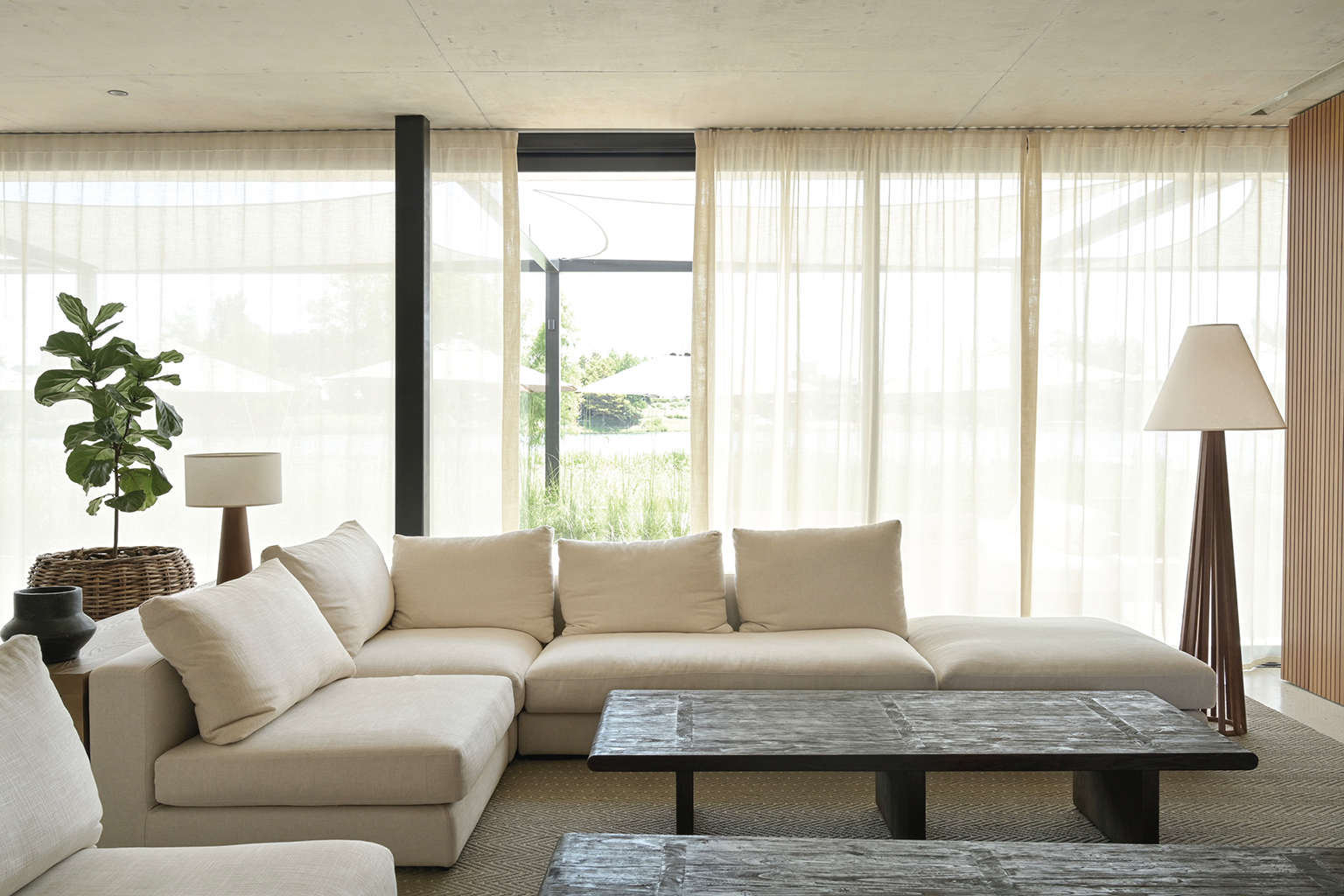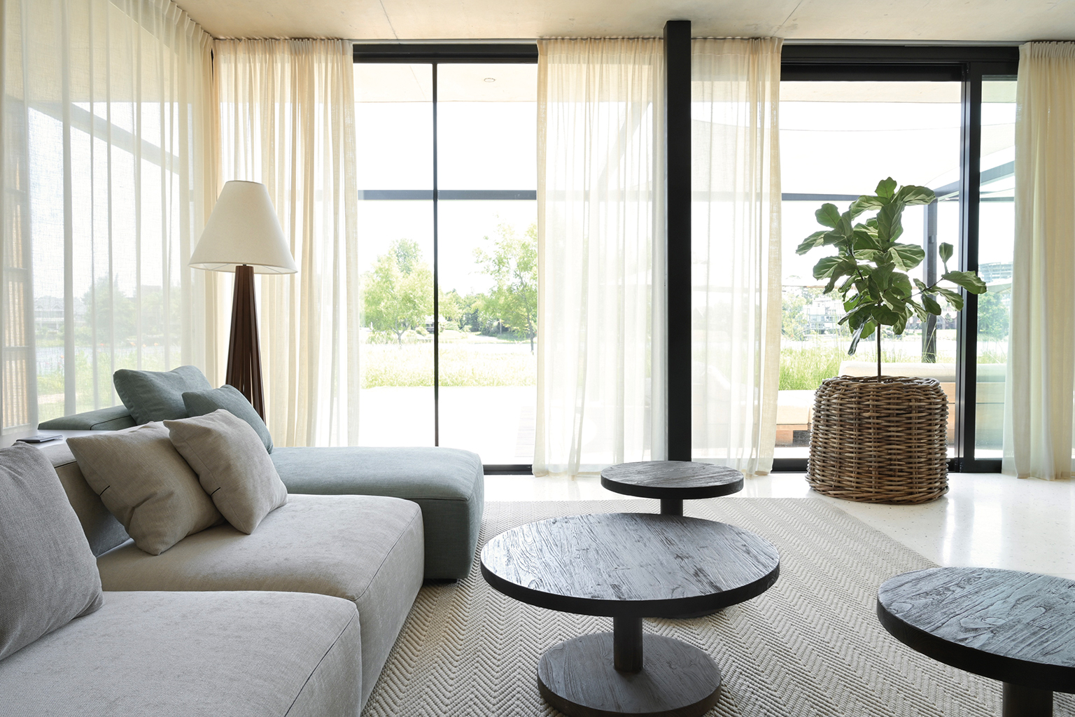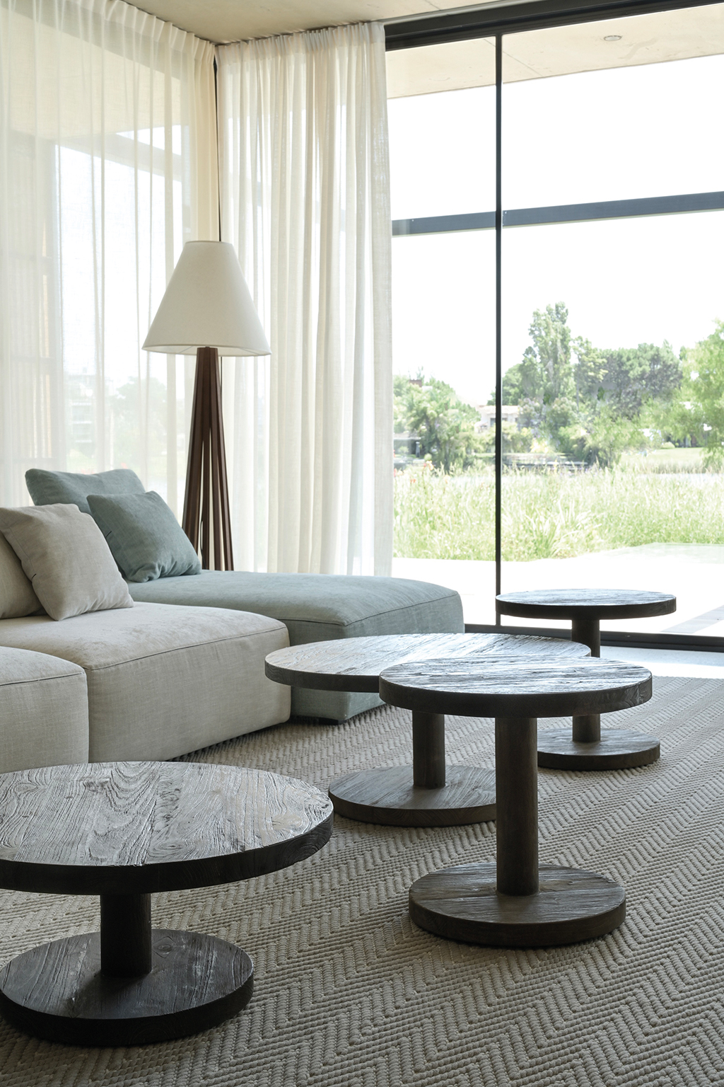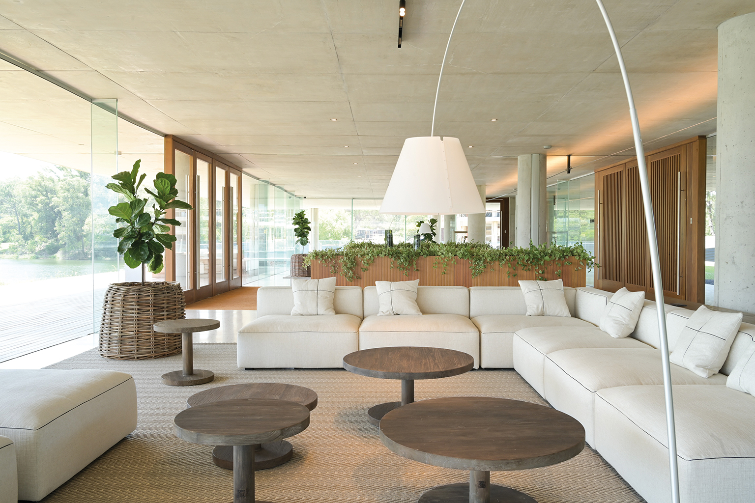 La disposición y elección del mobiliario cumplen con un rol fundamental en este sentido. Se emplearon piezas modulares y de baja altura, lo que no solo facilita la flexibilidad en la disposición según las necesidades de los habitantes, sino que también permite una integración visual con las vistas del lago, preservando la sensación de amplitud y apertura. Las líneas son limpias y relajadas, un reflejo de la arquitectura contemporánea, mientras que los tonos neutros en beiges, negros y grises aportan una elegancia discreta que no compite con el entorno, sino que lo complementa. En la zona kids de la barbacoa, la incorporación de colores pastel añade un toque de dinamismo sin perder la cohesión estilística. Los materiales empleados fueron seleccionados con extremo cuidado, priorizando aquellos de alta resistencia y durabilidad, capaces de soportar el uso frecuente sin perder su carácter estético. El equipamiento, importado especialmente de Europa y Brasil, otorga una impronta cosmopolita y distintiva que eleva la calidad de los espacios, reafirmando la identidad única del proyecto.
