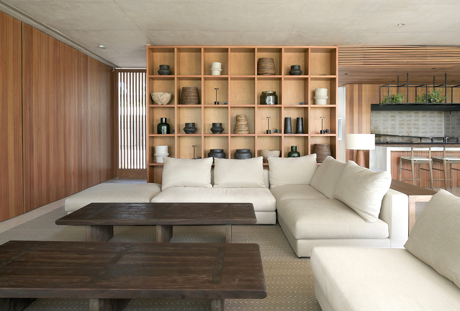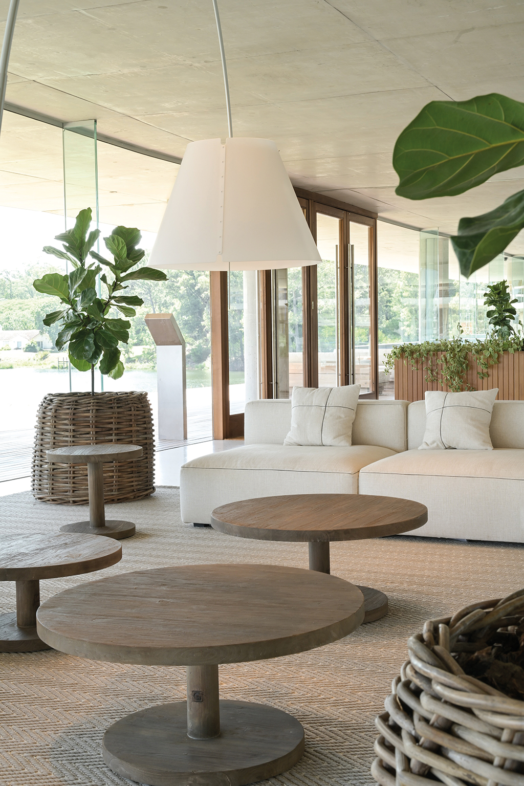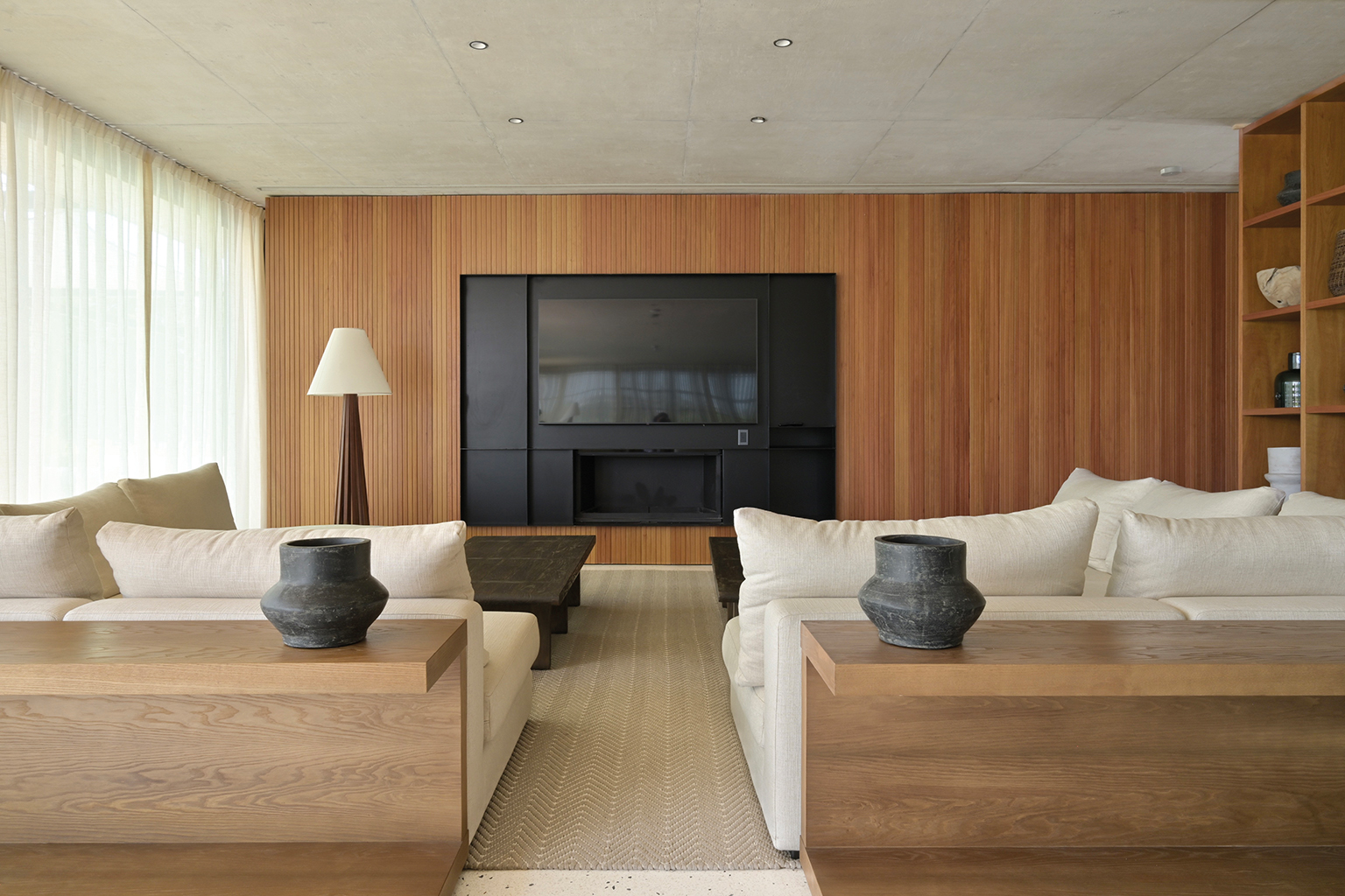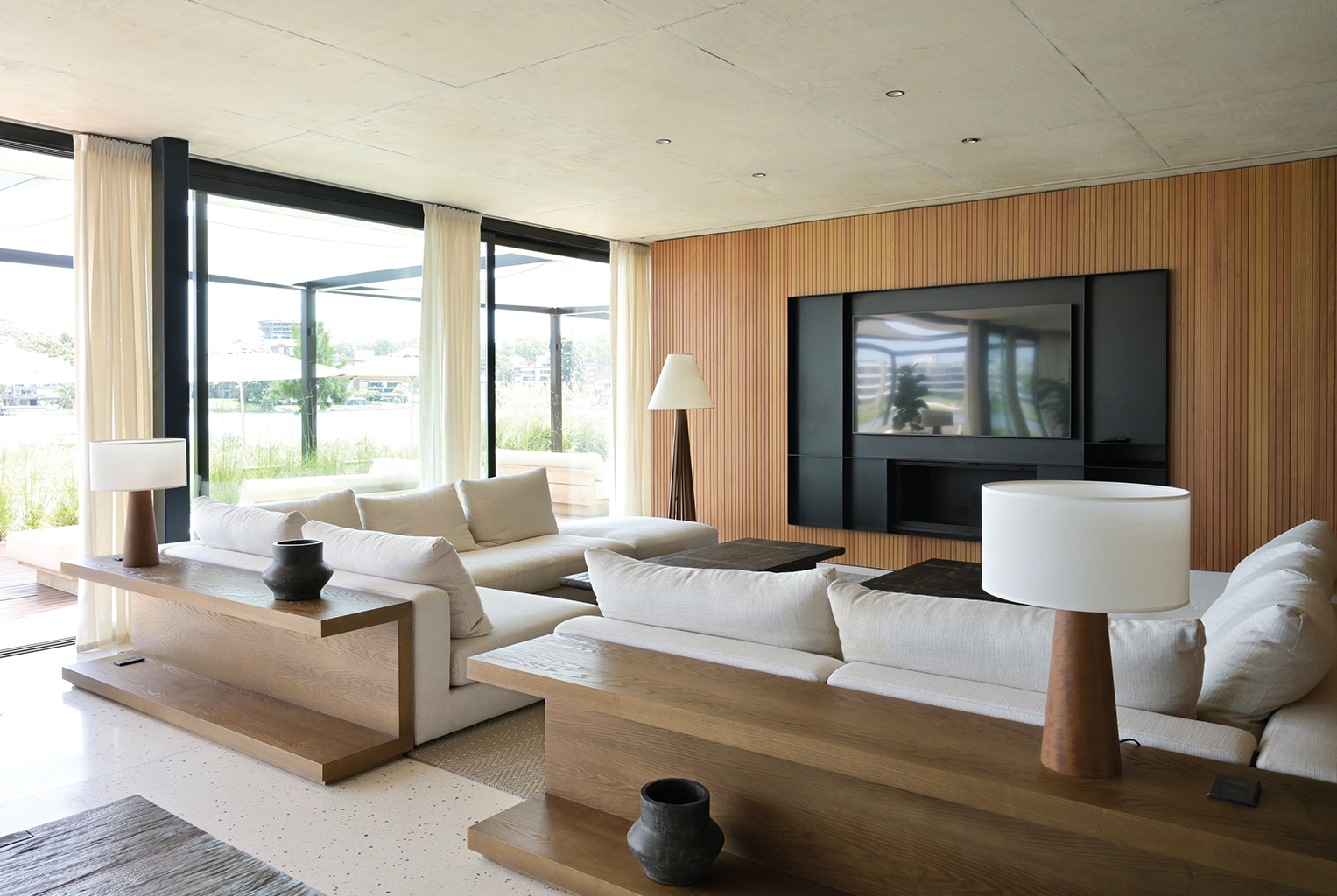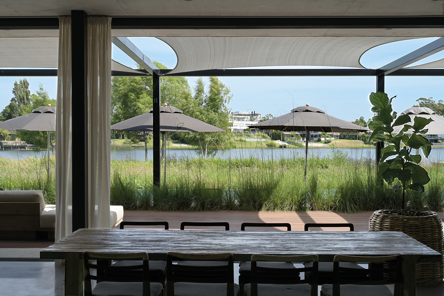 La disposición y elección del mobiliario cumplen con un rol fundamental en este sentido. Se emplearon piezas modulares y de baja altura, lo que no solo facilita la flexibilidad en la disposición según las necesidades de los habitantes, sino que también permite una integración visual con las vistas del lago, preservando la sensación de amplitud y apertura. Las líneas son limpias y relajadas, un reflejo de la arquitectura contemporánea, mientras que los tonos neutros en beiges, negros y grises aportan una elegancia discreta que no compite con el entorno, sino que lo complementa. En la zona kids de la barbacoa, la incorporación de colores pastel añade un toque de dinamismo sin perder la cohesión estilística. Los materiales empleados fueron seleccionados con extremo cuidado, priorizando aquellos de alta resistencia y durabilidad, capaces de soportar el uso frecuente sin perder su carácter estético. El equipamiento, importado especialmente de Europa y Brasil, otorga una impronta cosmopolita y distintiva que eleva la calidad de los espacios, reafirmando la identidad única del proyecto.