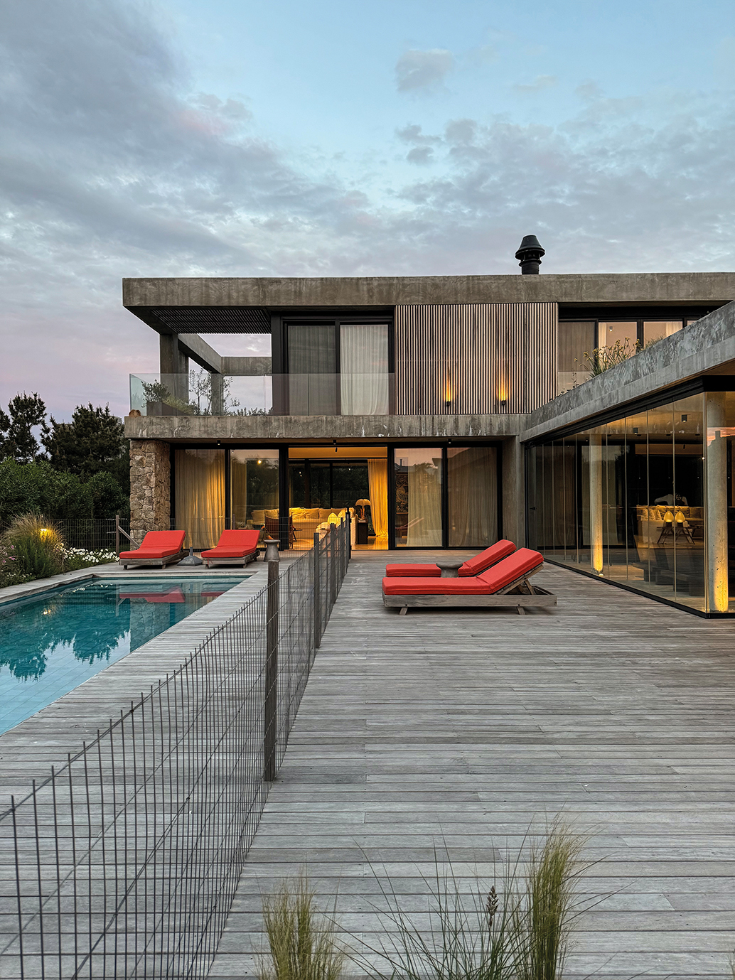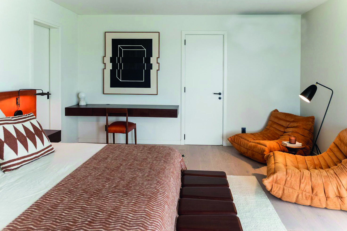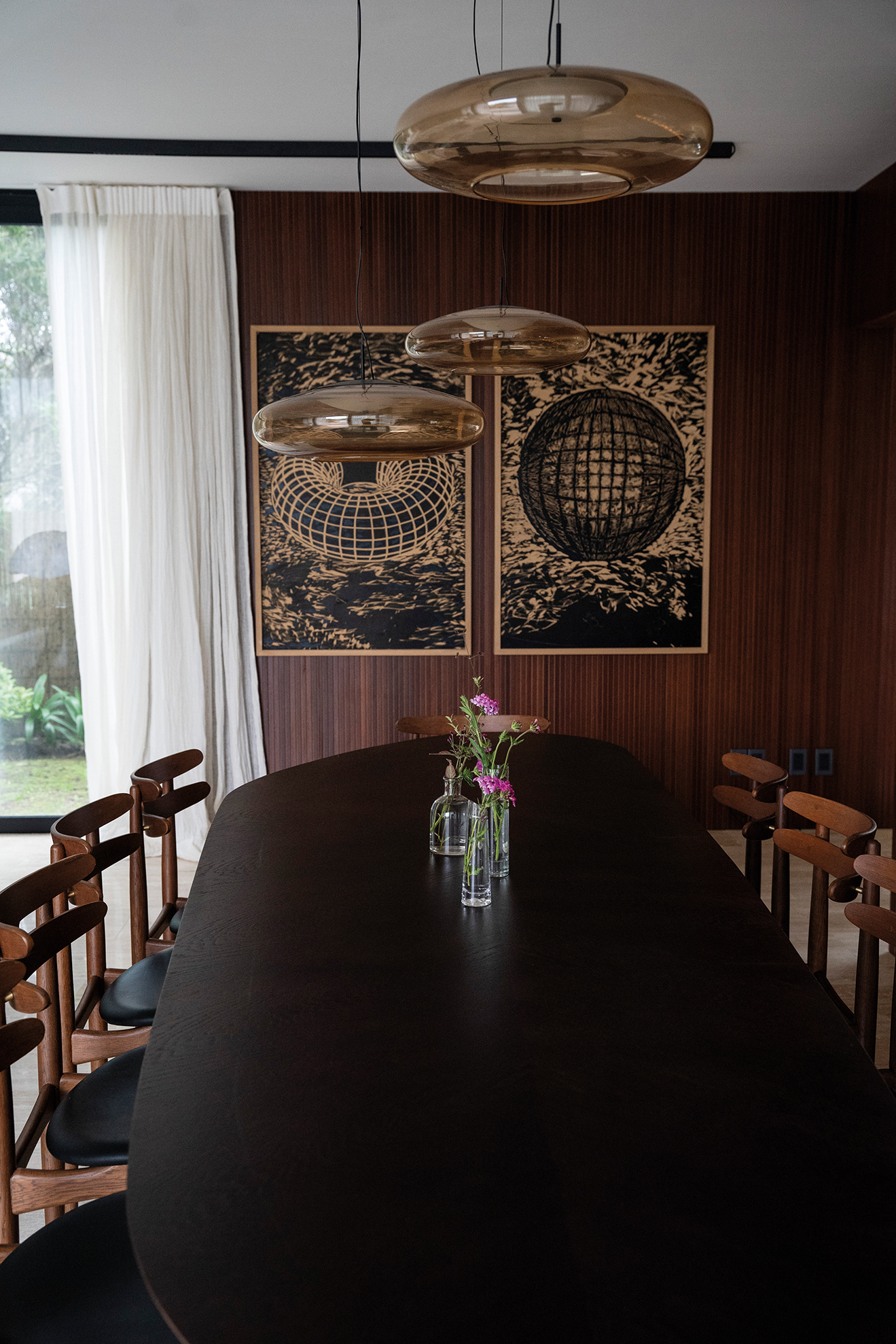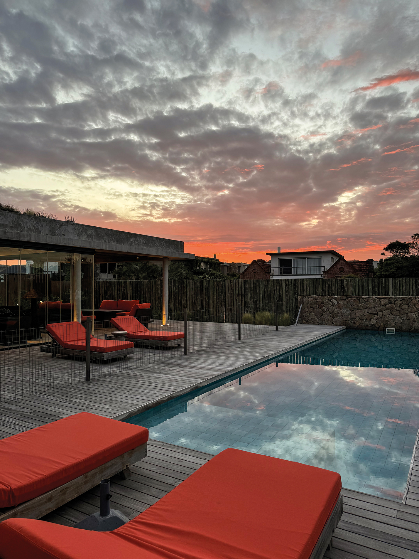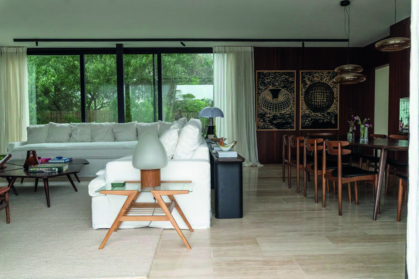 La Casa proyectada por las arquitectas Patricia Cestau y Victoria Gervaz en José Ignacio, intervenida por Estudio Dos Damas es una señal de moderna sofisticación fusionada con el confort funcional. Esta residencia, concebida con el estilo de Florencia Pittaluga y Mariana Jaume, encarna un equilibrio impecable entre líneas y conceptos contemporáneos y la calidez de los habitantes, invitando a vivir y disfrutar de cada espacio durante todo el año. La respuesta arquitectónica y de diseño de interiores es intachable. El uso de materiales naturales como la piedra y la madera otorga a la casa una calidez sofisticada que la distingue. La elección de mármol travertino para los pavimentos de la planta baja y la escalera es una decisión que genera una transición fluida hacia la planta alta, donde la madera domina, irradiando una acogedora intimidad. La pared de piedra en el salón, que alberga la estufa, se convierte en un punto focal impresionante que une el diseño interior con el entorno natural circundante. Uno de los espacios más emblemáticos es la galería, un área versátil que se transforma con elegancia de interior a exterior gracias a su sistema de cerramiento de vidrio. La elección de una paleta en tonos oscuros en esta área crea un ambiente sofisticado que se complementa con un mobiliario funcional y elegante. Este contraste, con su estilo “full black”, es una declaración de 76 fuerza y carácter, equilibrada por el uso de colores vivos en el mobiliario del living exterior. La planta alta presenta una master suite que es el epítome del diseño de autor. Con piezas icónicas, como las butacas Togo y la inclusión de arte del artista uruguayo Guillermo García Cruz, la suite se convierte en un espacio de contemplación y lujo personalizado. Acompañando esta visual de alta gama, se diseñaron espacios de descanso cuidadosamente concebidos, como el hall con vistas a un techo verde, que introduce un toque de naturaleza y conecta el interior con el exterior de una manera innovadora. La inclusión de detalles del estilo Mid Century Modern responde a la preferencia de los habitantes, quienes participaron activamente en el proceso creativo. La lámpara Pipistrello de Gae Aulenti y las Chieftains Chairs de Finn Juhl en el living aportan ese toque icónico que contrasta y realza la sobriedad del diseño general. La paleta de colores elegida —con predominio de neutros y detalles vibrantes, como el naranja— añade una energía visual sutil pero audaz que da cohesión al proyecto. Finalmente, el juego de contrastes entre los materiales y el mobiliario en toda la residencia —como el mármol travertino “roto” en el toilette, la estructura imponente de la escalera en acero corte y el mobiliario pesado de madera maciza en la galería— eleva esta vivienda a un nivel de diseño intemporal y único. En conjunto, Casa AP no solo es un refugio para vivir, sino un espacio pensado y ejecutado con una maestría que invita a una experiencia estética plena en cada rincón.