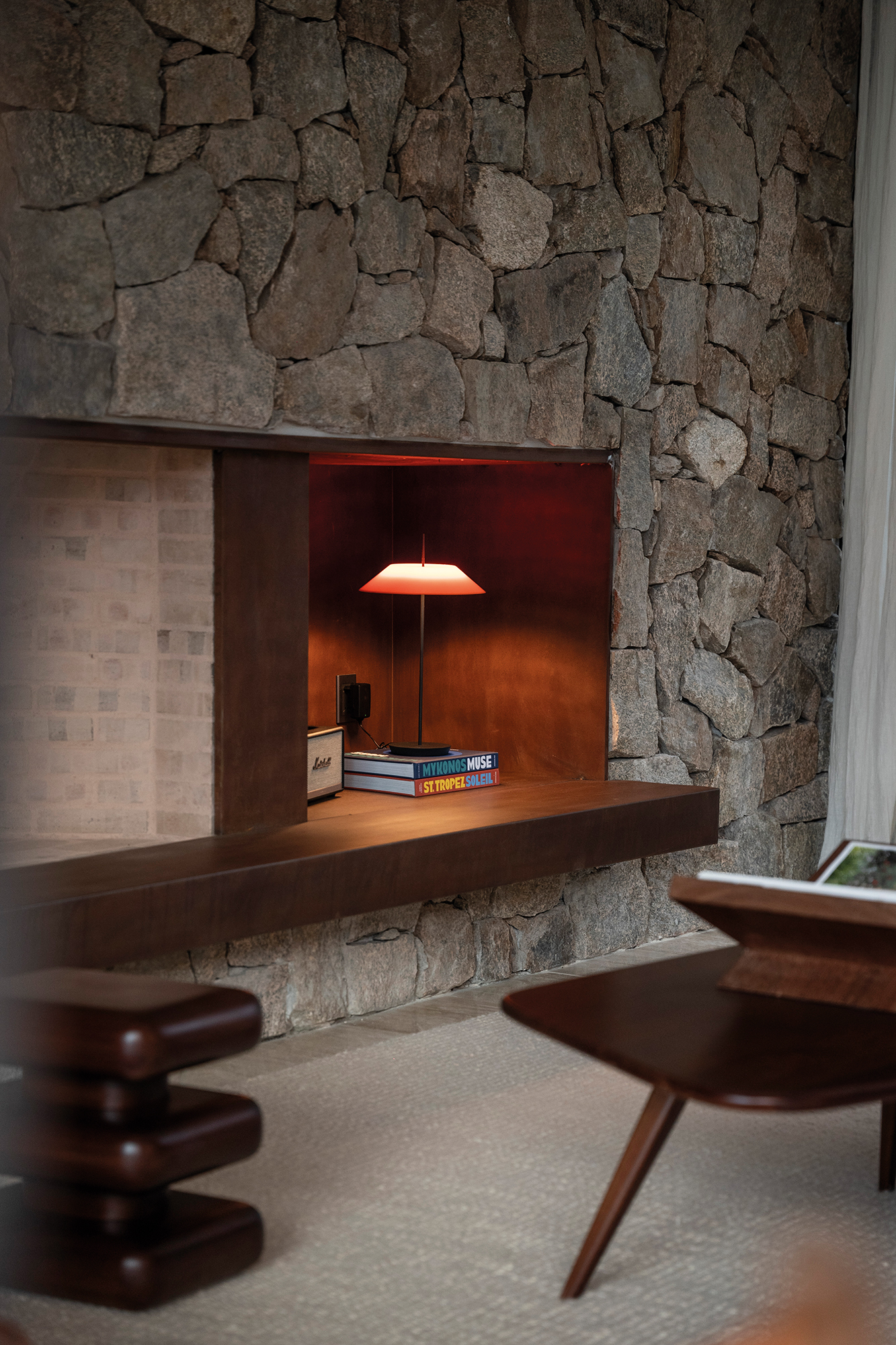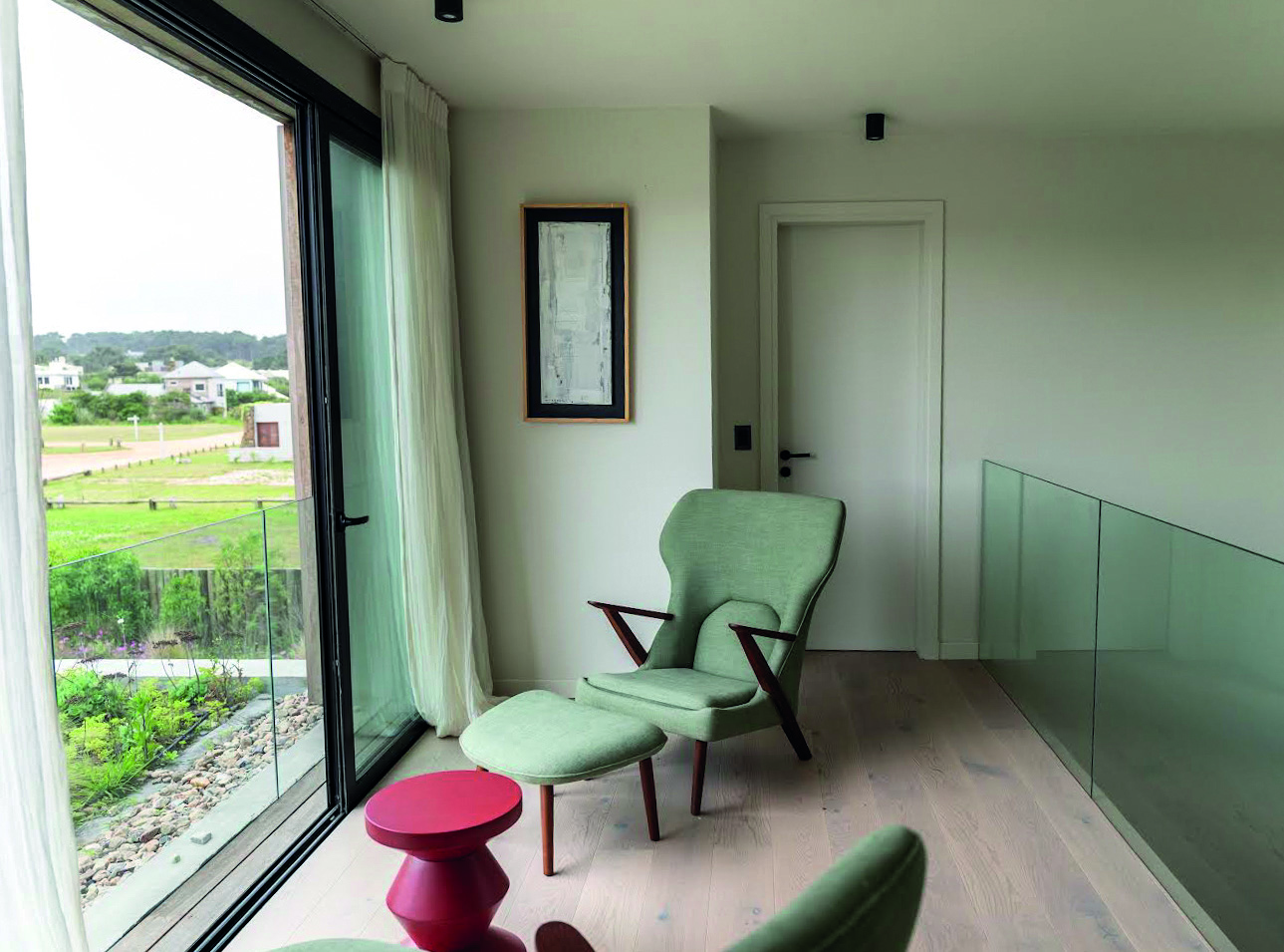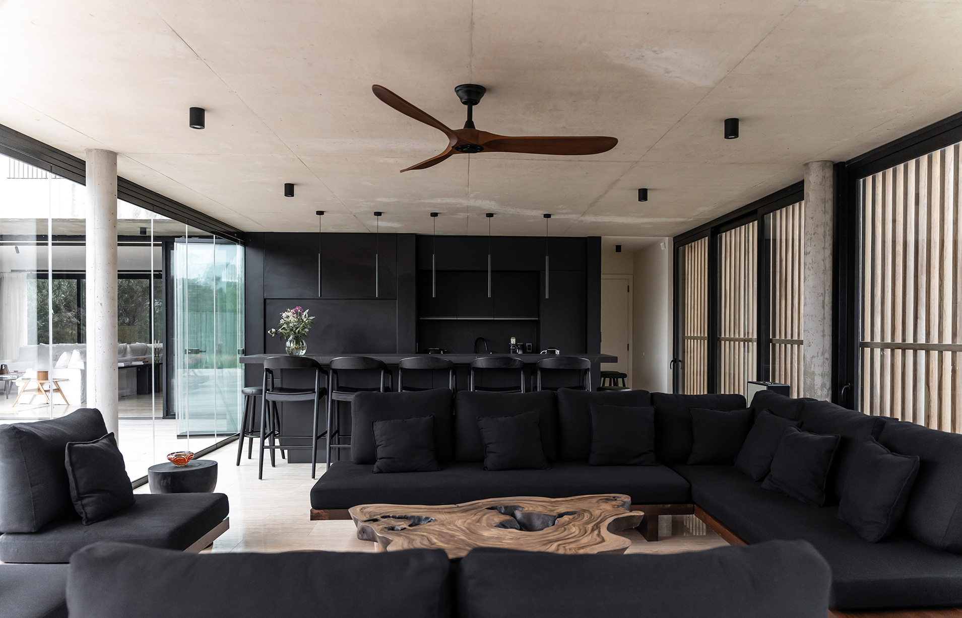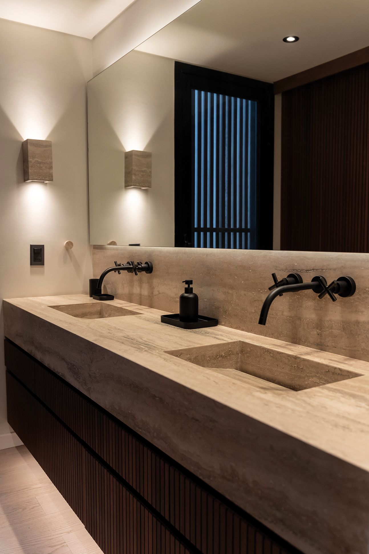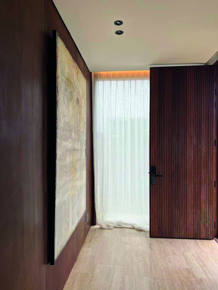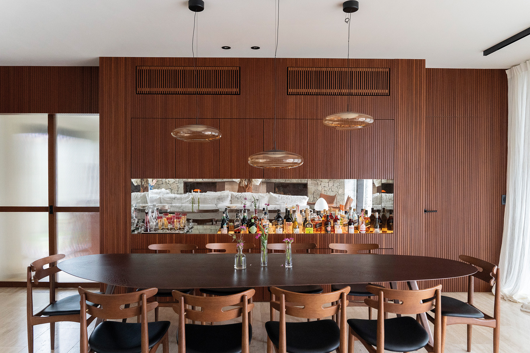 La Casa proyectada por las arquitectas Patricia Cestau y Victoria Gervaz en José Ignacio, intervenida por Estudio Dos Damas es una señal de moderna sofisticación fusionada con el confort funcional. Esta residencia, concebida con el estilo de Florencia Pittaluga y Mariana Jaume, encarna un equilibrio impecable entre líneas y conceptos contemporáneos y la calidez de los habitantes, invitando a vivir y disfrutar de cada espacio durante todo el año. La respuesta arquitectónica y de diseño de interiores es intachable. El uso de materiales naturales como la piedra y la madera otorga a la casa una calidez sofisticada que la distingue. La elección de mármol travertino para los pavimentos de la planta baja y la escalera es una decisión que genera una transición fluida hacia la planta alta, donde la madera domina, irradiando una acogedora intimidad. La pared de piedra en el salón, que alberga la estufa, se convierte en un punto focal impresionante que une el diseño interior con el entorno natural circundante. Uno de los espacios más emblemáticos es la galería, un área versátil que se transforma con elegancia de interior a exterior gracias a su sistema de cerramiento de vidrio. La elección de una paleta en tonos oscuros en esta área crea un ambiente sofisticado que se complementa con un mobiliario funcional y elegante. Este contraste, con su estilo “full black”, es una declaración de 76 fuerza y carácter, equilibrada por el uso de colores vivos en el mobiliario del living exterior. La planta alta presenta una master suite que es el epítome del diseño de autor. Con piezas icónicas, como las butacas Togo y la inclusión de arte del artista uruguayo Guillermo García Cruz, la suite se convierte en un espacio de contemplación y lujo personalizado. Acompañando esta visual de alta gama, se diseñaron espacios de descanso cuidadosamente concebidos, como el hall con vistas a un techo verde, que introduce un toque de naturaleza y conecta el interior con el exterior de una manera innovadora. La inclusión de detalles del estilo Mid Century Modern responde a la preferencia de los habitantes, quienes participaron activamente en el proceso creativo. La lámpara Pipistrello de Gae Aulenti y las Chieftains Chairs de Finn Juhl en el living aportan ese toque icónico que contrasta y realza la sobriedad del diseño general. La paleta de colores elegida —con predominio de neutros y detalles vibrantes, como el naranja— añade una energía visual sutil pero audaz que da cohesión al proyecto. Finalmente, el juego de contrastes entre los materiales y el mobiliario en toda la residencia —como el mármol travertino “roto” en el toilette, la estructura imponente de la escalera en acero corte y el mobiliario pesado de madera maciza en la galería— eleva esta vivienda a un nivel de diseño intemporal y único. En conjunto, Casa AP no solo es un refugio para vivir, sino un espacio pensado y ejecutado con una maestría que invita a una experiencia estética plena en cada rincón.