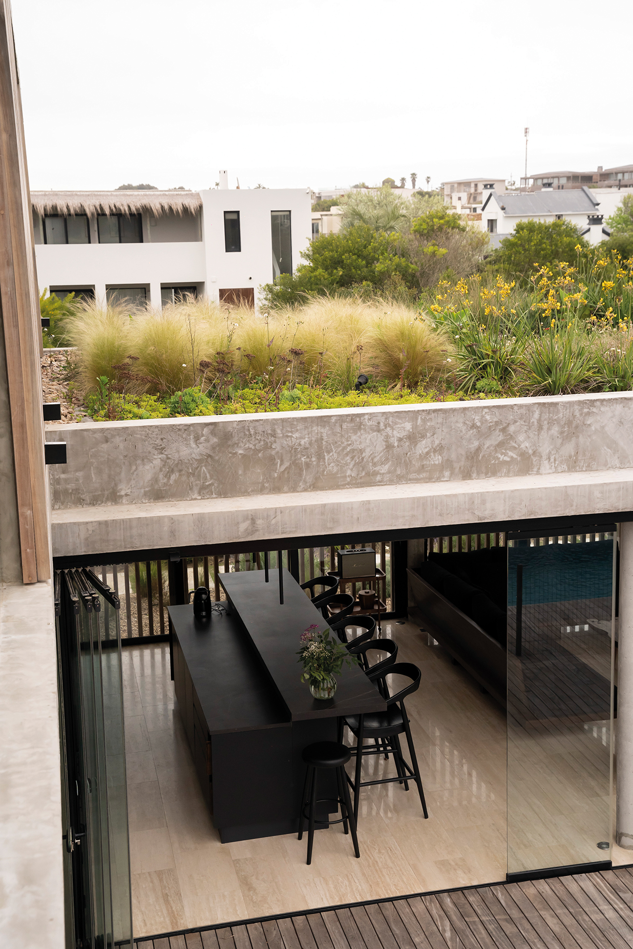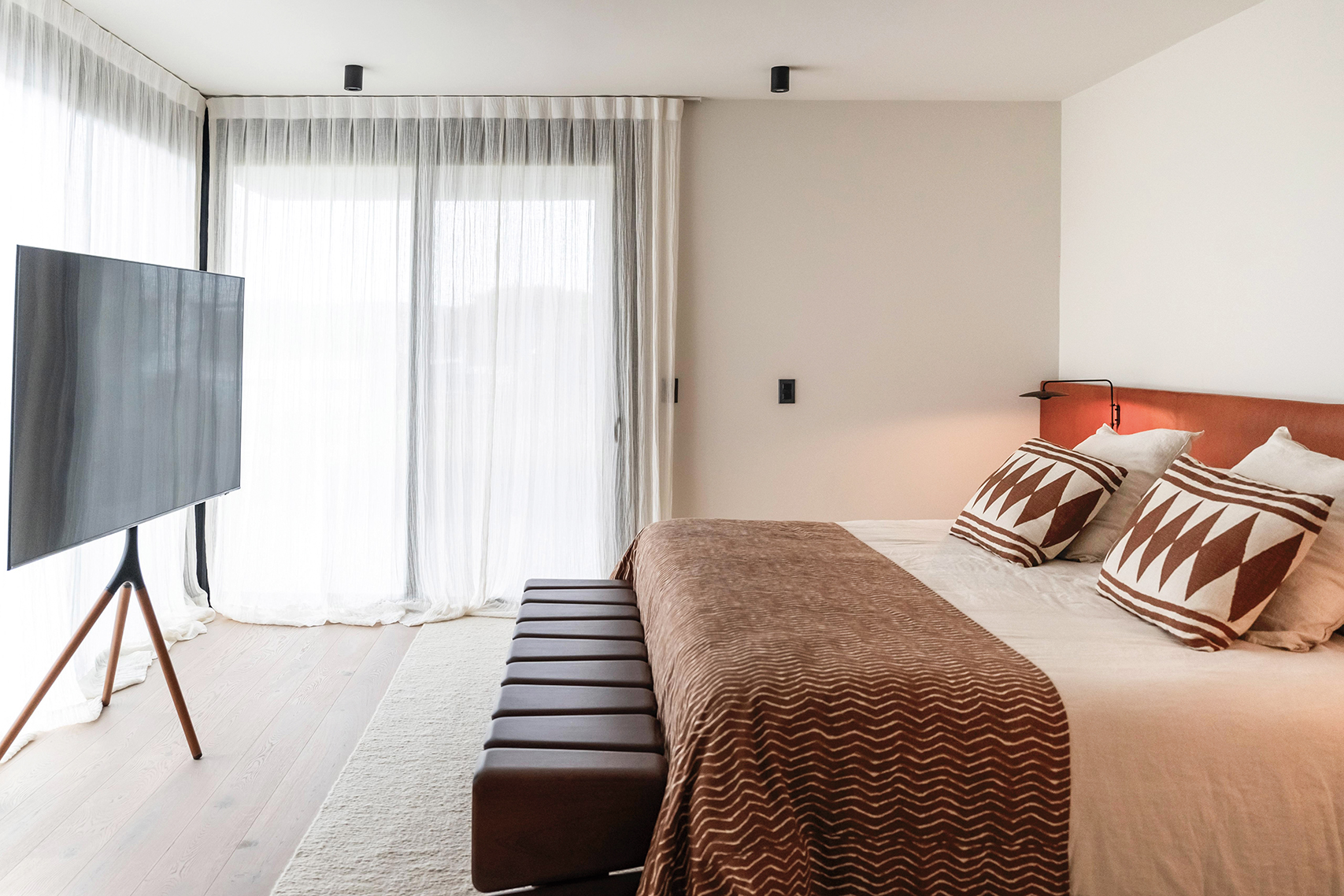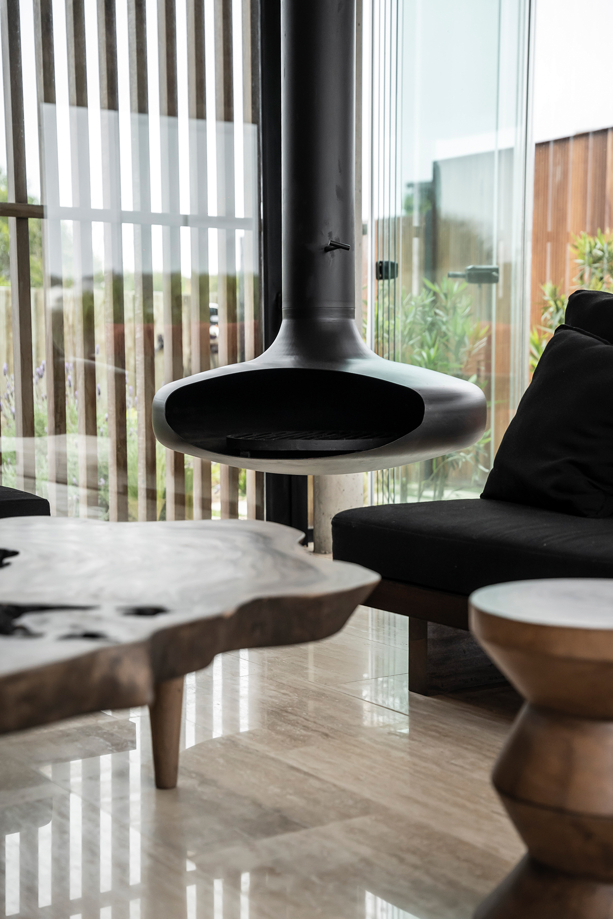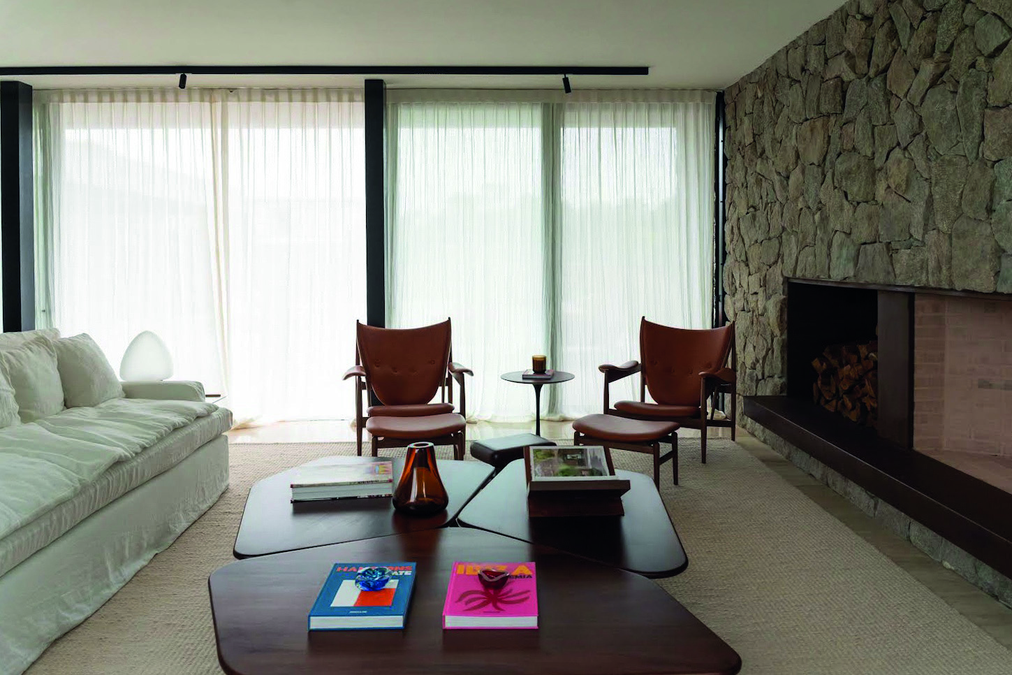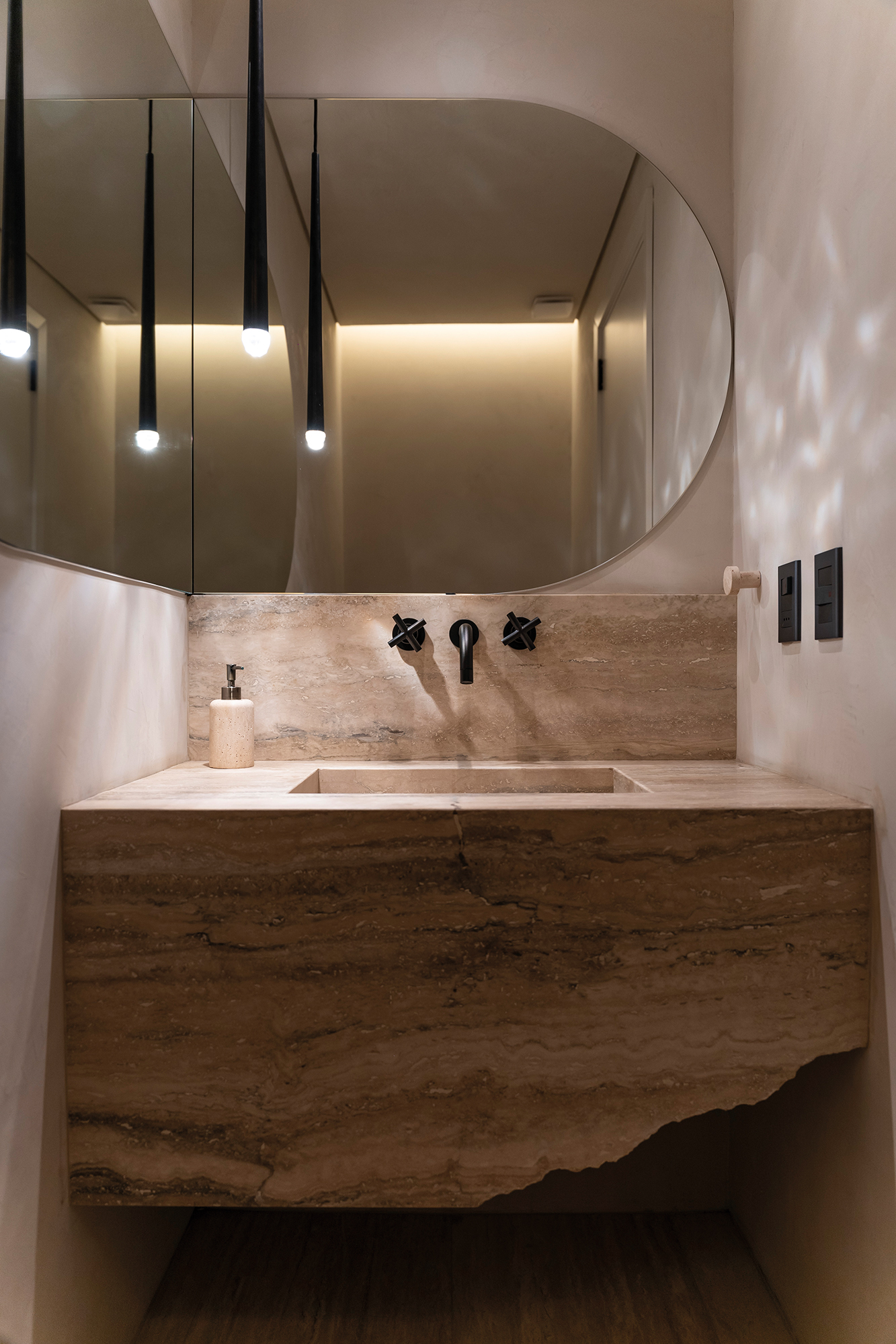 La Casa proyectada por las arquitectas Patricia Cestau y Victoria Gervaz en José Ignacio, intervenida por Estudio Dos Damas es una señal de moderna sofisticación fusionada con el confort funcional. Esta residencia, concebida con el estilo de Florencia Pittaluga y Mariana Jaume, encarna un equilibrio impecable entre líneas y conceptos contemporáneos y la calidez de los habitantes, invitando a vivir y disfrutar de cada espacio durante todo el año. La respuesta arquitectónica y de diseño de interiores es intachable. El uso de materiales naturales como la piedra y la madera otorga a la casa una calidez sofisticada que la distingue. La elección de mármol travertino para los pavimentos de la planta baja y la escalera es una decisión que genera una transición fluida hacia la planta alta, donde la madera domina, irradiando una acogedora intimidad. La pared de piedra en el salón, que alberga la estufa, se convierte en un punto focal impresionante que une el diseño interior con el entorno natural circundante. Uno de los espacios más emblemáticos es la galería, un área versátil que se transforma con elegancia de interior a exterior gracias a su sistema de cerramiento de vidrio. La elección de una paleta en tonos oscuros en esta área crea un ambiente sofisticado que se complementa con un mobiliario funcional y elegante. Este contraste, con su estilo “full black”, es una declaración de 76 fuerza y carácter, equilibrada por el uso de colores vivos en el mobiliario del living exterior. La planta alta presenta una master suite que es el epítome del diseño de autor. Con piezas icónicas, como las butacas Togo y la inclusión de arte del artista uruguayo Guillermo García Cruz, la suite se convierte en un espacio de contemplación y lujo personalizado. Acompañando esta visual de alta gama, se diseñaron espacios de descanso cuidadosamente concebidos, como el hall con vistas a un techo verde, que introduce un toque de naturaleza y conecta el interior con el exterior de una manera innovadora. La inclusión de detalles del estilo Mid Century Modern responde a la preferencia de los habitantes, quienes participaron activamente en el proceso creativo. La lámpara Pipistrello de Gae Aulenti y las Chieftains Chairs de Finn Juhl en el living aportan ese toque icónico que contrasta y realza la sobriedad del diseño general. La paleta de colores elegida —con predominio de neutros y detalles vibrantes, como el naranja— añade una energía visual sutil pero audaz que da cohesión al proyecto. Finalmente, el juego de contrastes entre los materiales y el mobiliario en toda la residencia —como el mármol travertino “roto” en el toilette, la estructura imponente de la escalera en acero corte y el mobiliario pesado de madera maciza en la galería— eleva esta vivienda a un nivel de diseño intemporal y único. En conjunto, Casa AP no solo es un refugio para vivir, sino un espacio pensado y ejecutado con una maestría que invita a una experiencia estética plena en cada rincón.