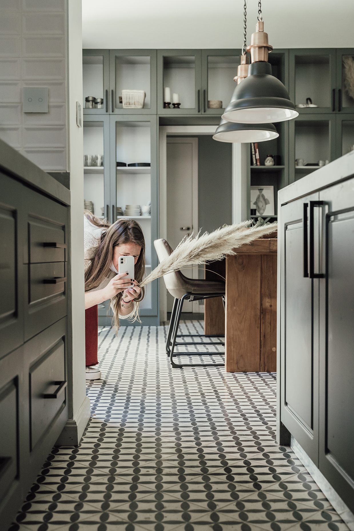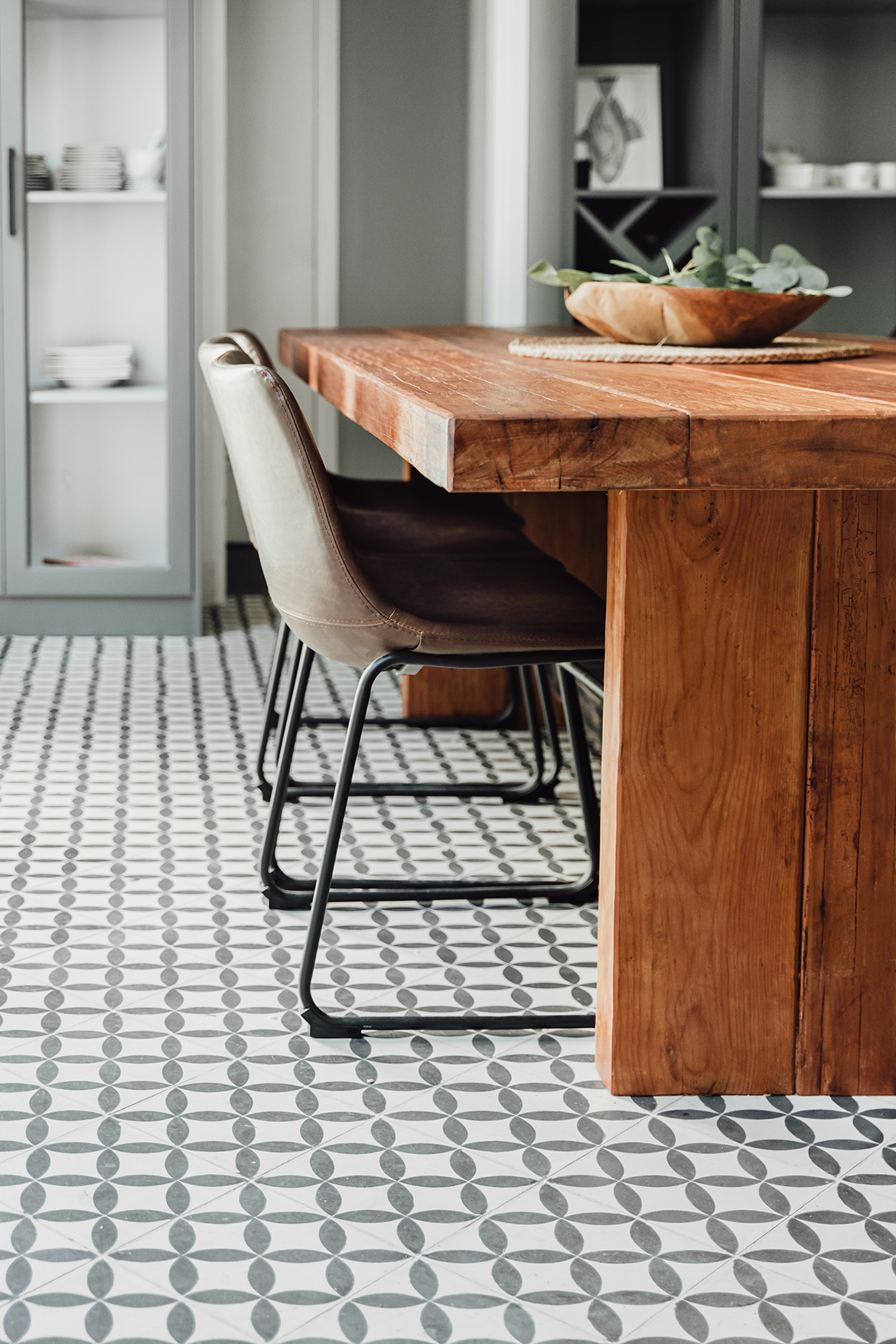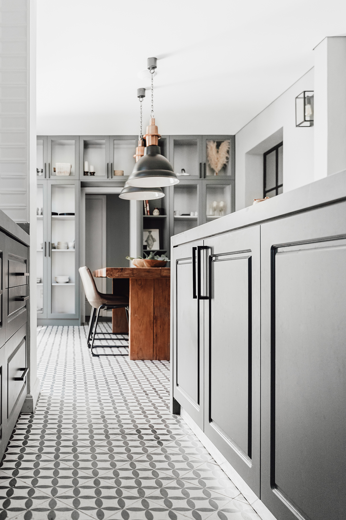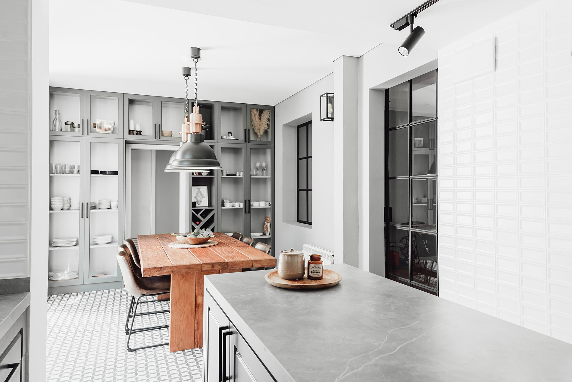 Los habitantes soñaban con una cocina color gris con lo cual la atmósfera resultante devino en un estilo clásico industrial. Para el pavimento se eligieron baldosas calcáreas pintadas a mano, manufacturadas en Marruecos que se importaron especialmente por intermedio de le souk deco. La carpintería fue diseñada a medida y construida por los carpinteros que suelen trabajar con Fraenkel, con acabado en laca gris, con puertas y cajones con marcos, en un estilo clásico que recuerda a las viejas cocinas de antaño. Las paredes de la zona de trabajo de la cocina se revistieron con cerámicas white frost de Bagno and company y las mesadas se resolvieron con itop gris construidas por de Marcelo De Marco. Para apoyar la generación de la atmósfera deseada, las aberturas originales fueron sustituidas por piezas de hierro con vidrios repartidos, la estructura se pintó de color negro. Se generó un mueble vajillero que se ubicó de modo tal que actúa de contrapunto con el área de trabajo. El mobiliario fue todo un tema. Se optó por una mesa de pinotea reciclada, rediseñada a medida y sillas de cuero en tono dulce de leche de Ashley store. El gran espejo tambien fue elegida en Ashley.
