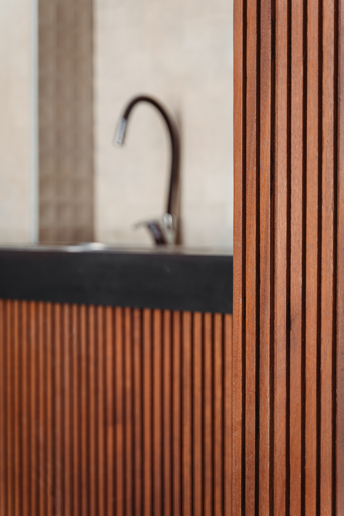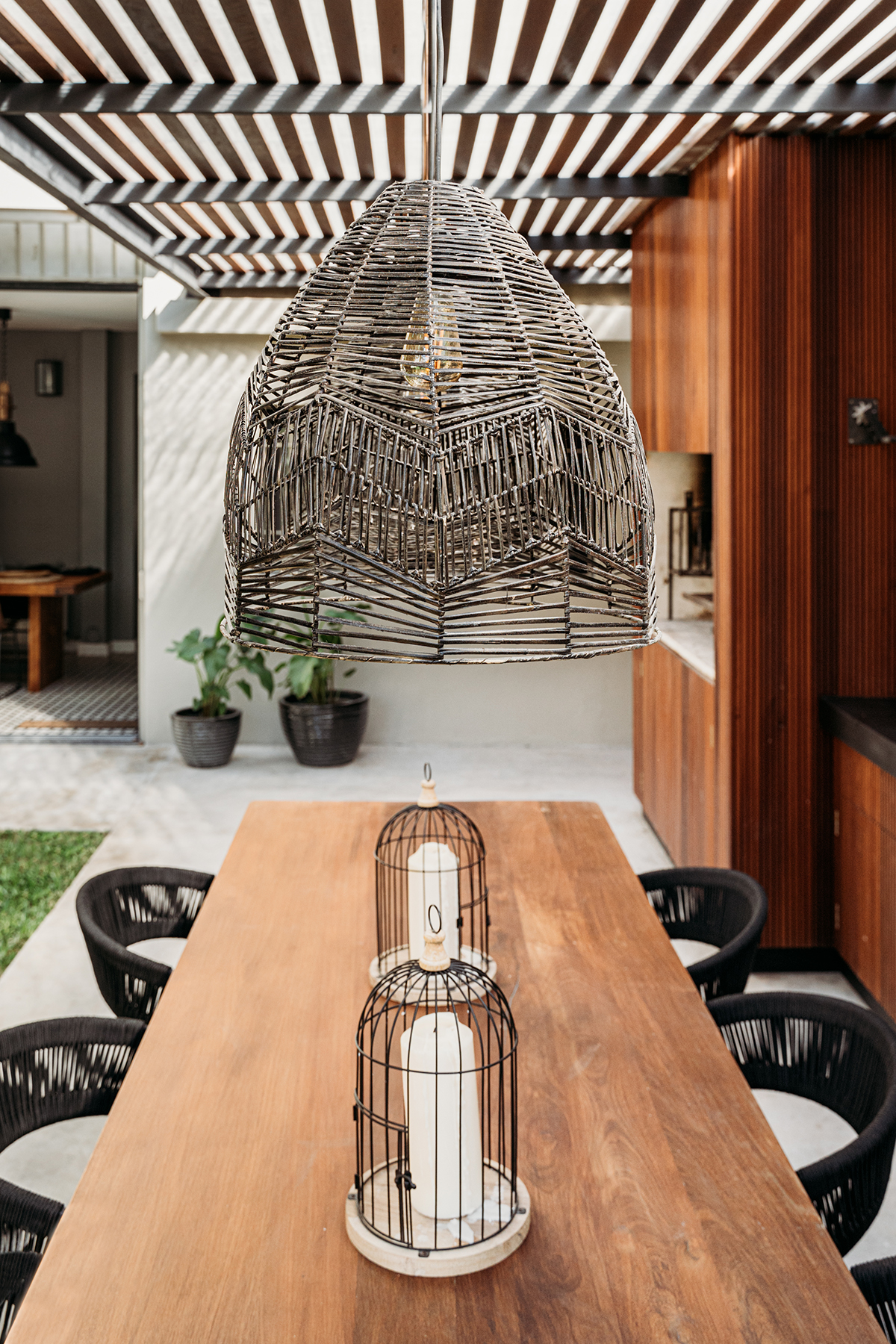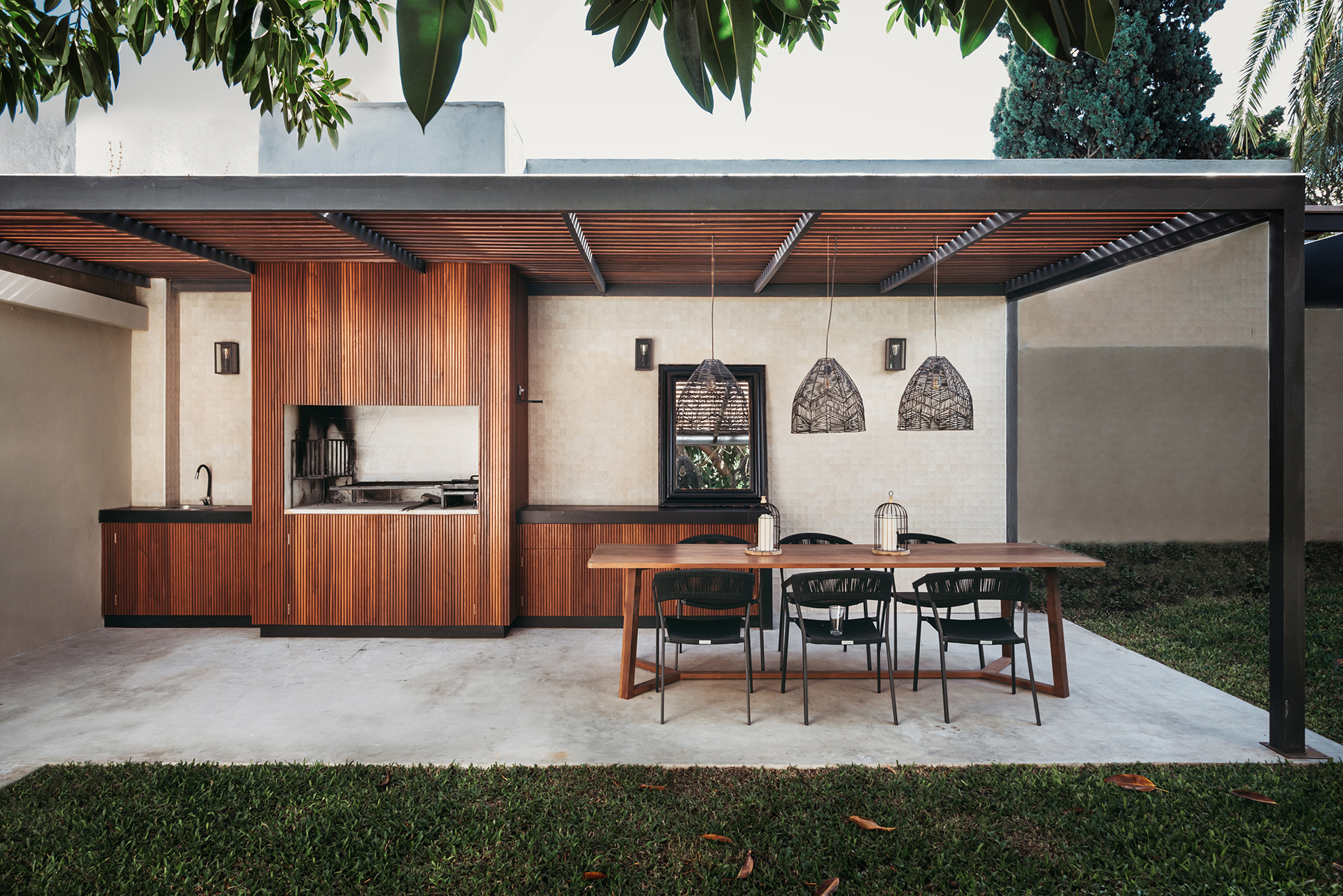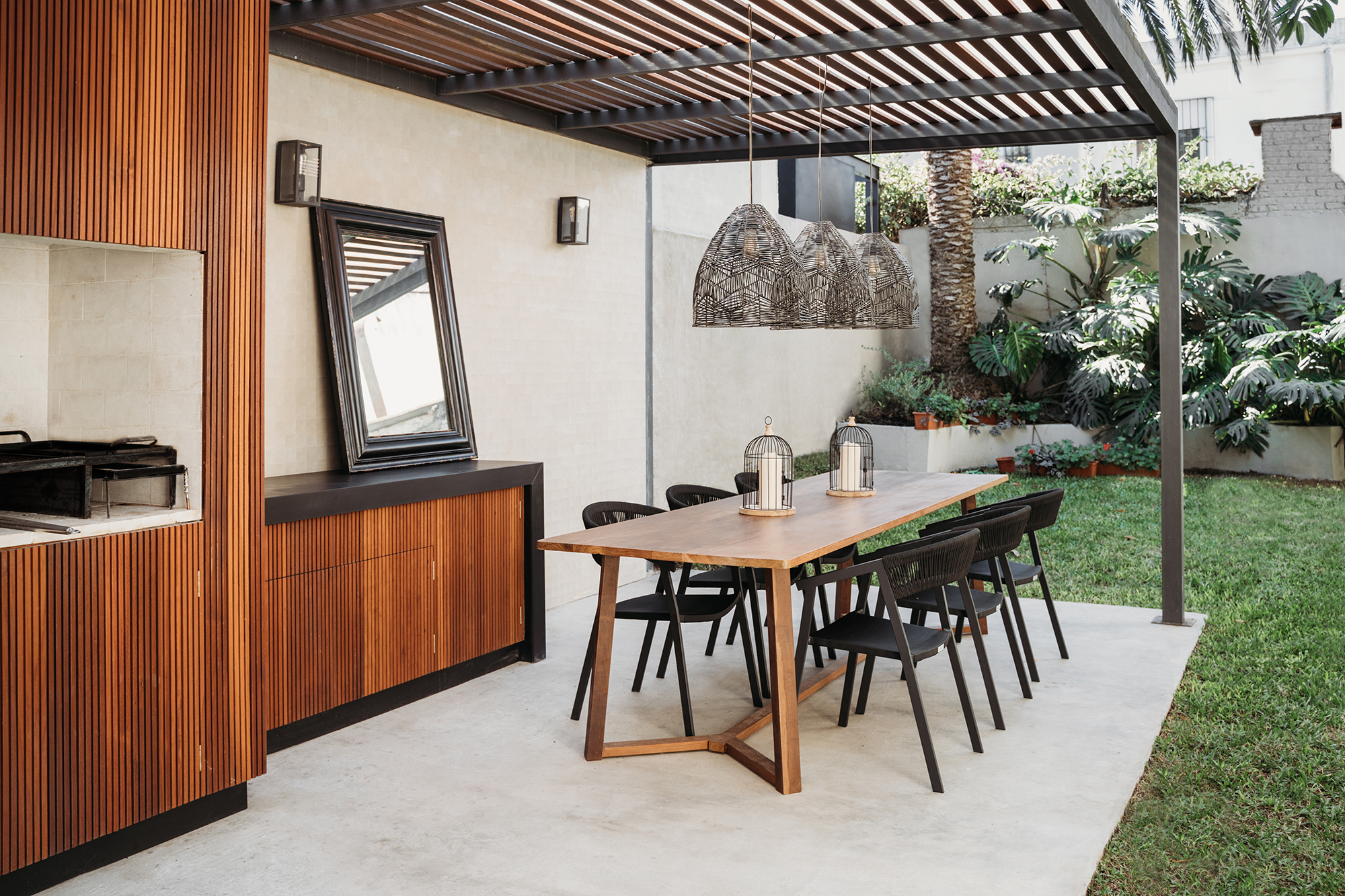 … lo mas difícil de esta proyecto fue generar un espacio cómodo e integrado pero que no molestara el paso porque esta es la única salida hacia el jardín. En el jardín el pavimento era de piedra y contaba con una gran fuente, lo que fue reemplazado por césped y platas que cubre toda la superficie. Creamos un espacio de galería dispuesta de manera perpendicular a nuestra cocina comedor con una pérgola en hierro y madera donde revestimos toda la fachada de parrillero y bajos mesada en madera alistonada generando una única unidad. Las mesadas en este espacio intermedio son, igual que en la cocina principal, de itop negro, el revestimiento de las paredes son también de Bagno and company, la mesa la diseñamos a medida y fue fabricada por Incasa y las sillas las encontramos en vivai. En este sector el pavimento es de hormigón lustrado.