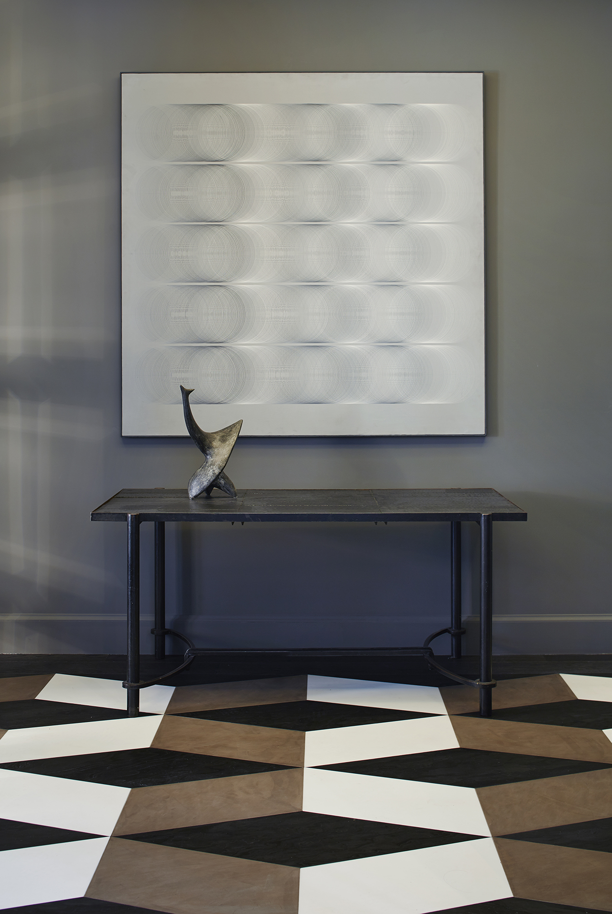 El ingreso fluye desde su composición y sus materiales. El piso fue completamente diseñado por Sarah en mármol de distintos tonos, y combina a la perfección con el gris tupido de las paredes, que logra un efecto de recepción impactante.