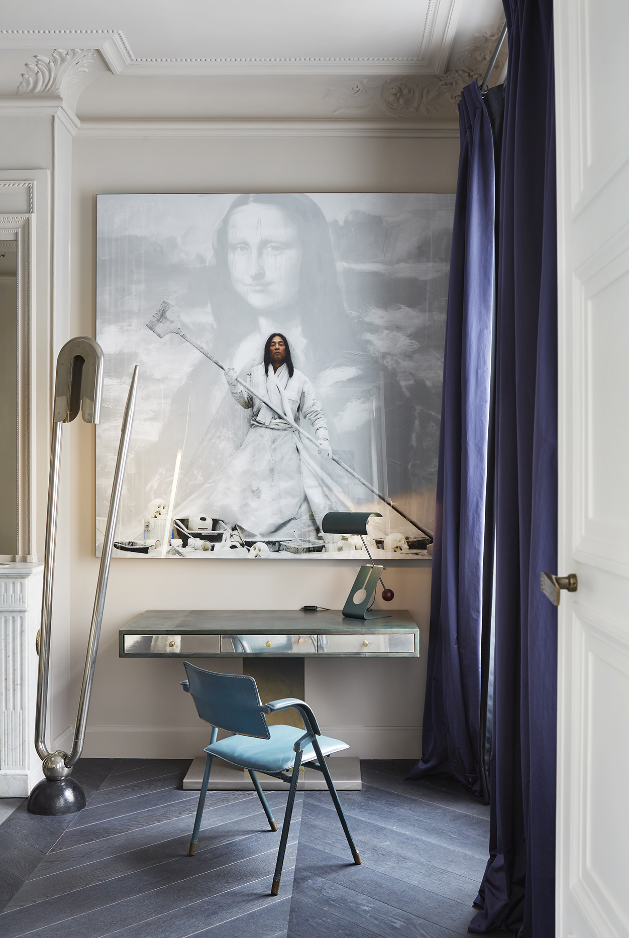 El cliente quería que el apartamento fuera acogedor y elegante, con un espíritu artístico y acostumbrados a recibir gente en casa los fines de semana, quisieron realizar un cuarto de huéspedes en el que se destaca la grafica en la pared trasera a la cama que parece a simple vista un vinilo, pero es sin embargo un gravado a mano sobre una lamina de madera natural de la artista Zoe Ouvrier.