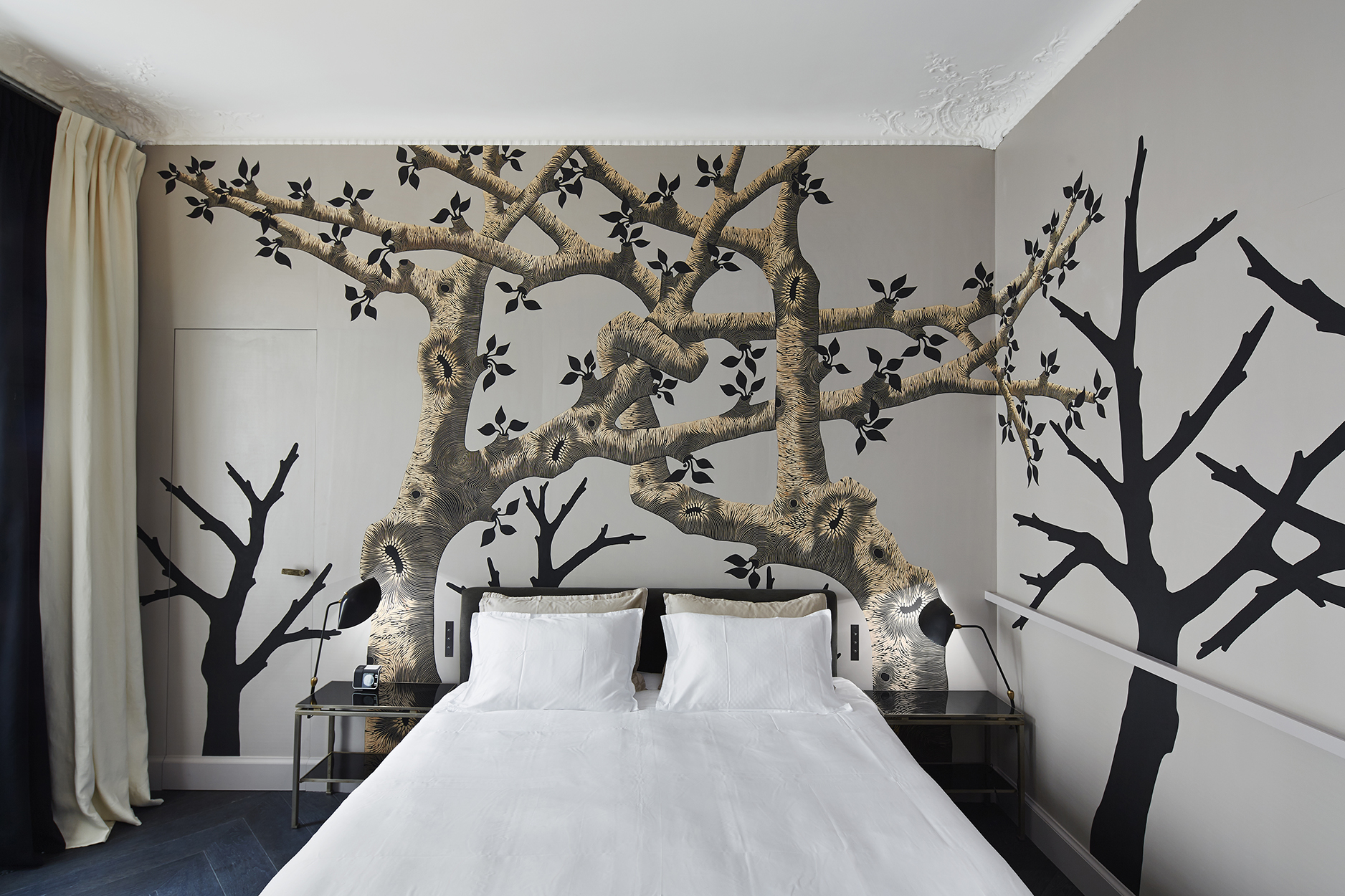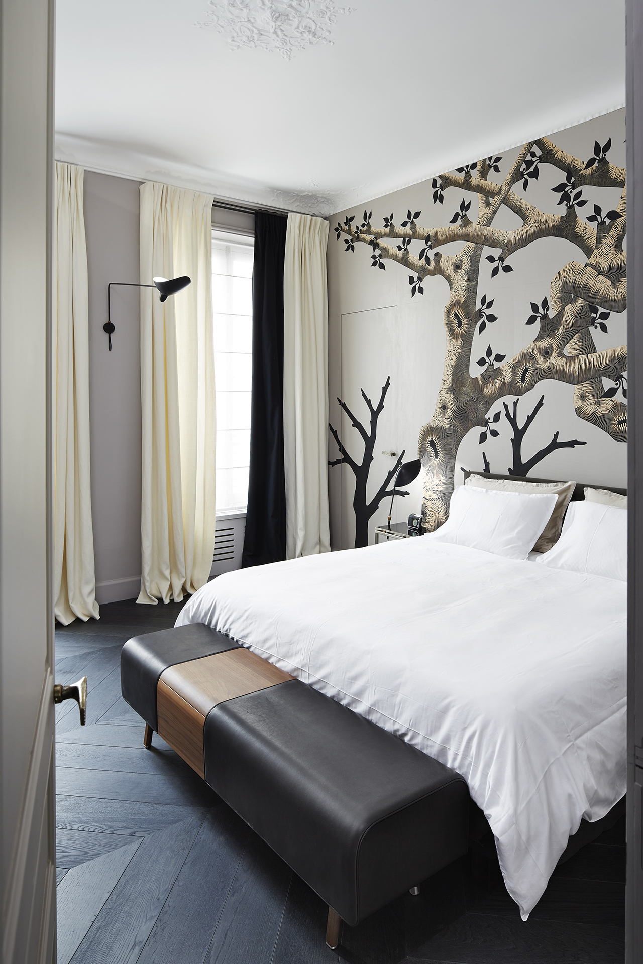 El cliente quería que el apartamento fuera acogedor y elegante, con un espíritu artístico y acostumbrados a recibir gente en casa los fines de semana, quisieron realizar un cuarto de huéspedes en el que se destaca la grafica en la pared trasera a la cama que parece a simple vista un vinilo, pero es sin embargo un gravado a mano sobre una lamina de madera natural de la artista Zoe Ouvrier.