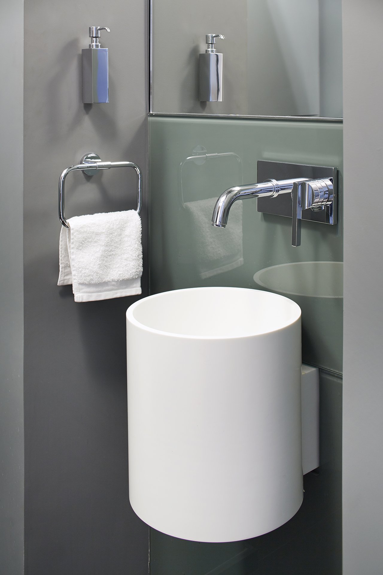 El ingreso fluye desde su composición y sus materiales. El piso fue completamente diseñado por Sarah en mármol de distintos tonos, y combina a la perfección con el gris tupido de las paredes, que logra un efecto de recepción impactante.