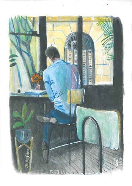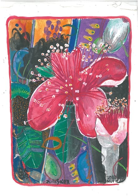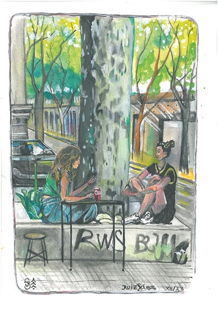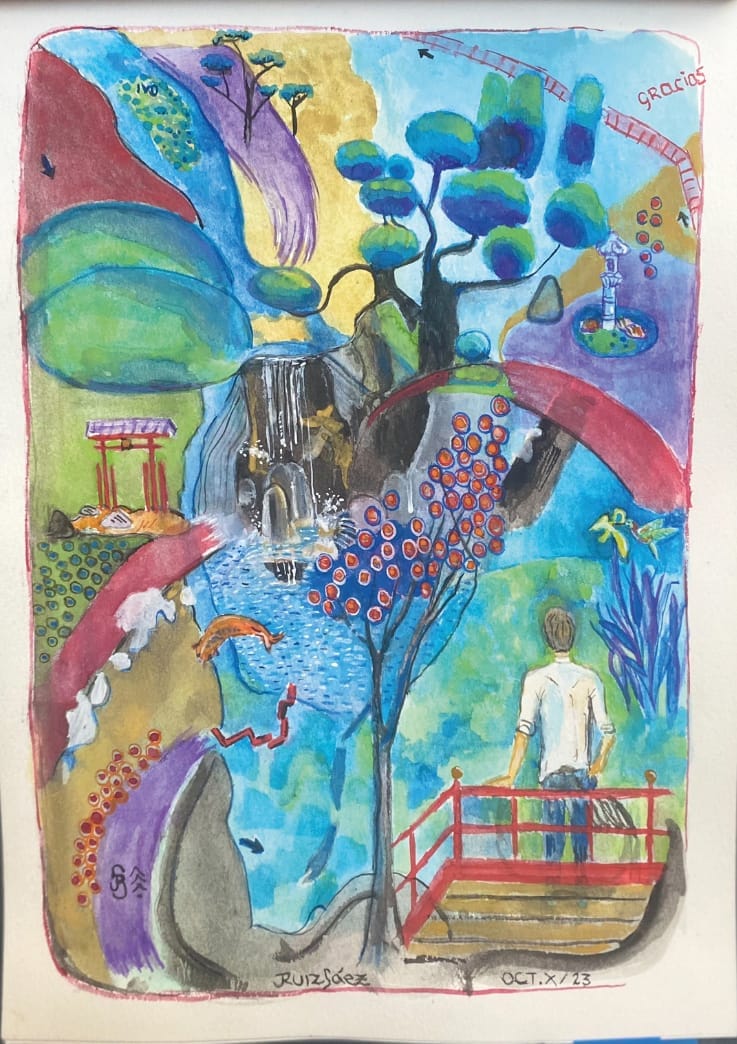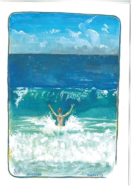 De niño y en el liceo la materia de dibujo y arte era la que más me gustaba. Me generaba mucha paz y a la vez despertaba todos mis sentidos. El tiempo se pasaba volando. Hasta el día de hoy, al cerrar los ojos, siento el olor a trementina de los óleos en miniatura que pintaba -con sumo detalle – mi abuela materna; Esther Güelfi de Sáez de quien heredé además mi pasión por los jardines y la naturaleza. Admiraba además los arreglos florales que exponía en el Garden Clubs de Uruguay, institución que llegó a presidir. También recuerdo sus carpetas de dibujos de flores y vegetación en general, sus platos pintados con motivos florales y los bosquejos que hacía en papel antes de preparar sus arreglos florales, arreglos en los que tenía como referencia a Alexander Calder. Comencé a pintar con acuarela hace dos años luego de una intervención quirúrgica que me dejó a quietud por dos meses con una anemia fuerte. Durante ese periodo de reposo extrañaba mis caminatas por el Parque Rodo y la playa entonces empecé a pintarla para revivir la experiencia desde el reposo forzoso. Me inspiran todos los entornos naturales, los bares con ventanas luminosas, la natación, deporte que practico, que es una experiencia sensorialmente fascinante. También me inspiran mis experiencias grupales como las que vivo como guía de terapia de bosque y naturaleza.
