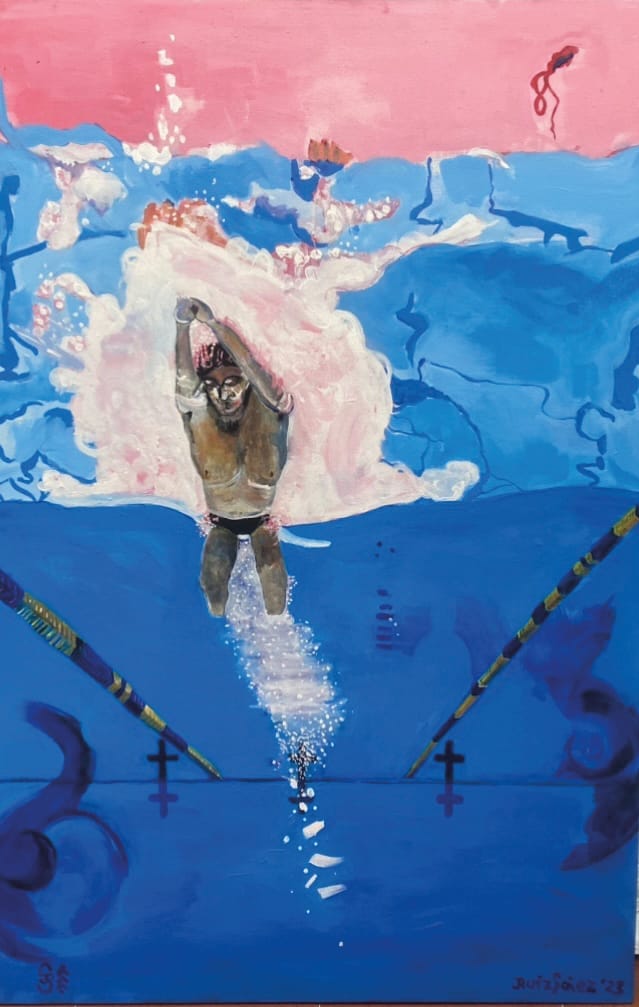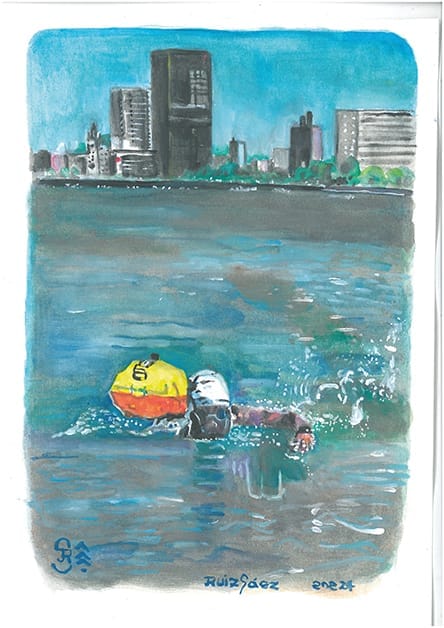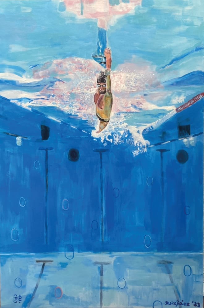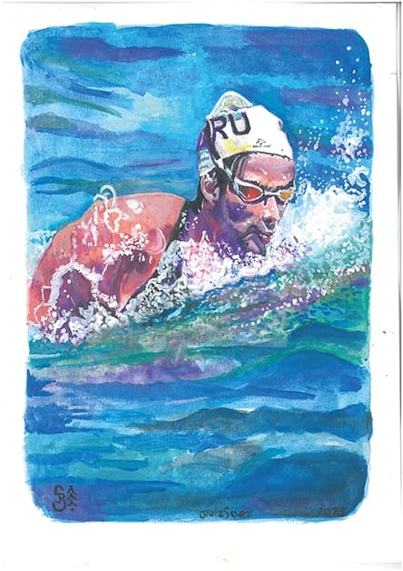 La acuarela me ha permitido no tener excusas para no pintar por falta de tiempo, taller, espacio. Es fácil, limpia, transportable, se adapta a mi vida y a mi necesidad creativa. Tengo más de 300 piezas. Puntualmente uso acrílico color blanco para tener más pureza y brillo en este color que a veces con la acuarela se ensucia. Y recientemente comencé a pintar con acrílico, la serie de nadadores, que pinto sobre telas de 0.80 x 1.20. Primero boceto en acuarela y luego los llevo al formato mayor.