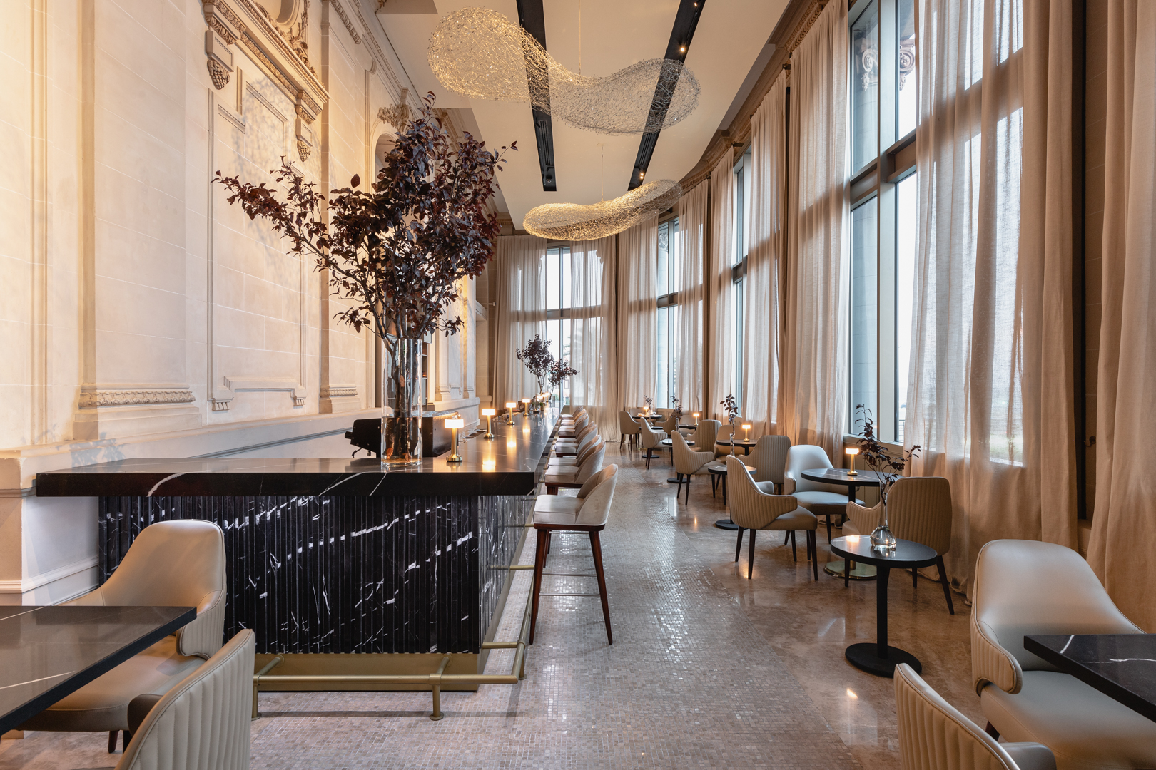 El cielo del espacio está coronado por la presencia estelar de elementos únicos que con majestuosa presencia dibujan un ambiente cambiante generado por esculturas kinéticas suspendidas sobre la barra de bar que son creación del artista Gustavo Genta. Estas nubes inmateriales, que aportan escala, brillos emblemáticos y sombras cuidadosas, con sofisticados matices son sin duda elementos distintivos del proyecto y colaboran a convertirlo en un lugar único.