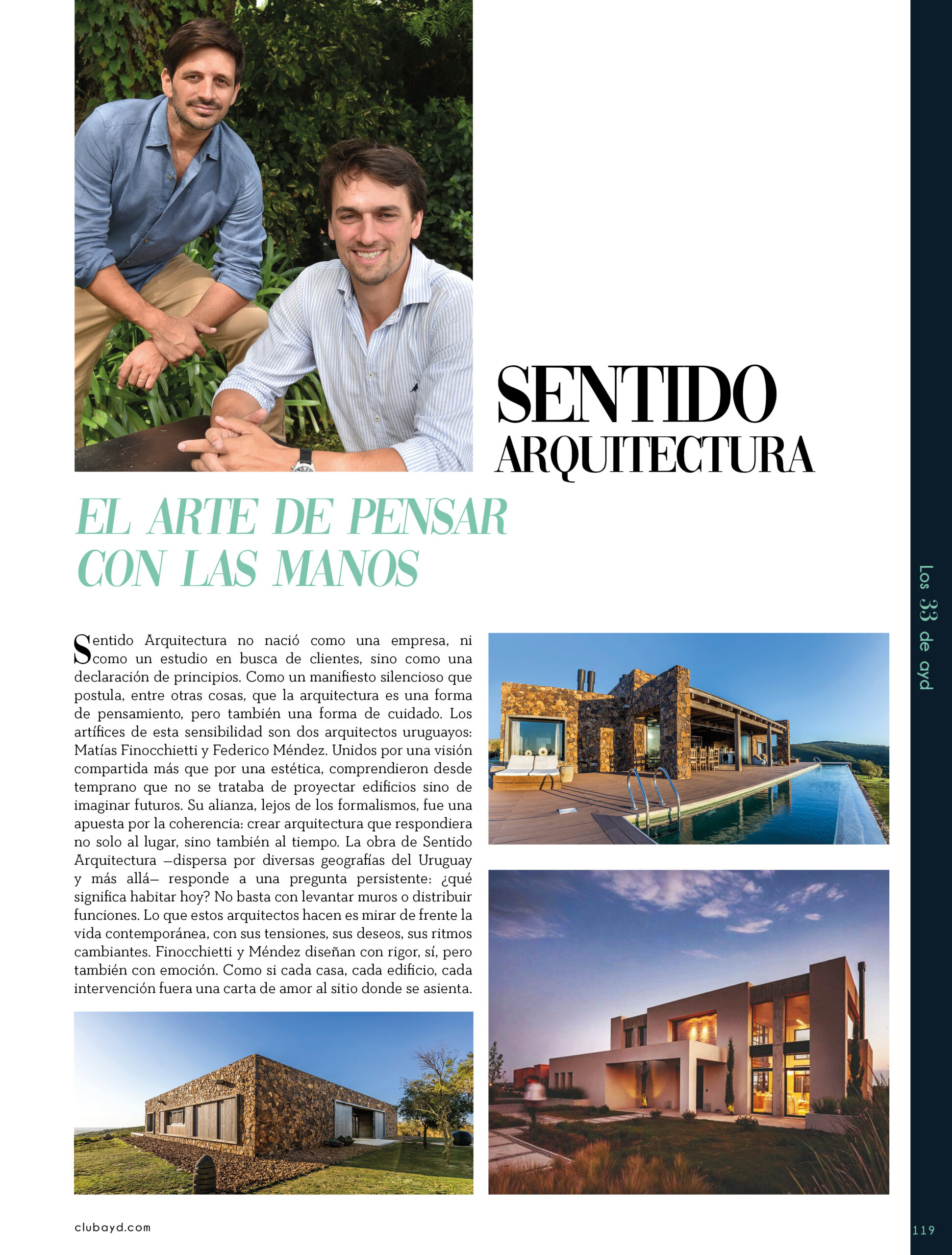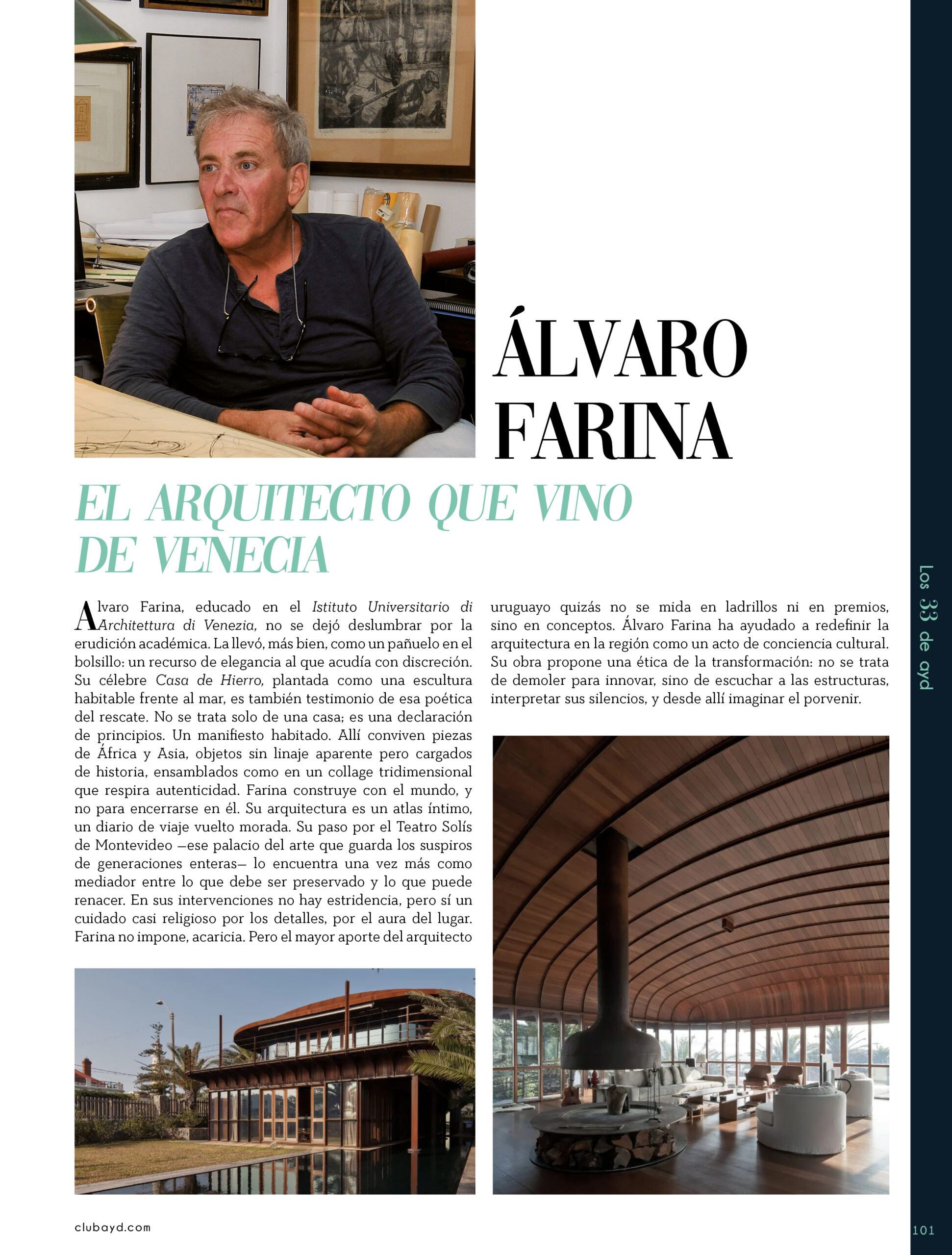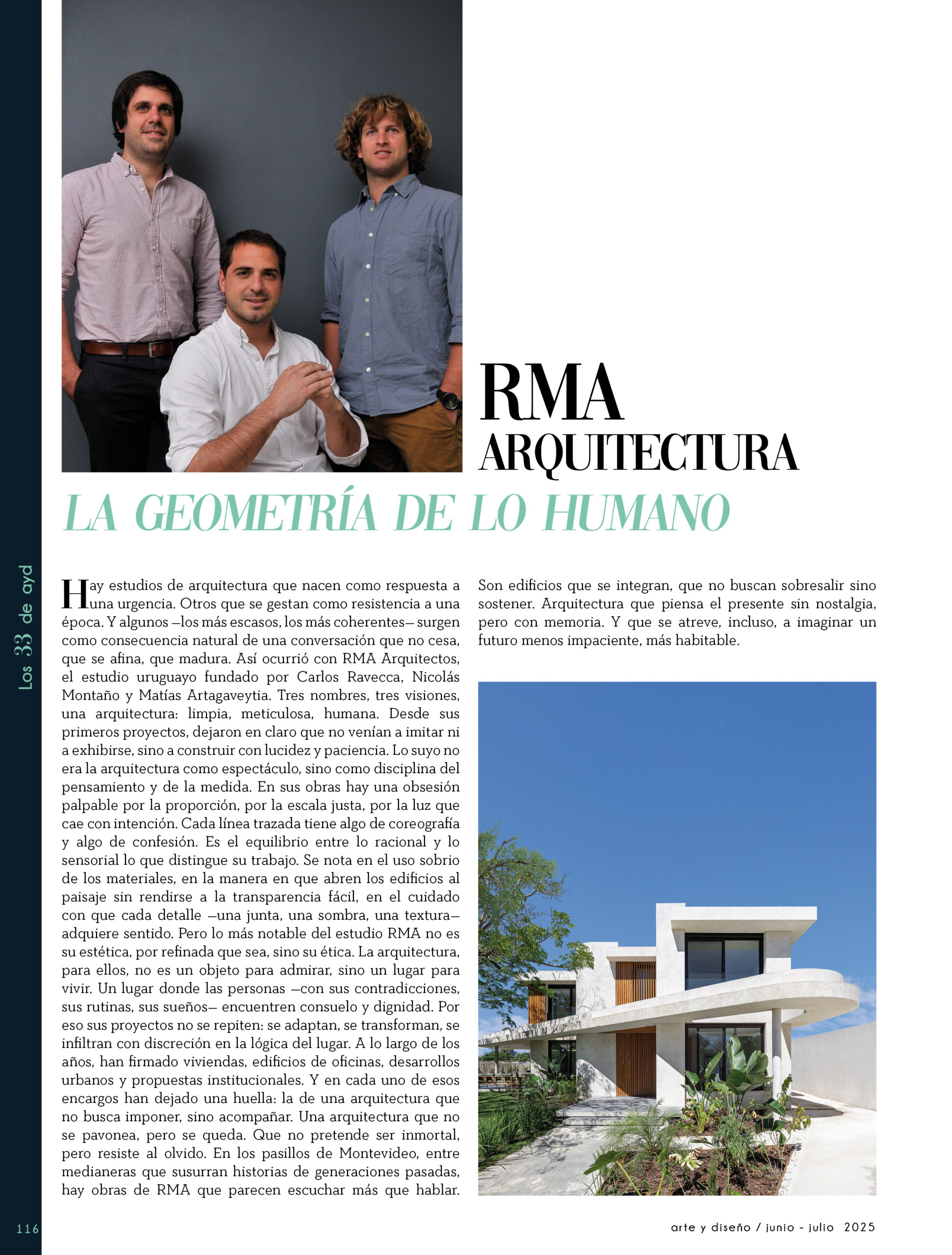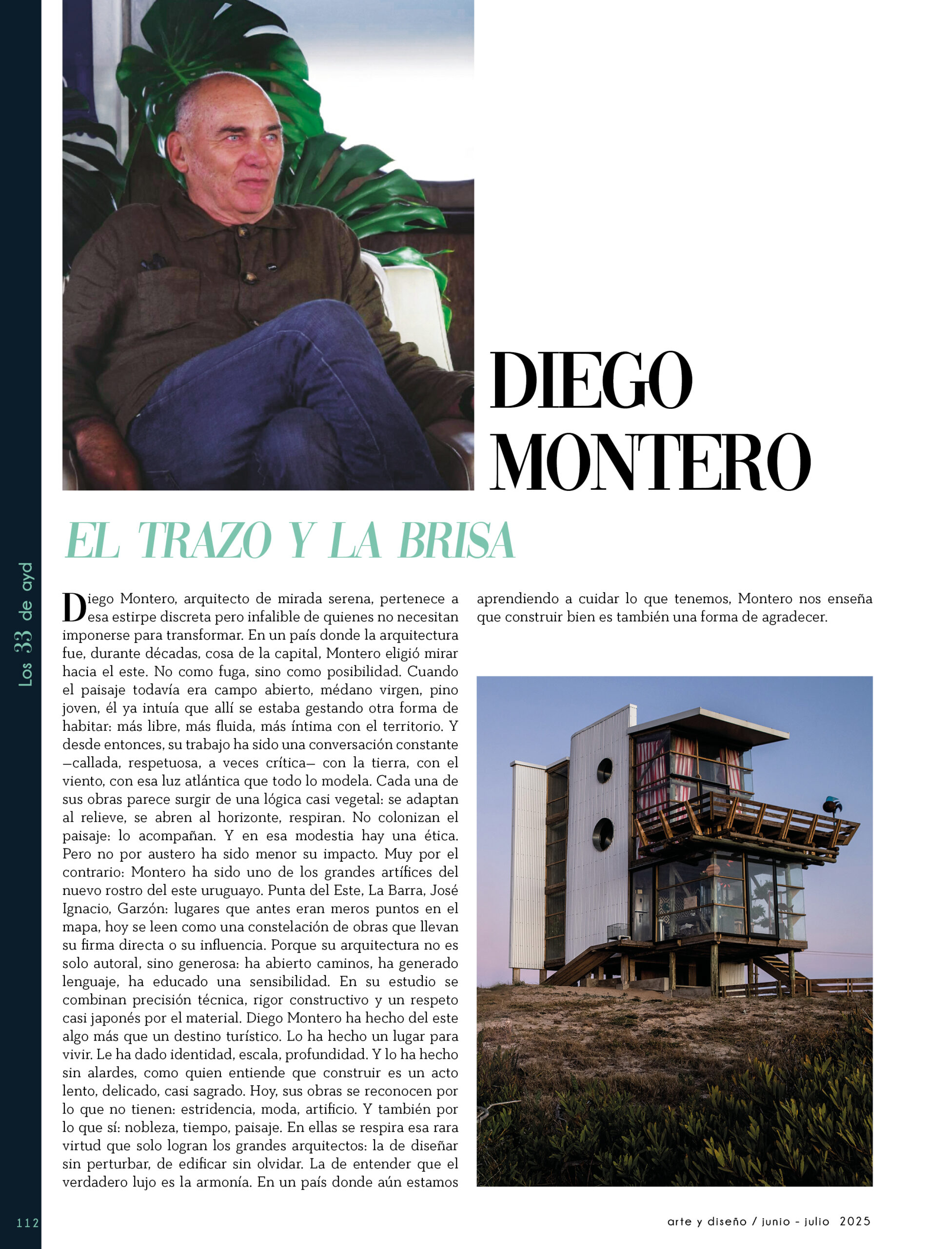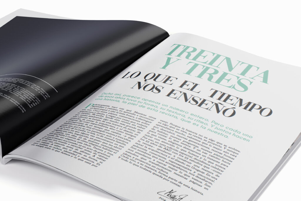 Dicho así, parece apenas un número entero. Pero cada uno de esos años tuvo su forma, su textura, su ritmo. Y juntos hacen una historia, la piel de esta revista, que es la nuestra. Prácticamente nací con ayd. Mientras otros aprendían a caminar, yo aprendía a reconocer un buen papel, a oler la tinta fresca, a distinguir una foto. Crecí entre planos, conversaciones sobre arquitectura y diseño, y viajes por casas que todavía no existían. Mi padre, fundó esta revista sin saber que estaba sembrando algo mucho más grande que una editorial, se trataba de una manera de mirar, de entender, de contar la arquitectura y el diseño en Uruguay. No como espectadores, sino como testigos y protagonistas de un tiempo que cambia —y que también nos define. Hoy, al cumplir treinta y tres años, siento que ayd ya no nos pertenece solo a nosotros. No es solo de mi padre, ni mía, ni de nuestra familia. Es de todos los que alguna vez encontraron en sus páginas una idea, inspiración, un gesto que les abrió un camino, una idea. Es de quienes entendieron que ayd habla y cuenta de cómo elegimos habitar el mundo. Por eso elegimos este título. Treinta y tres. Lo que el tiempo nos enseñó, es un acto de gratitud. El tiempo nos enseñó a escuchar antes de opinar. A mirar con atención antes de afirmar. A editar con respeto. A saber, que el diseño es forma, sí, pero también es cultura, identidad y memoria. Es una sinergia entre lo que fuimos y lo que está por venir. Porque la historia no es algo que se archiva: es algo que se vive, se revisa, se proyecta. Y aunque aprendimos mucho, sabemos que lo mejor aún está por descubrir, nuevas generaciones, nuevas formas de habitar, nuevas preguntas, nuevas plataformas para contar lo que vemos. Y en ese camino hacia lo que viene, elegimos detenernos un instante para mirar con atención lo que fuimos y lo que somos.
